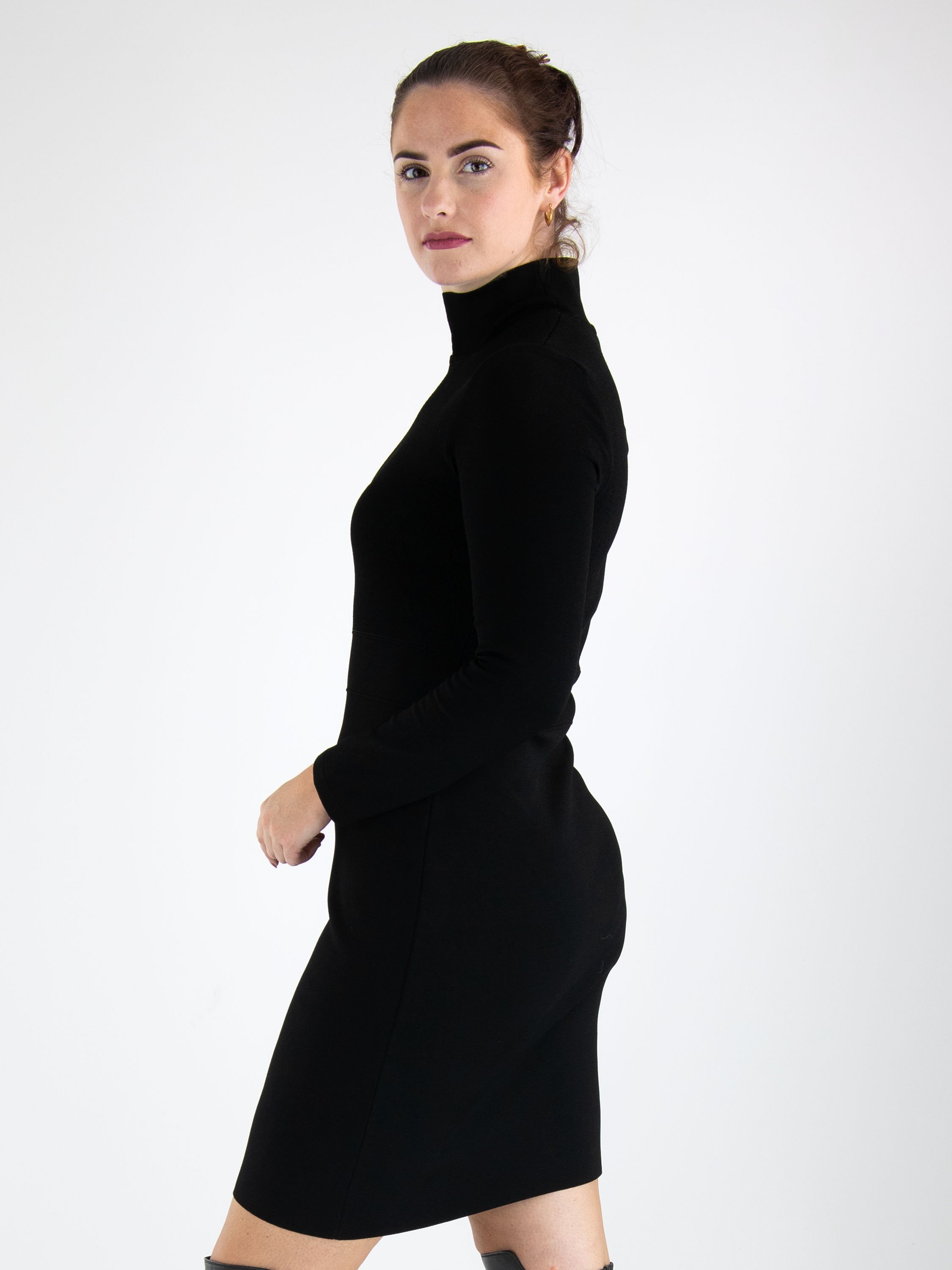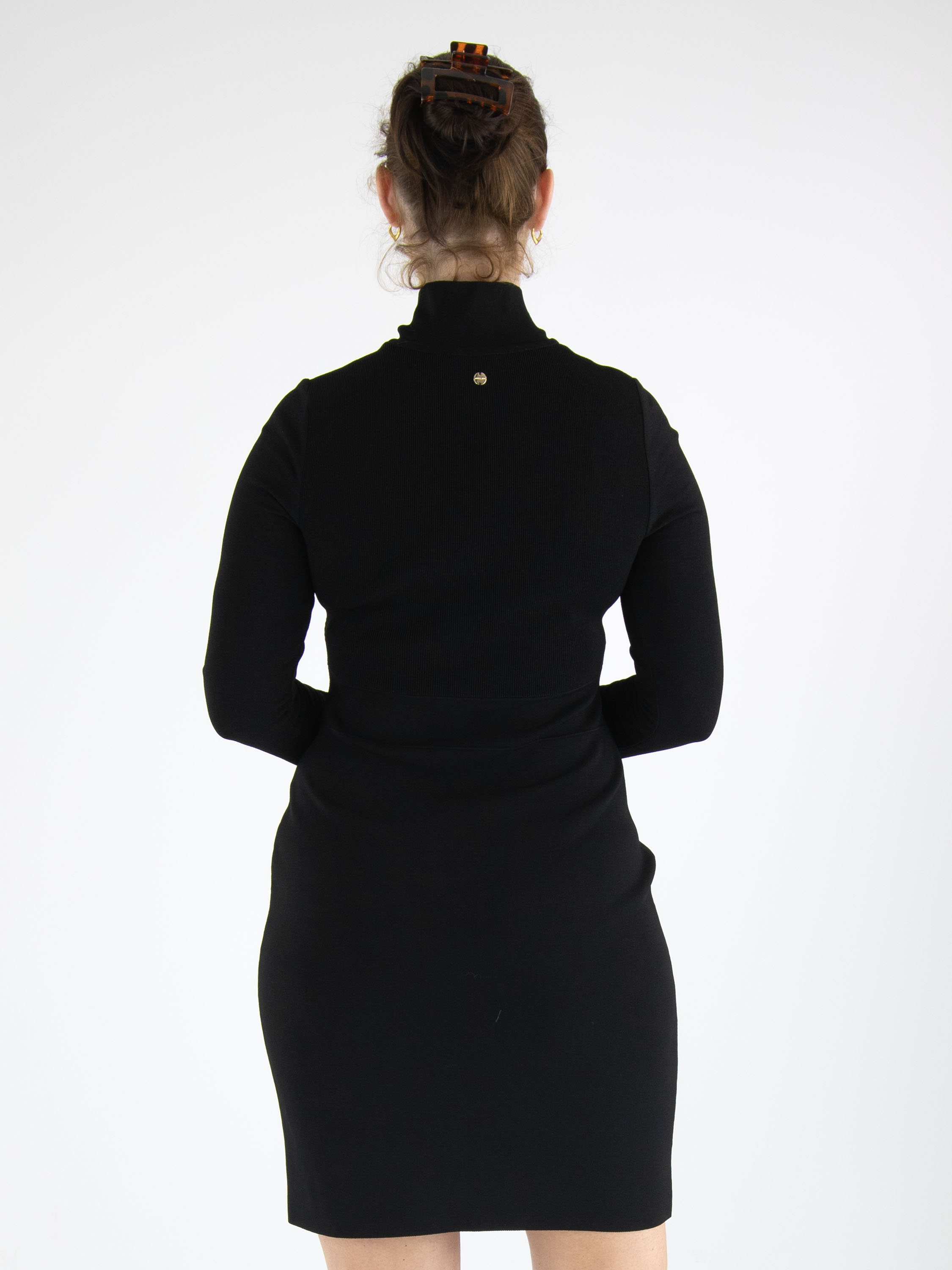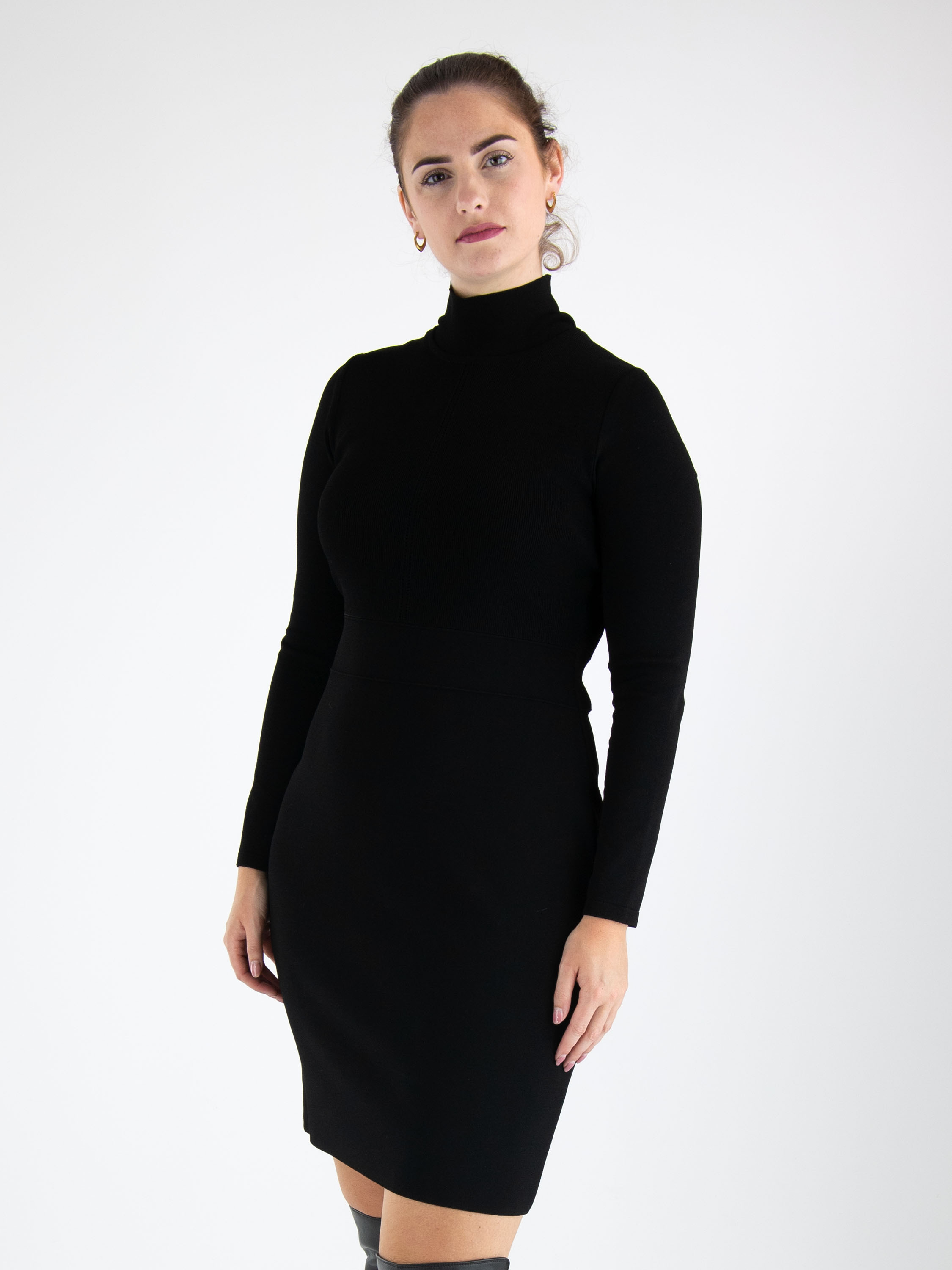 A knitted dress from Marc Cain in a fine ribbed texture in black. The dress features a turtleneck and long sleeves. There are two stitched seams at the waist, below which the fabric is of a uniform quality. This dress can be washed at 30 degrees.