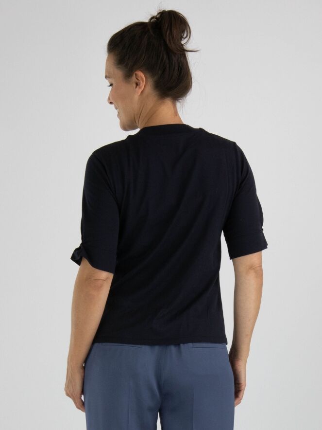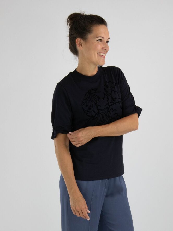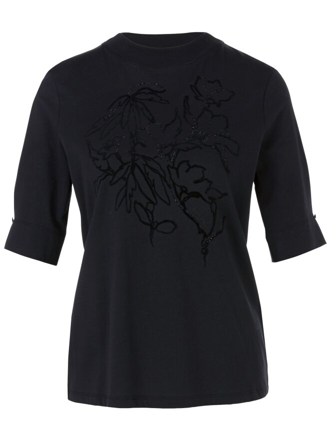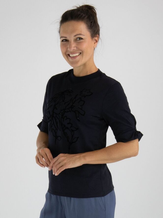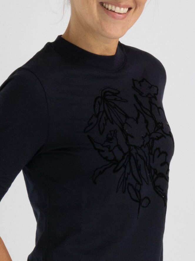 A shirt from Marc Cain in navy blue, featuring a floral design on the front made of velour stripes embellished with rhinestones. The shirt has short sleeves and a high round neckline with a finely ribbed knit trim along the edge. This shirt can be washed at 30 degrees.