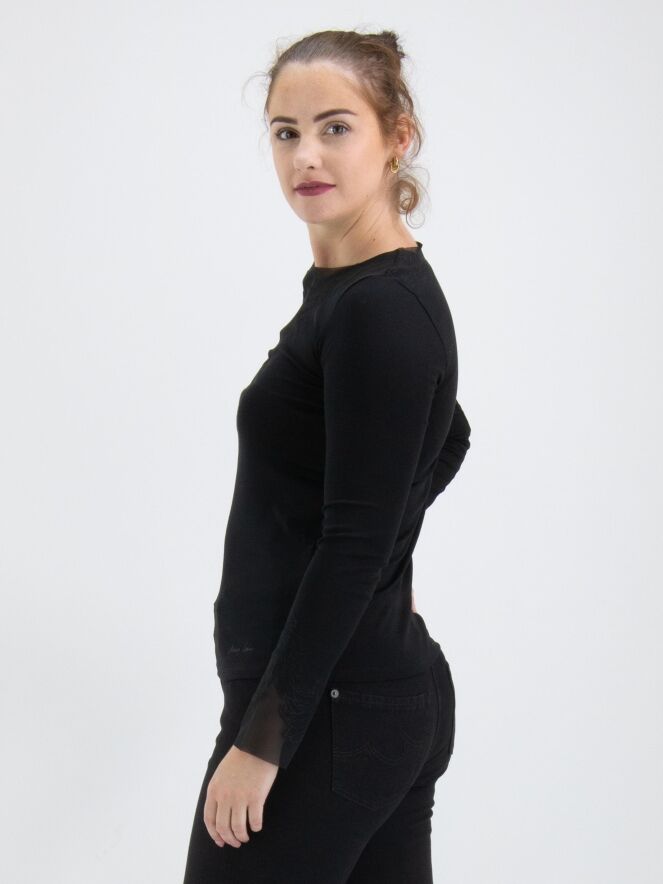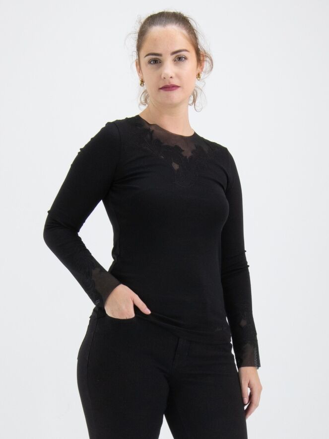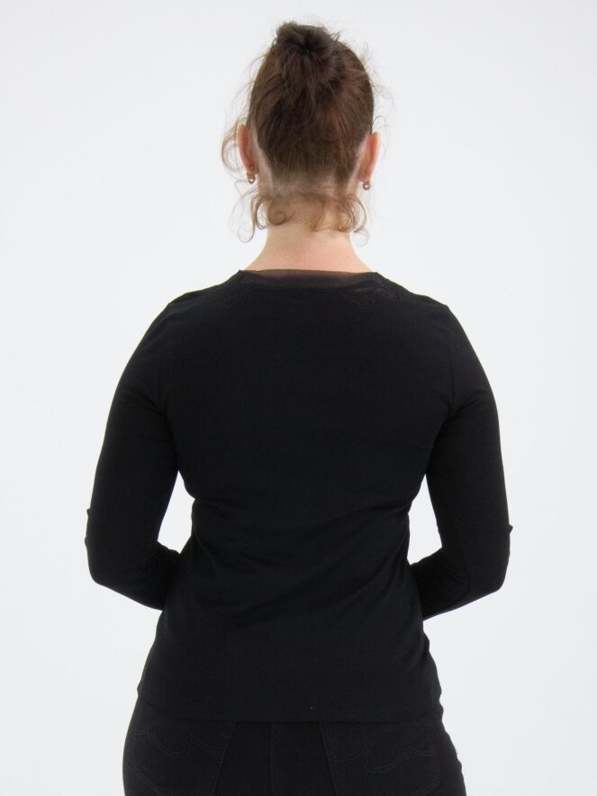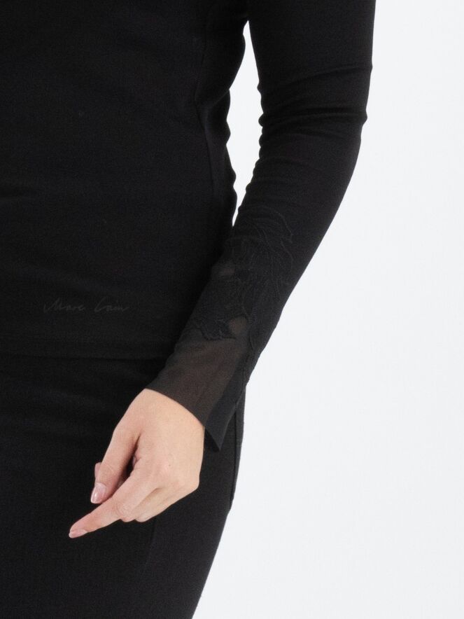 A shirt from Marc Cain in black. Along the edge of the round neckline, there is a voile fabric with a leaf structure that is shaped with trims. This detail is also featured at the ends of the long sleeves. This shirt can be washed at 30 degrees.