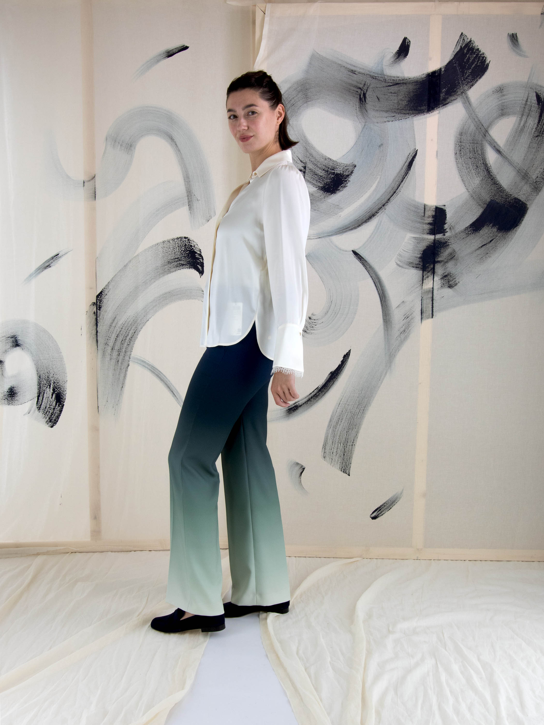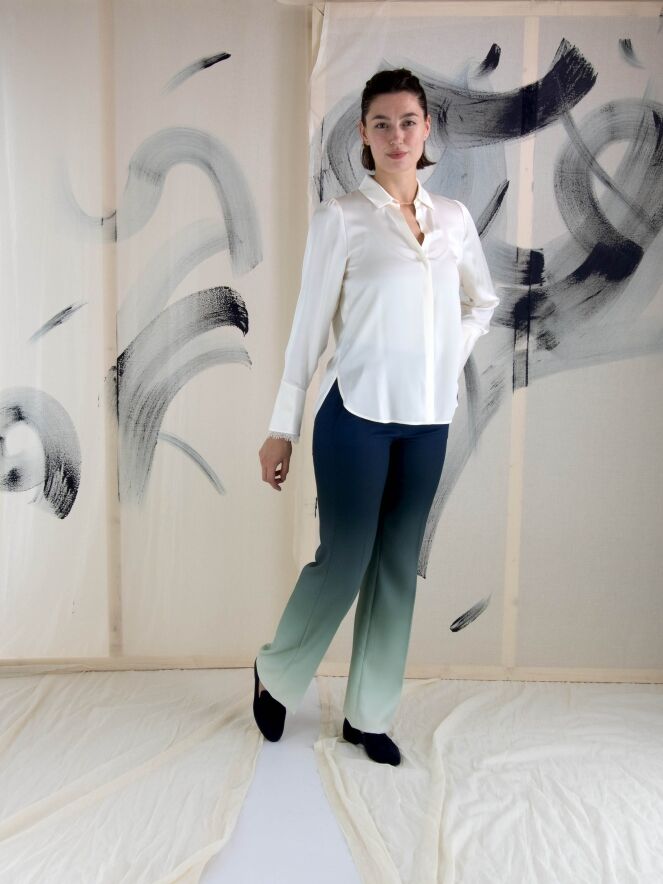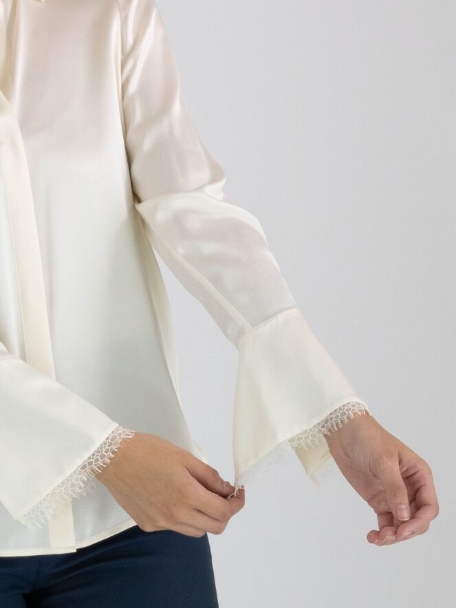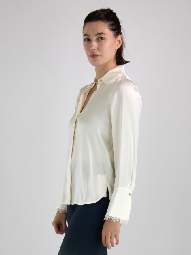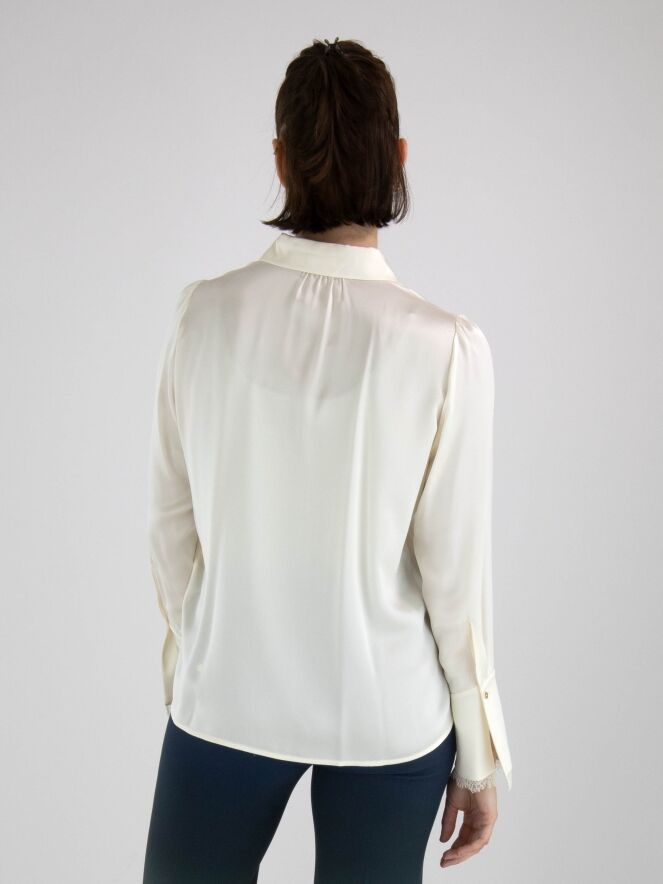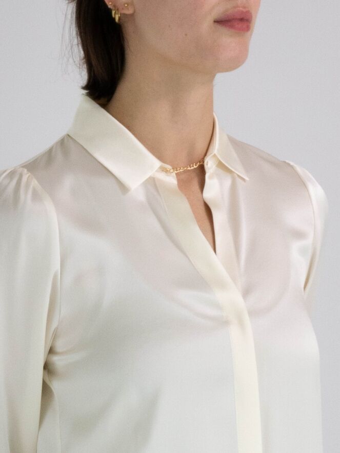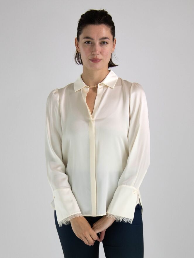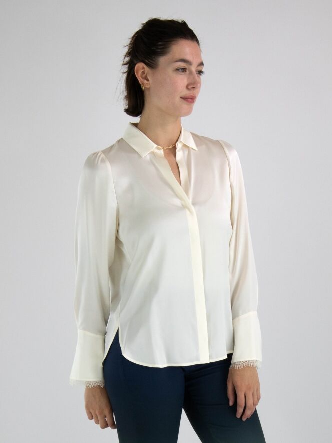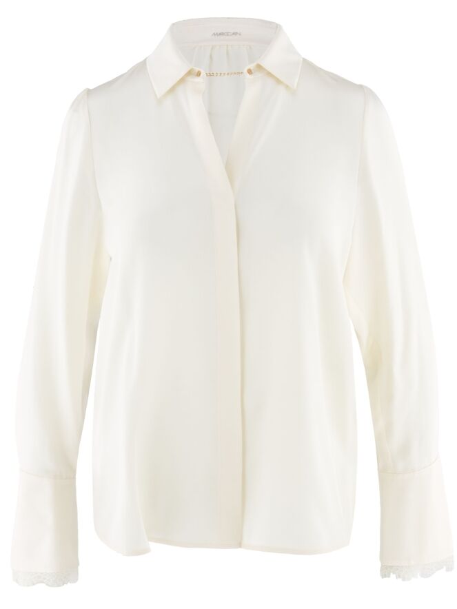 A matt satin blouse from Marc Cain in a creamy white colour. From the centre of the V-neckline, the blouse has a closure in the hem with a rhinestone button with chain. The blouse has a concealed button fastening. The end of the long sleeves have a lace trim along the edge of the cuffs. This blouse may be washed at 30 degrees.