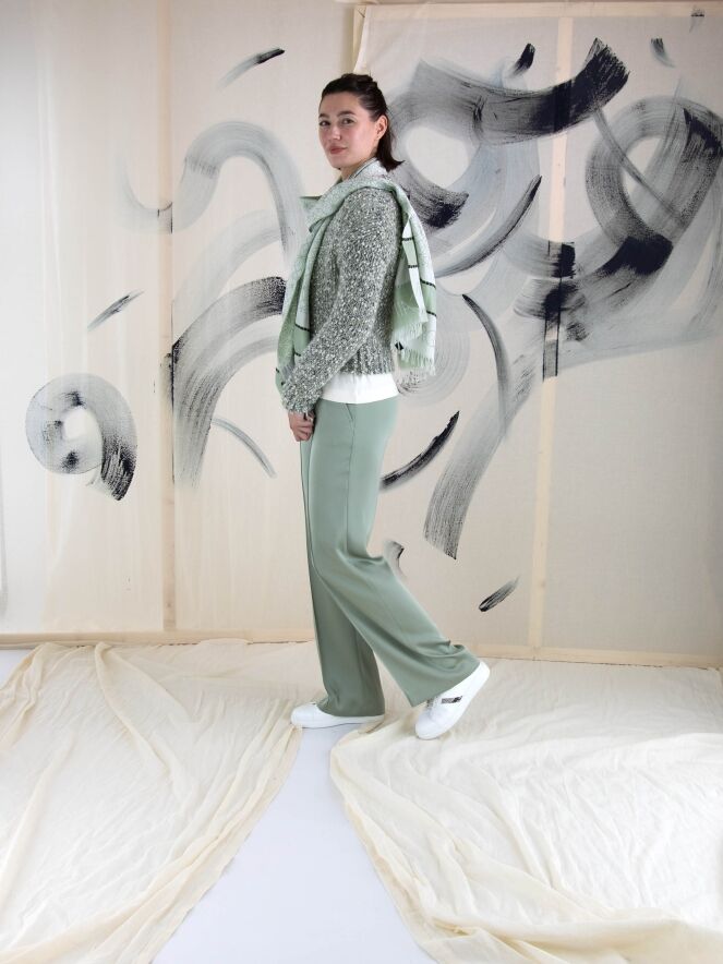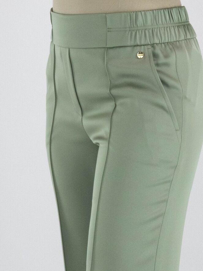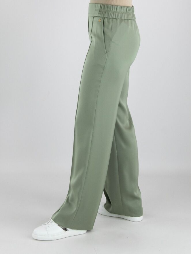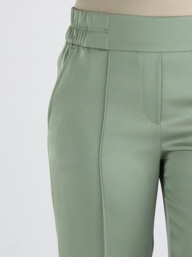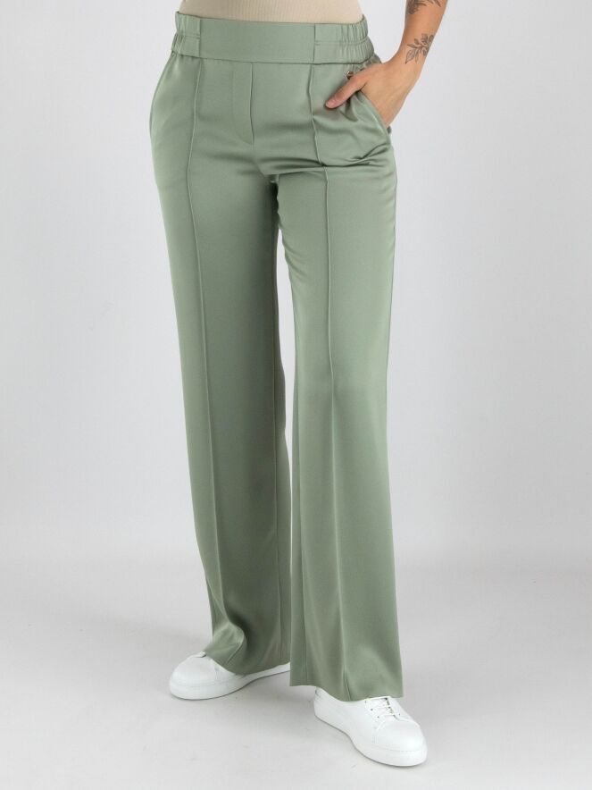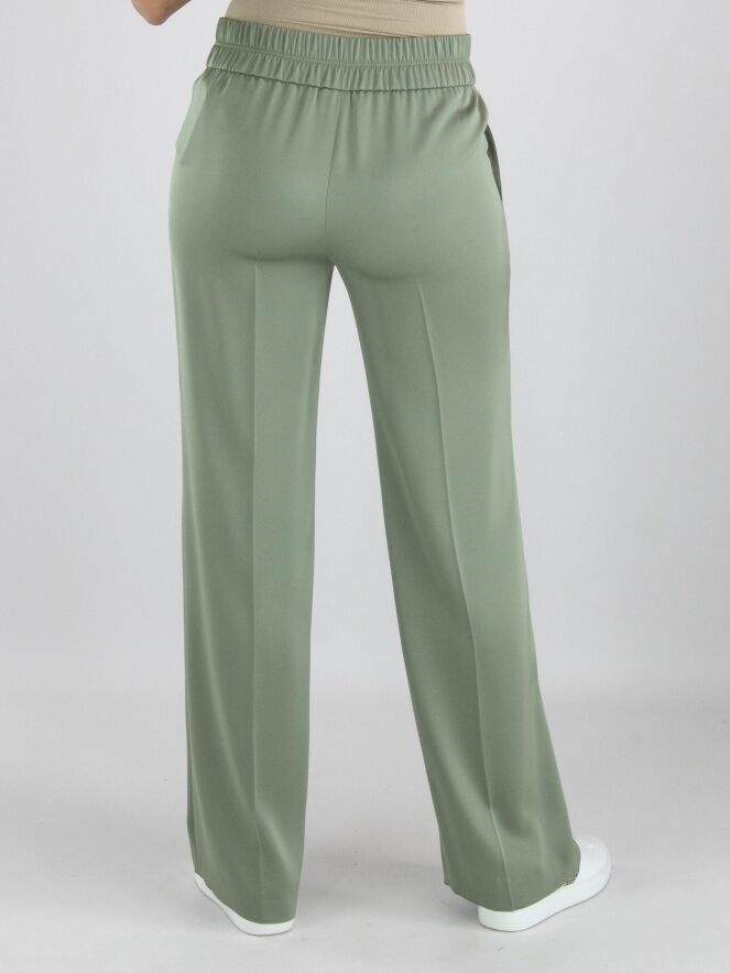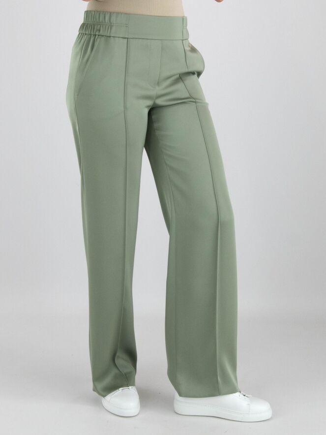 A wide-leg trousers from Marc Cain in a pastel olive green color. The waist features a finely pleated elastic band extending from the sides to the back. There is a seam down the center of the legs. The trousers have side pockets and can be washed at 30 degrees.