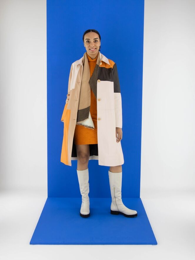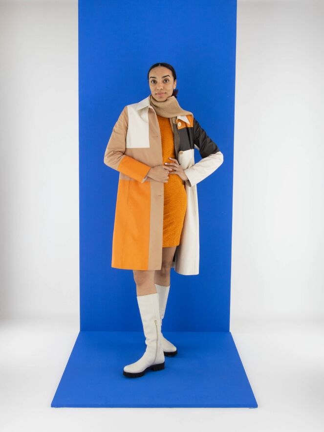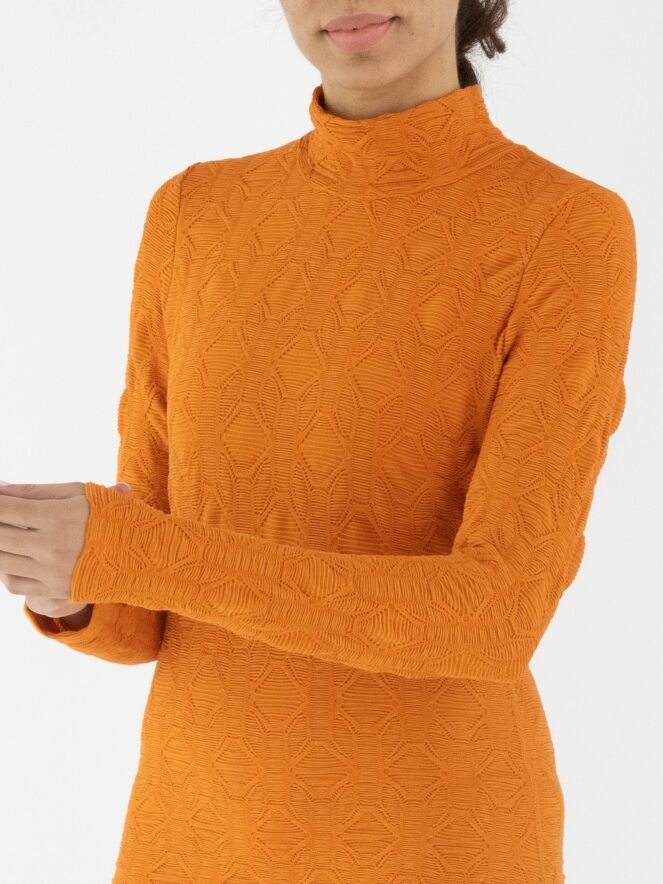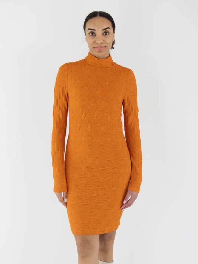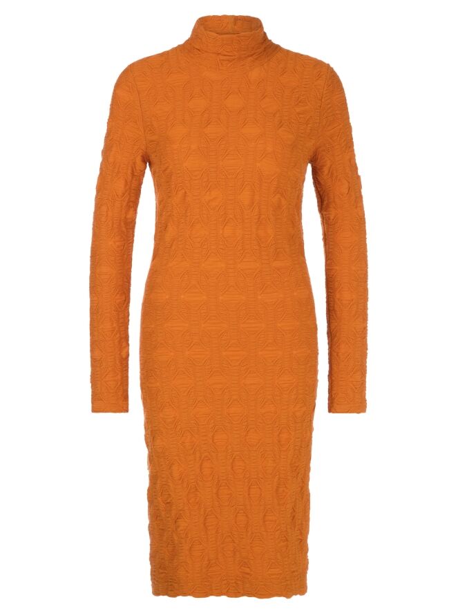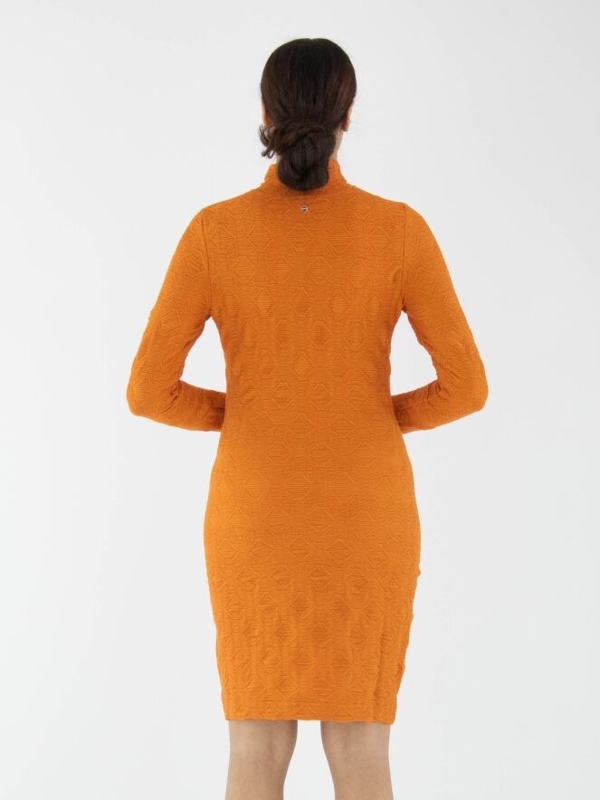 A dress by Marc Cain in orange. The fabric is slightly fitted and features a smocked texture. The dress has a turtleneck and long sleeves and can be washed at 30 degrees.