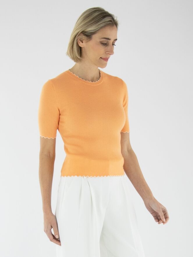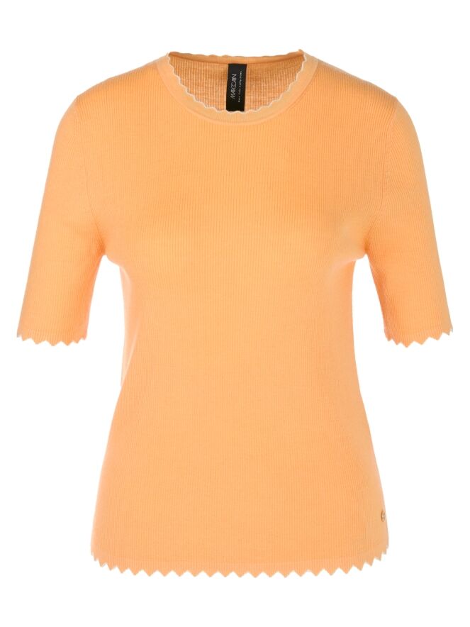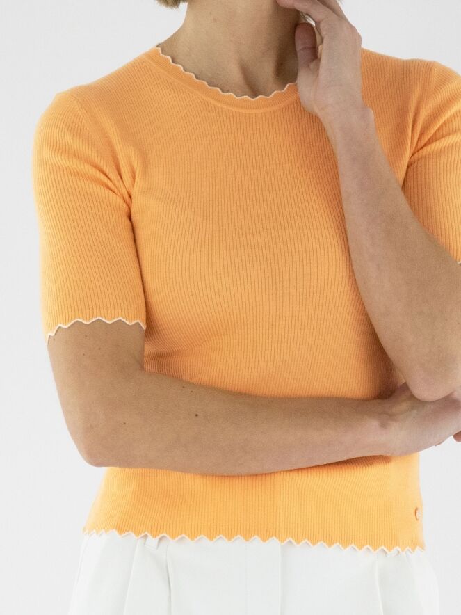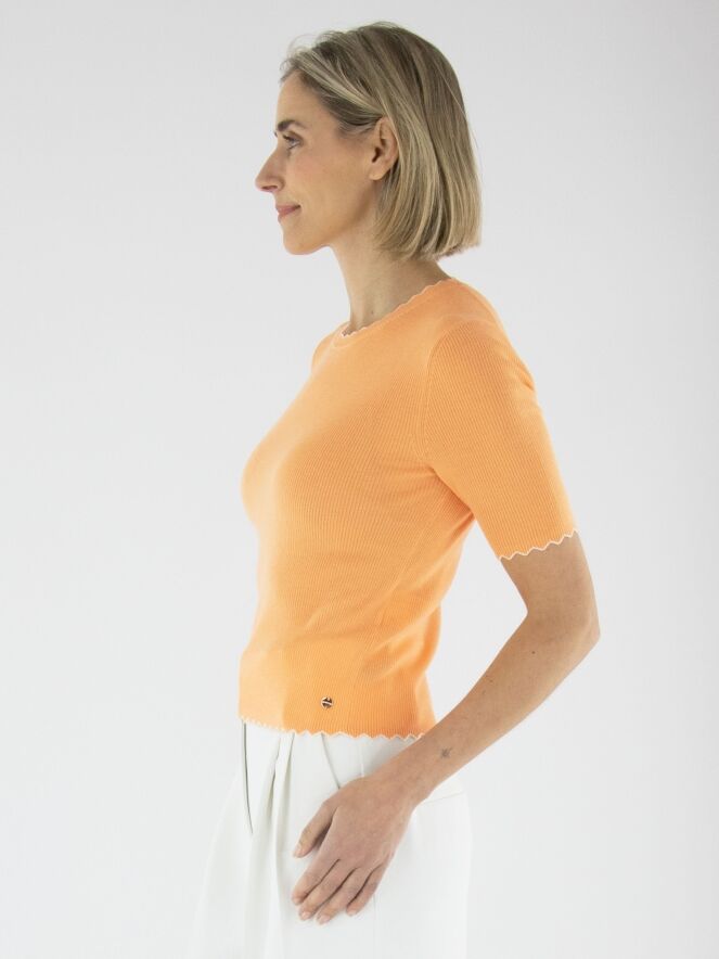 A shirt by Marc Cain in orange. The fabric is finely ribbed. The edges of the round neckline, short sleeves, and hem feature a wavy pattern with a white trim. This shirt should be hand-washed.
