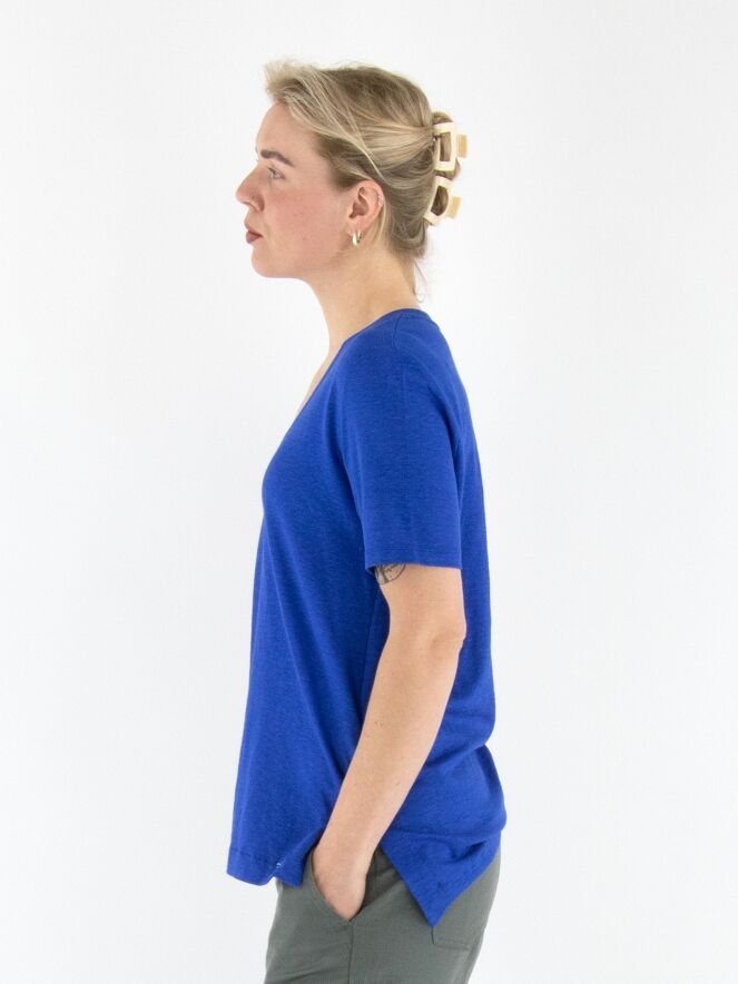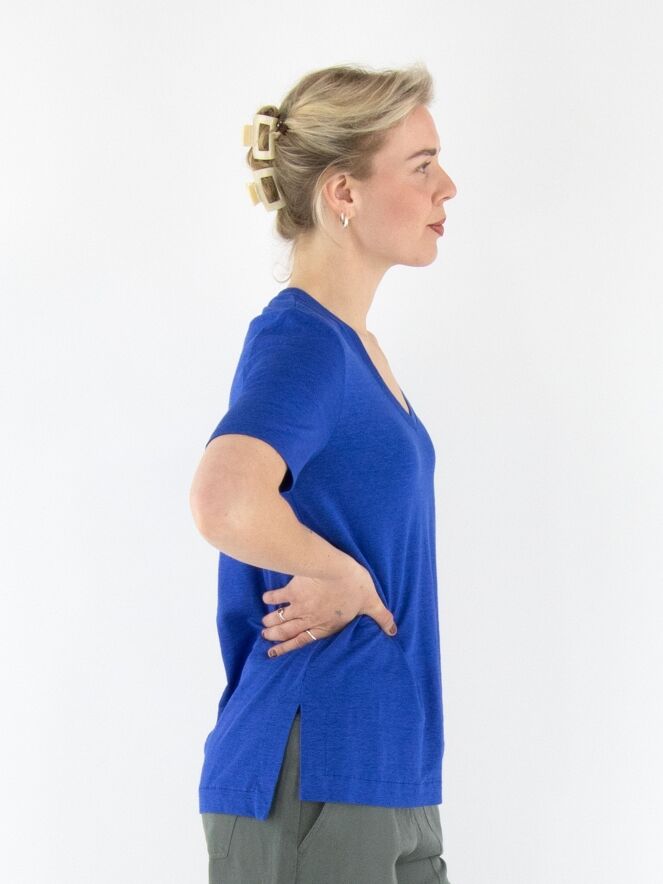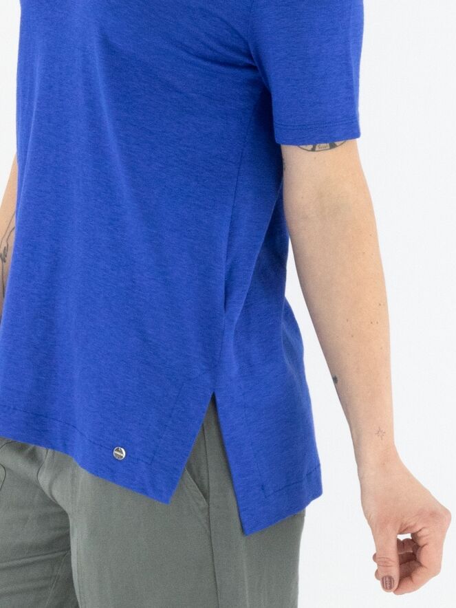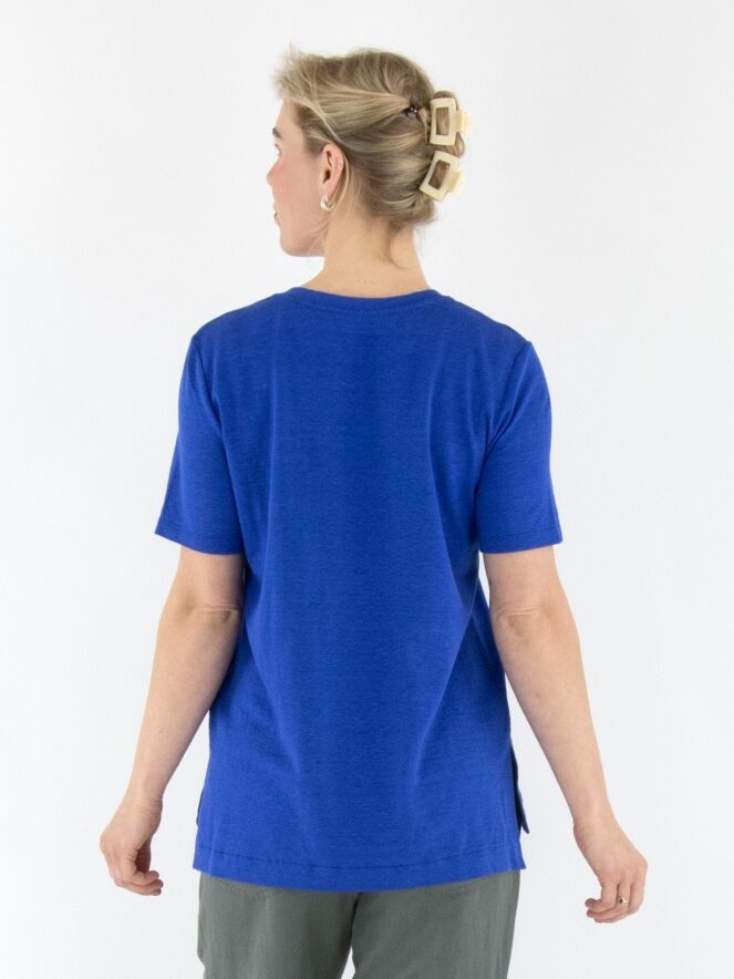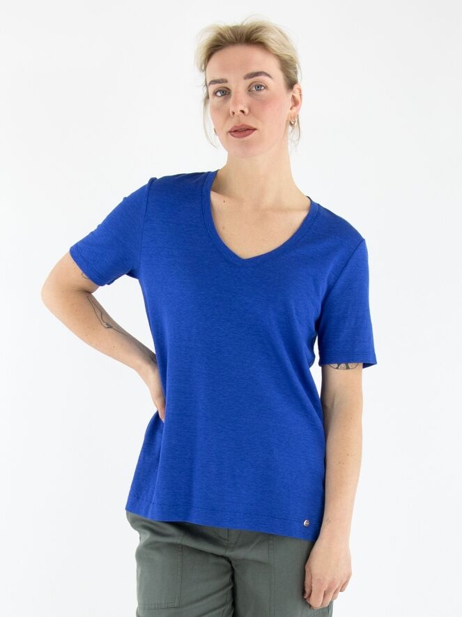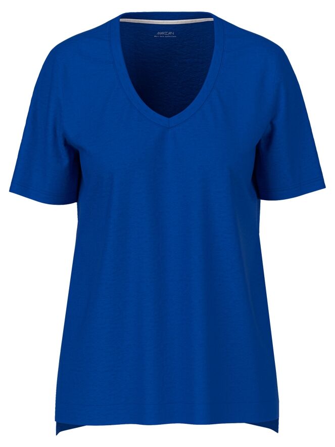 A shirt from Marc Cain in cobalt blue. The shirt features a V-neckline and has a short slit on both sides at the bottom. This shirt can be washed at 30 degrees.