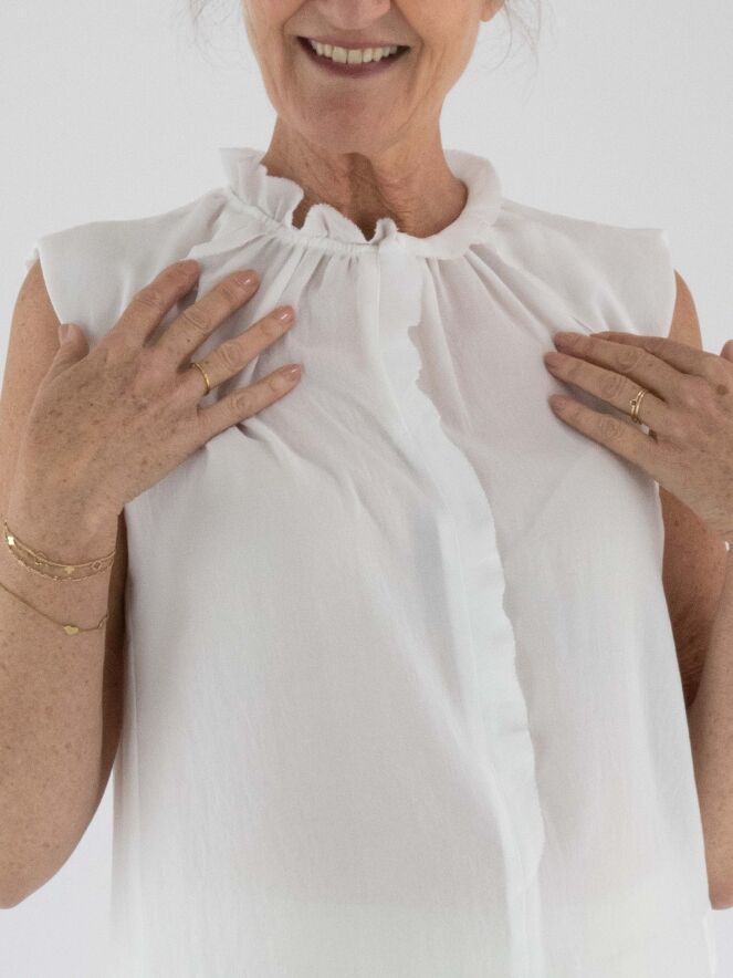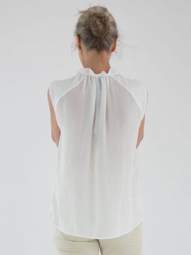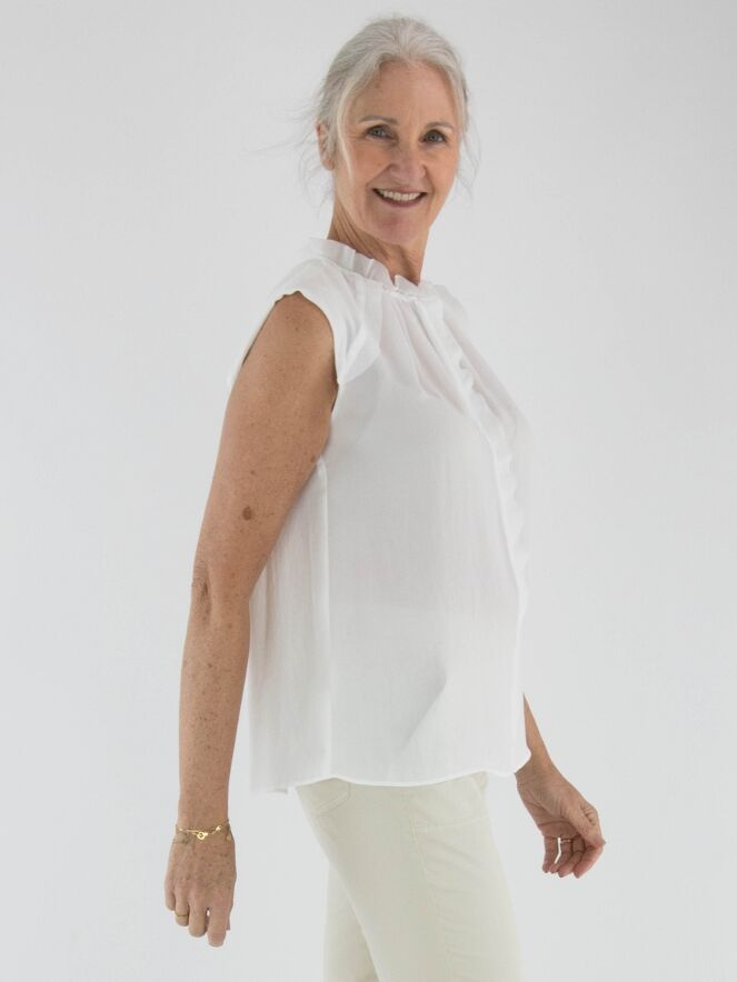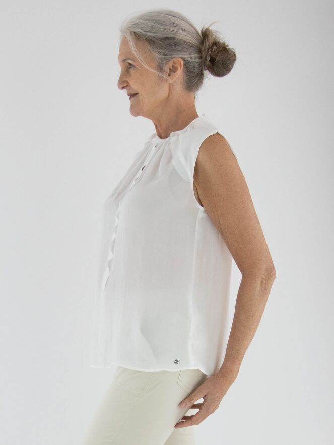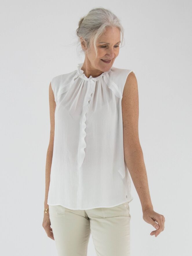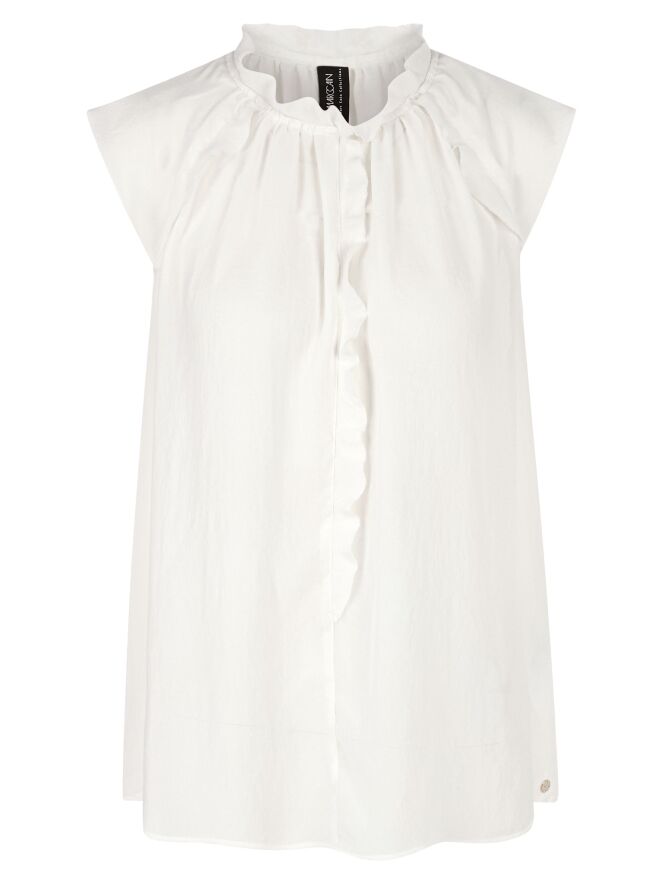 A lightly transparent top from Marc Cain in white. A voile trim runs along the edge of the round neckline and the shoulder seams. At the center front, a voile ruffle cascades from the neckline. The top has a subtle A-line silhouette and can be washed at 30 degrees.