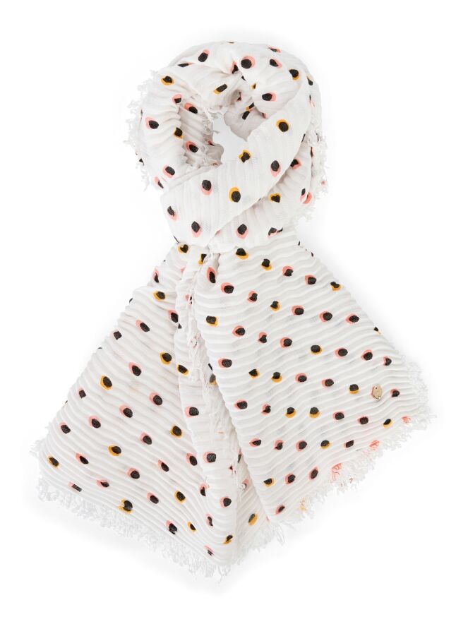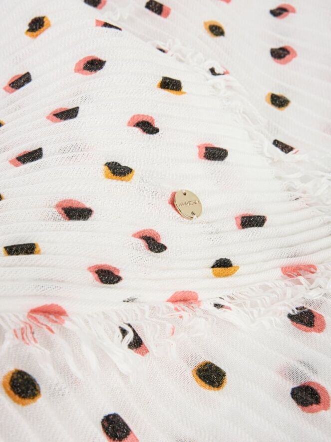 A ribbed shawl by Marc Cain with a print of black dots and an orange or salmon pink border. The fabric is finely pleated. The edges of the shawl are finished with short fringes. This shawl should be hand-washed.