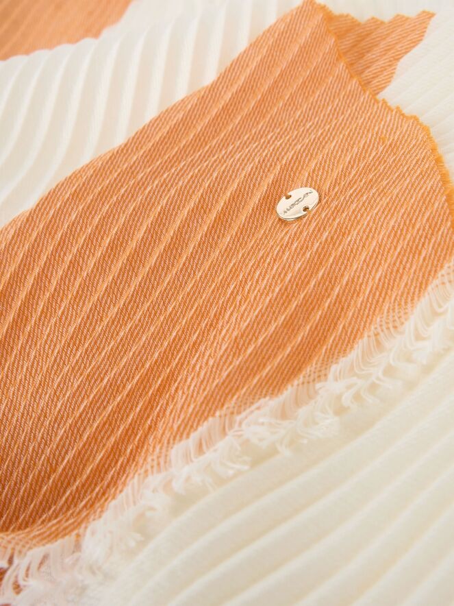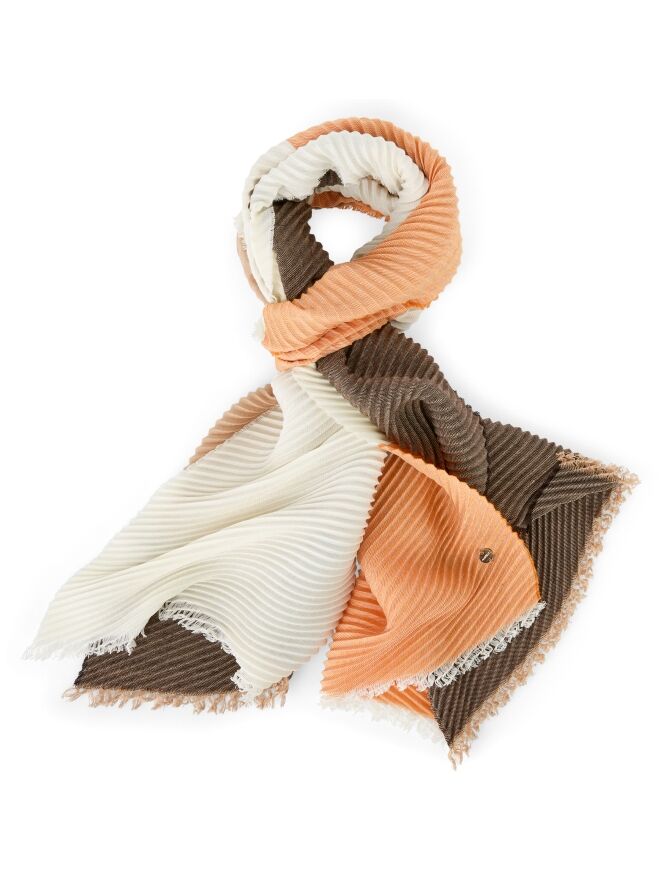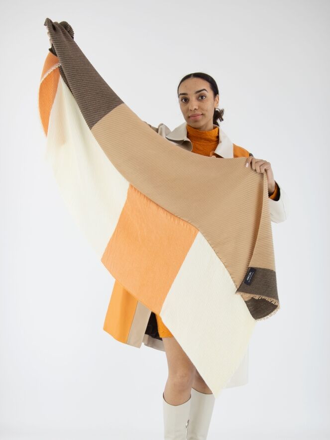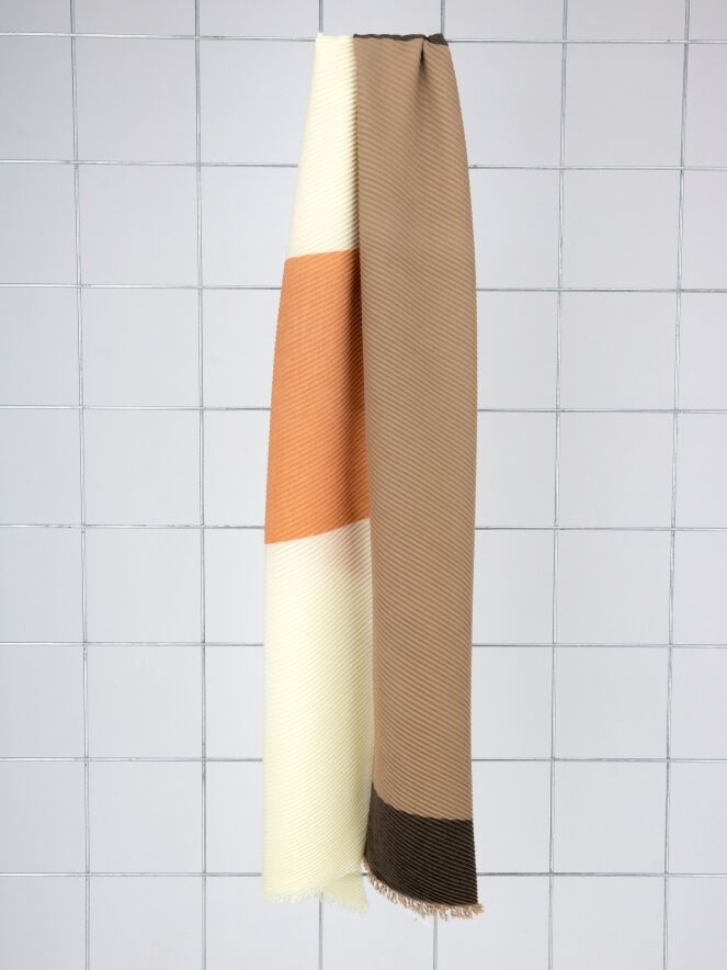 A ribbed Marc Cain shawl with multiple color blocks in various shades of brown. The ends of the shawl are delicately frayed. This shawl should be hand-washed.