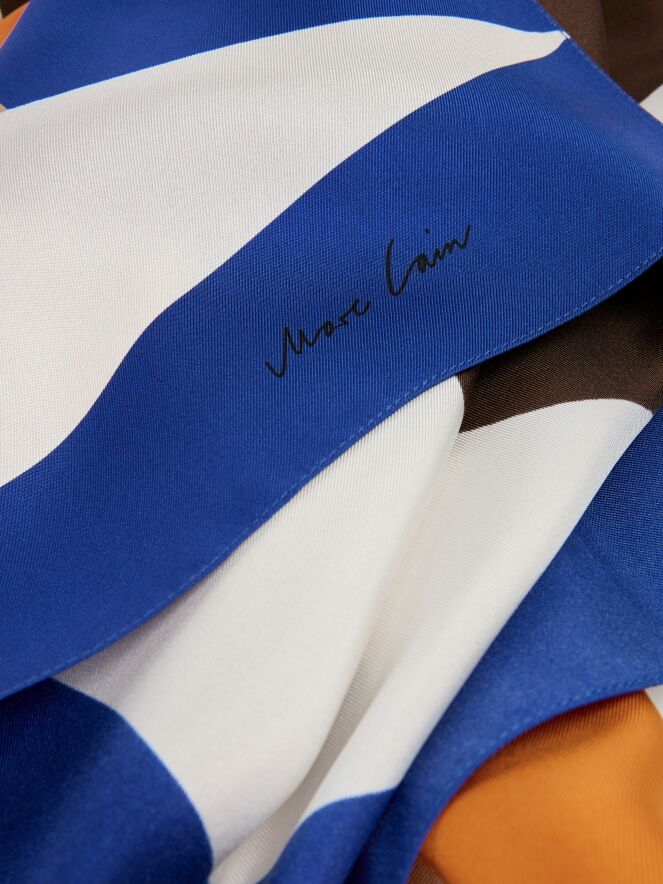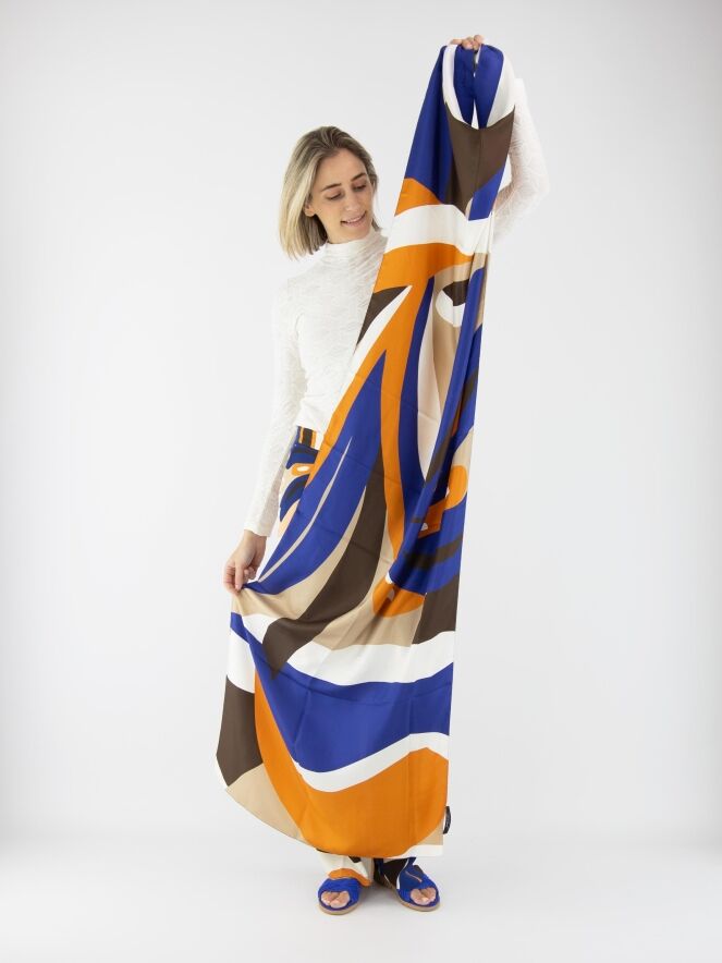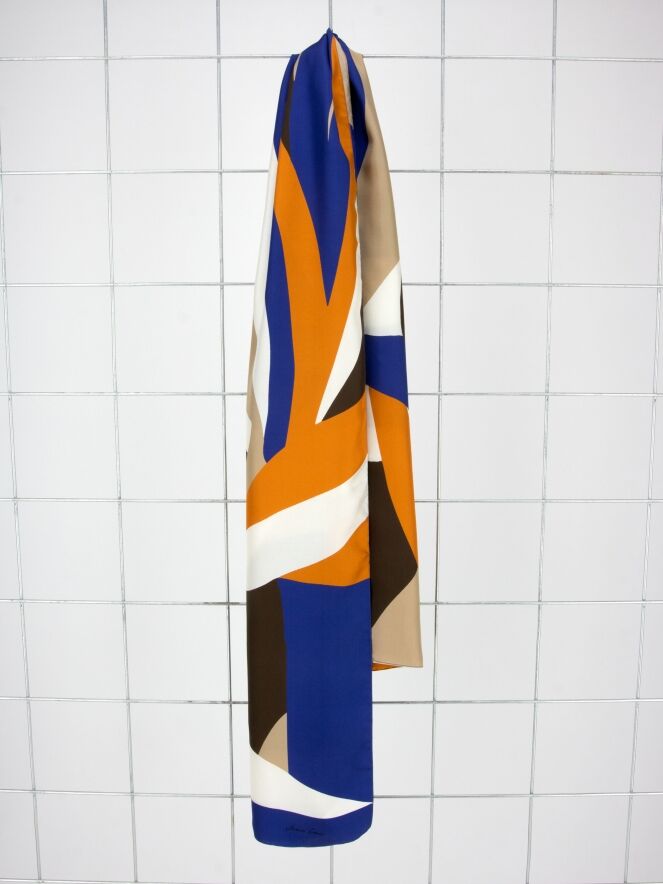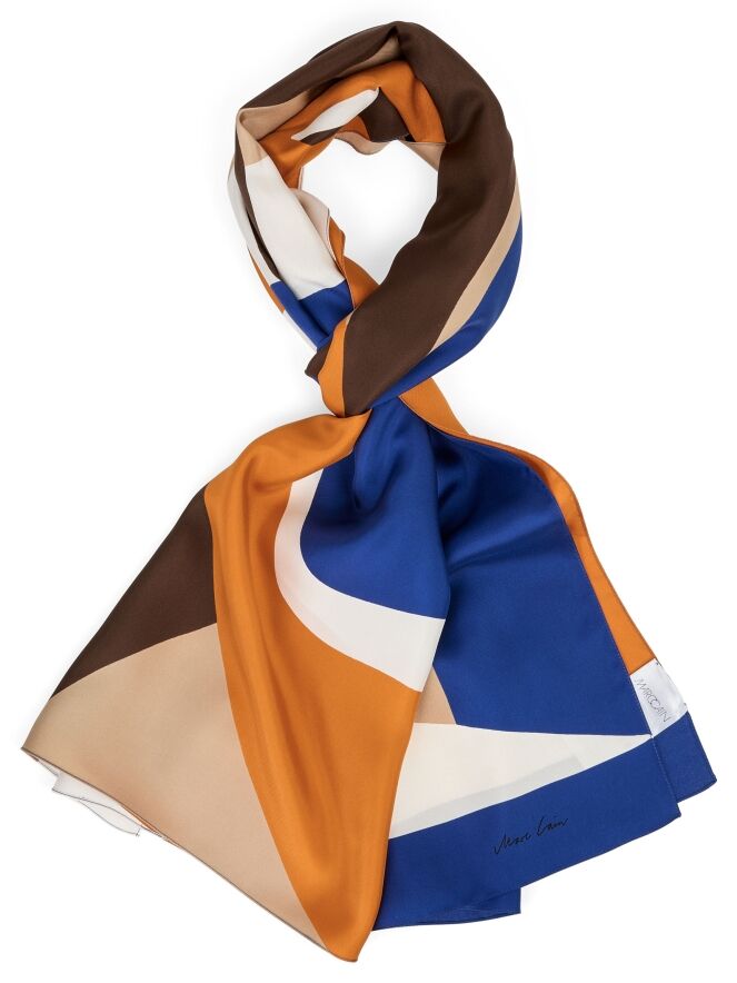 A Marc Cain shawl with a graphic print in orange, cobalt blue, off-white, camel, and mocha brown. This shawl should be hand-washed.