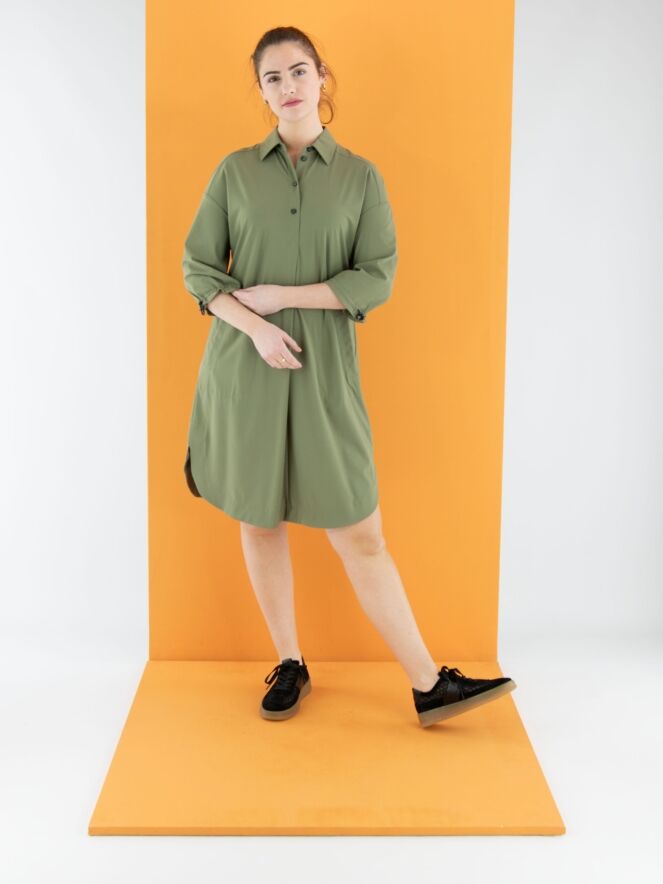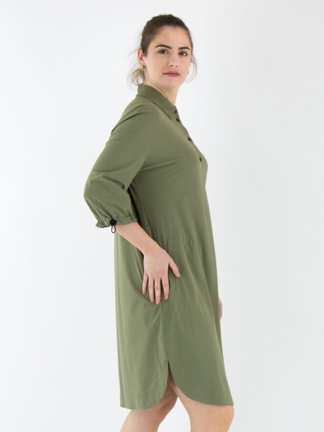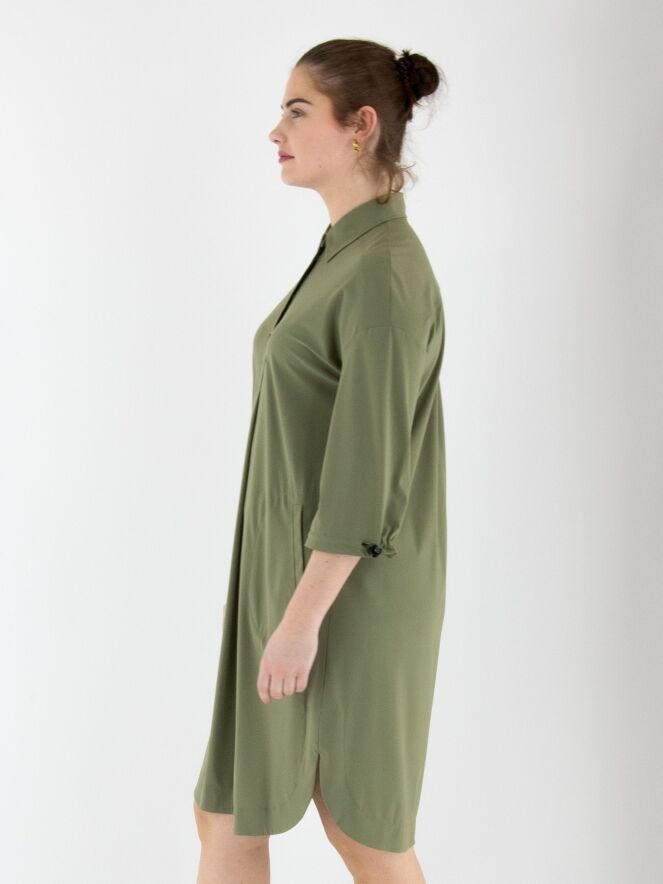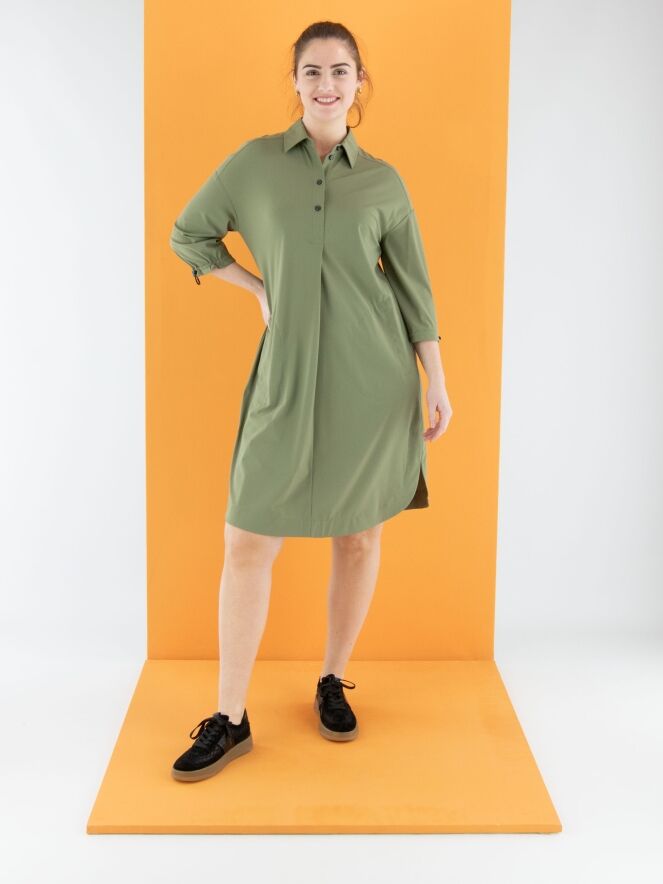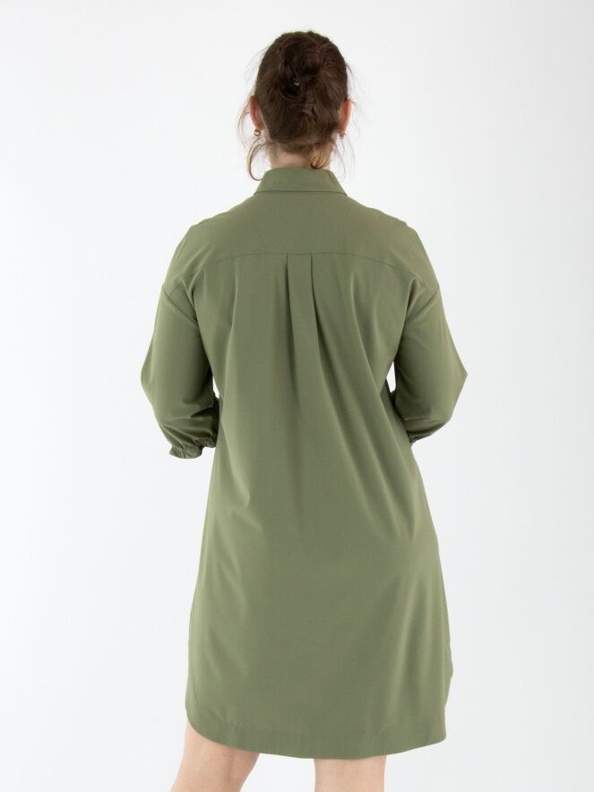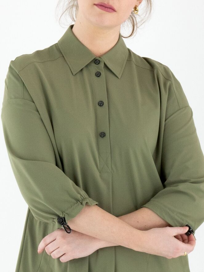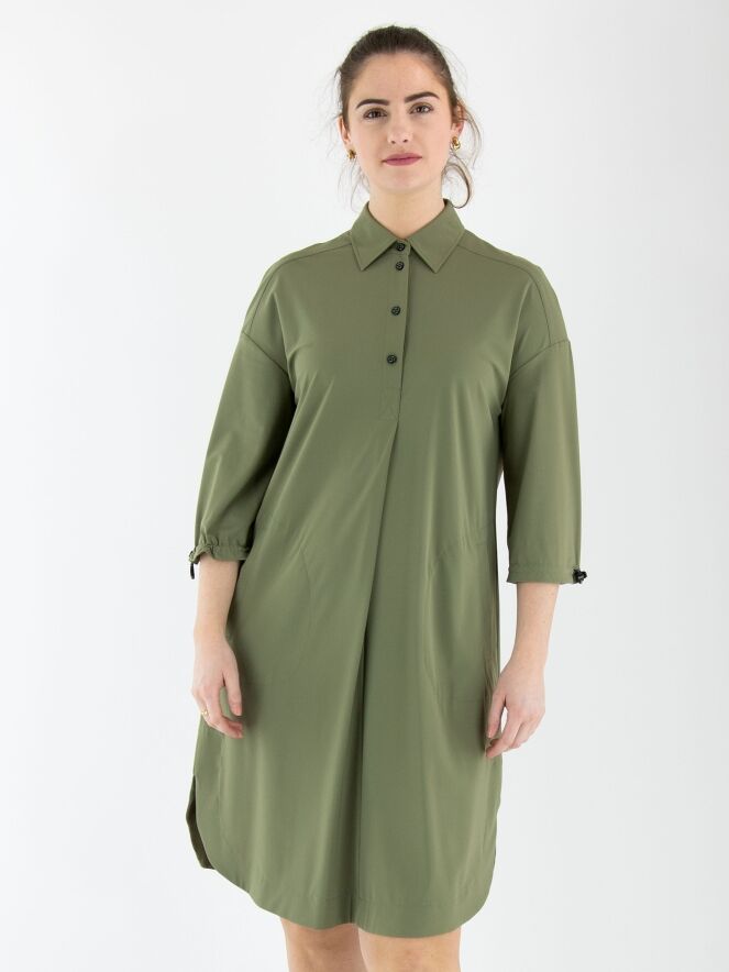 A dress by Marc Cain in olive green. A central pleat runs from the button closure down to just below the bust. Side pockets are positioned at the waist. The hemline is rounded. At the back, two pleats extend from the seam at shoulder blade height. The cuffs of the long sleeves feature an elastic drawstring in a tunnel finish, allowing for a gathered effect. This dress can be washed at 30 degrees.