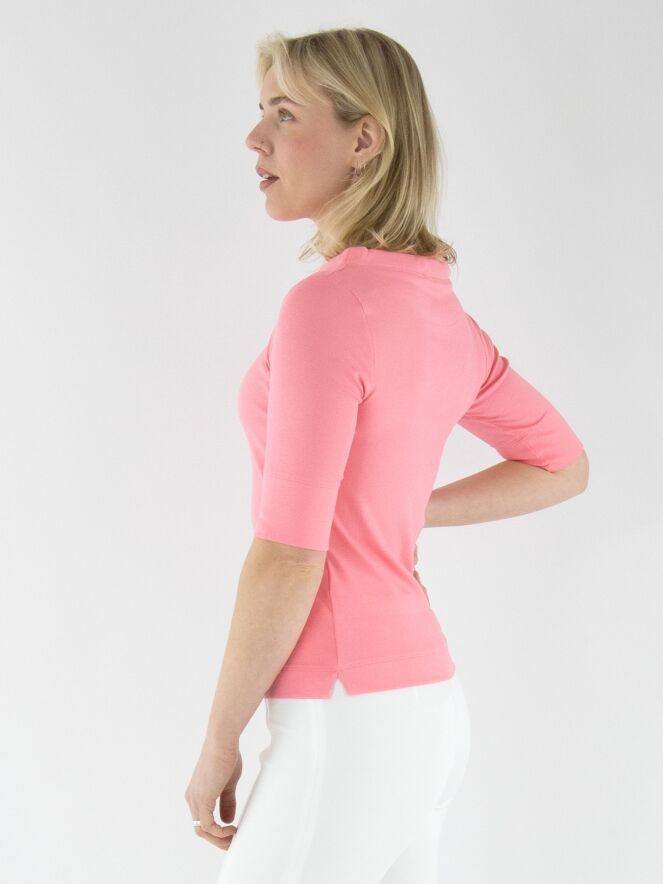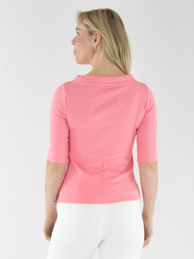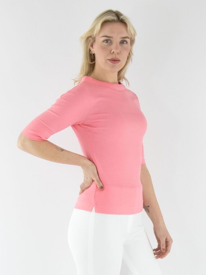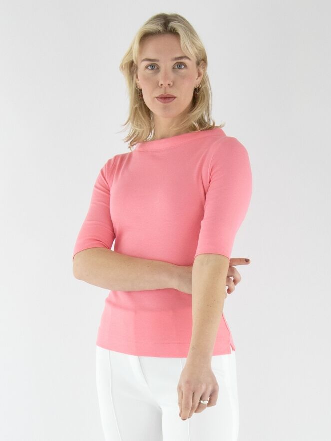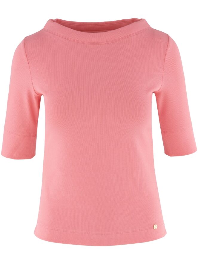 A shirt by Marc Cain in salmon pink. The shirt features a finely ribbed texture, short sleeves, and a wide round neckline. This shirt can be washed at 30 degrees.