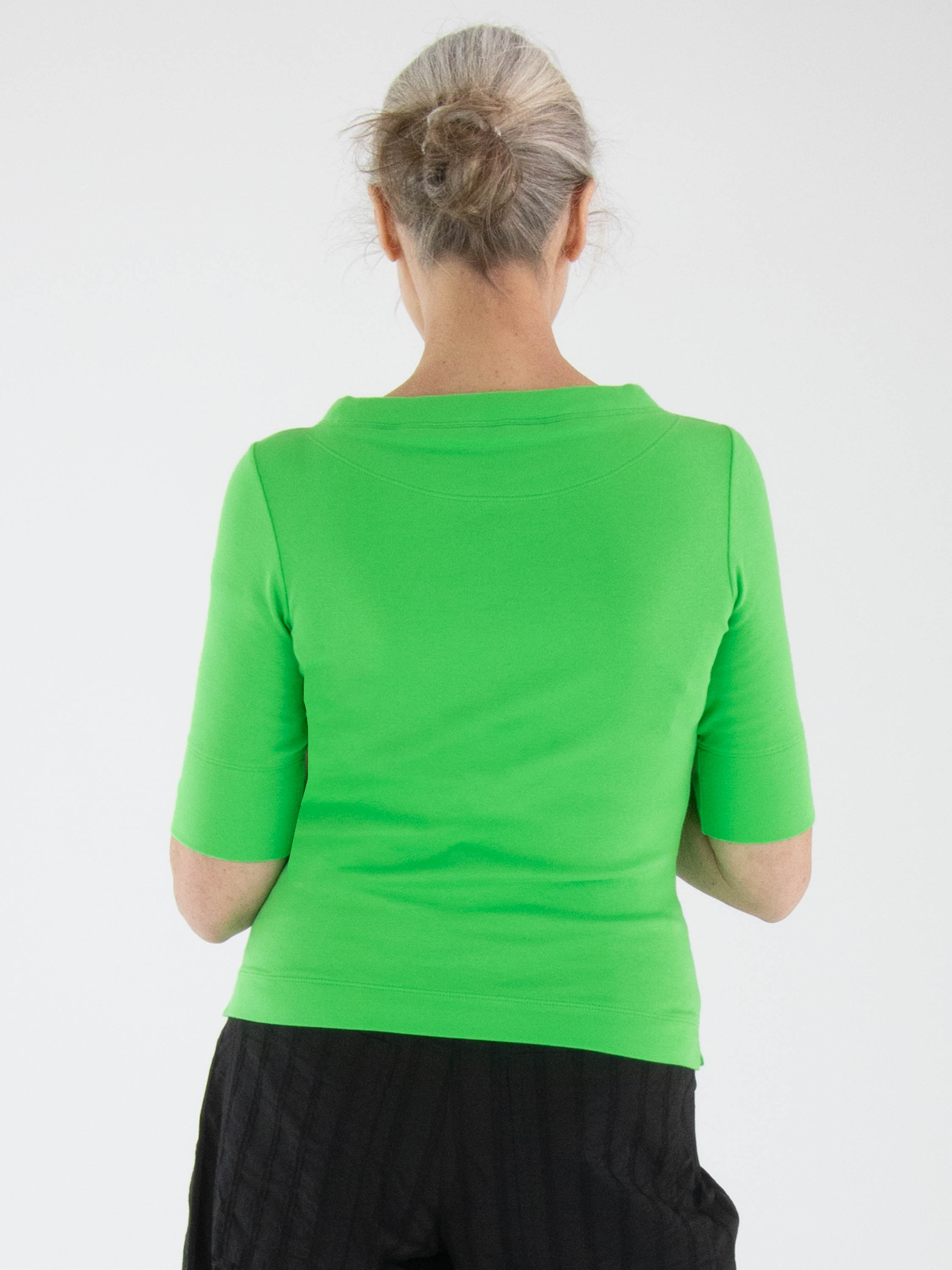 A Marc Cain shirt in green. The shirt features a spacious round neckline with a ribbed tricot trim. The fabric of the shirt is finely ribbed. This shirt can be washed at 30 degrees.