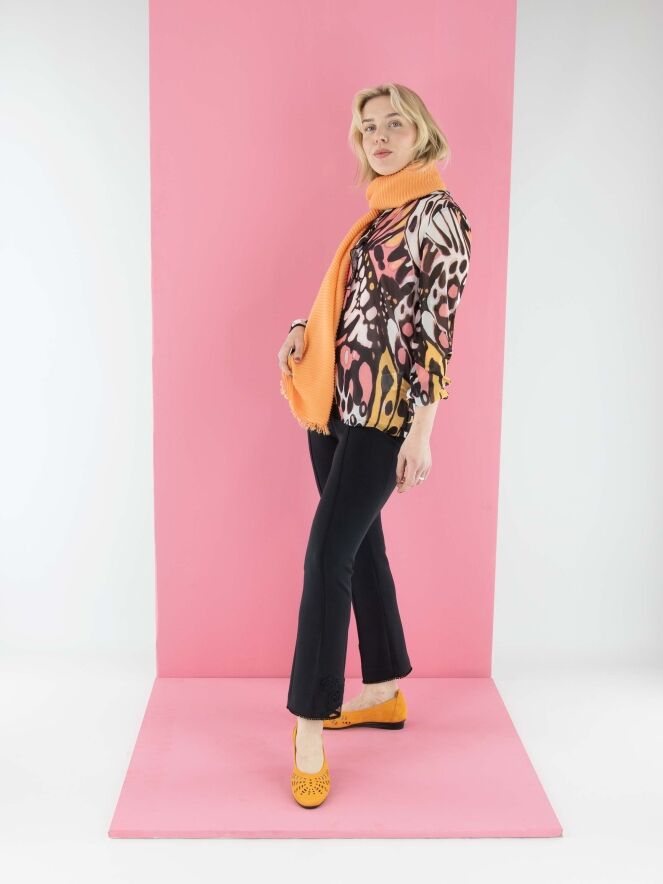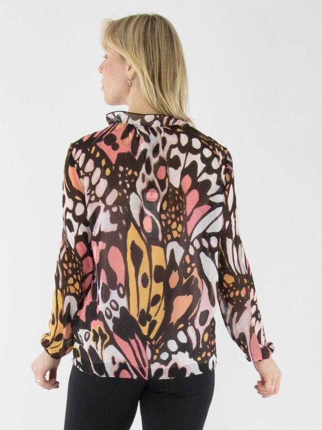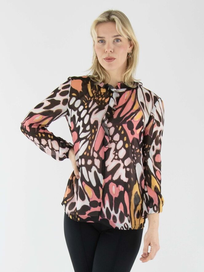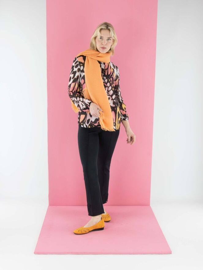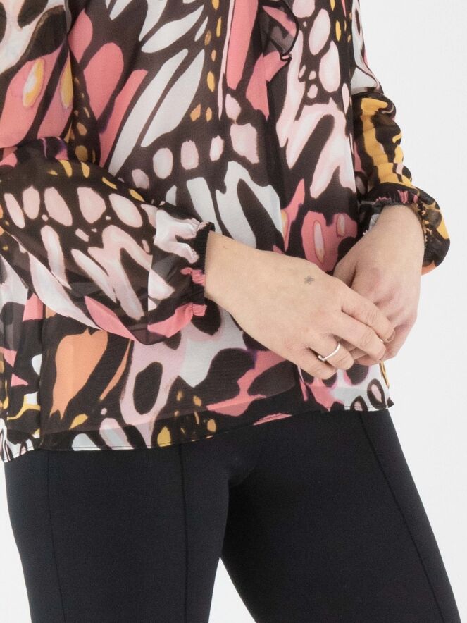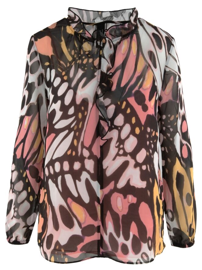 A semi-transparent blouse by Marc Cain featuring a graphic flower-power print in orange, salmon pink, black, and off-white. The round neckline is adorned with a finely pleated transparent trim, which continues as a flounce down the center front to the bust. The finely pleated cuffs of the long sleeves incorporate an elastic cord. The blouse includes a solid salmon pink underlayer. This blouse can be washed at 30 degrees.