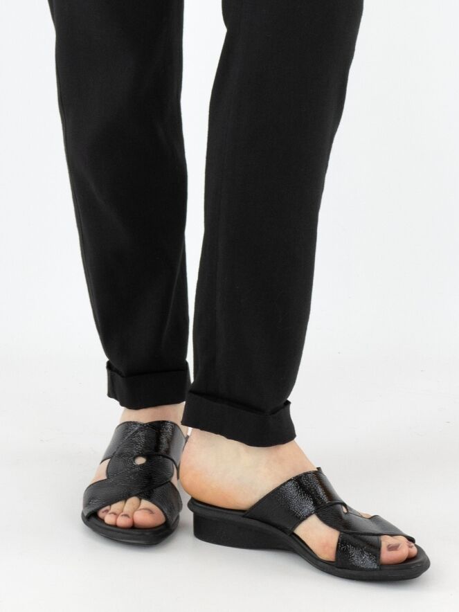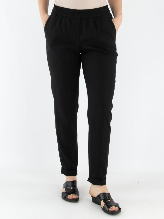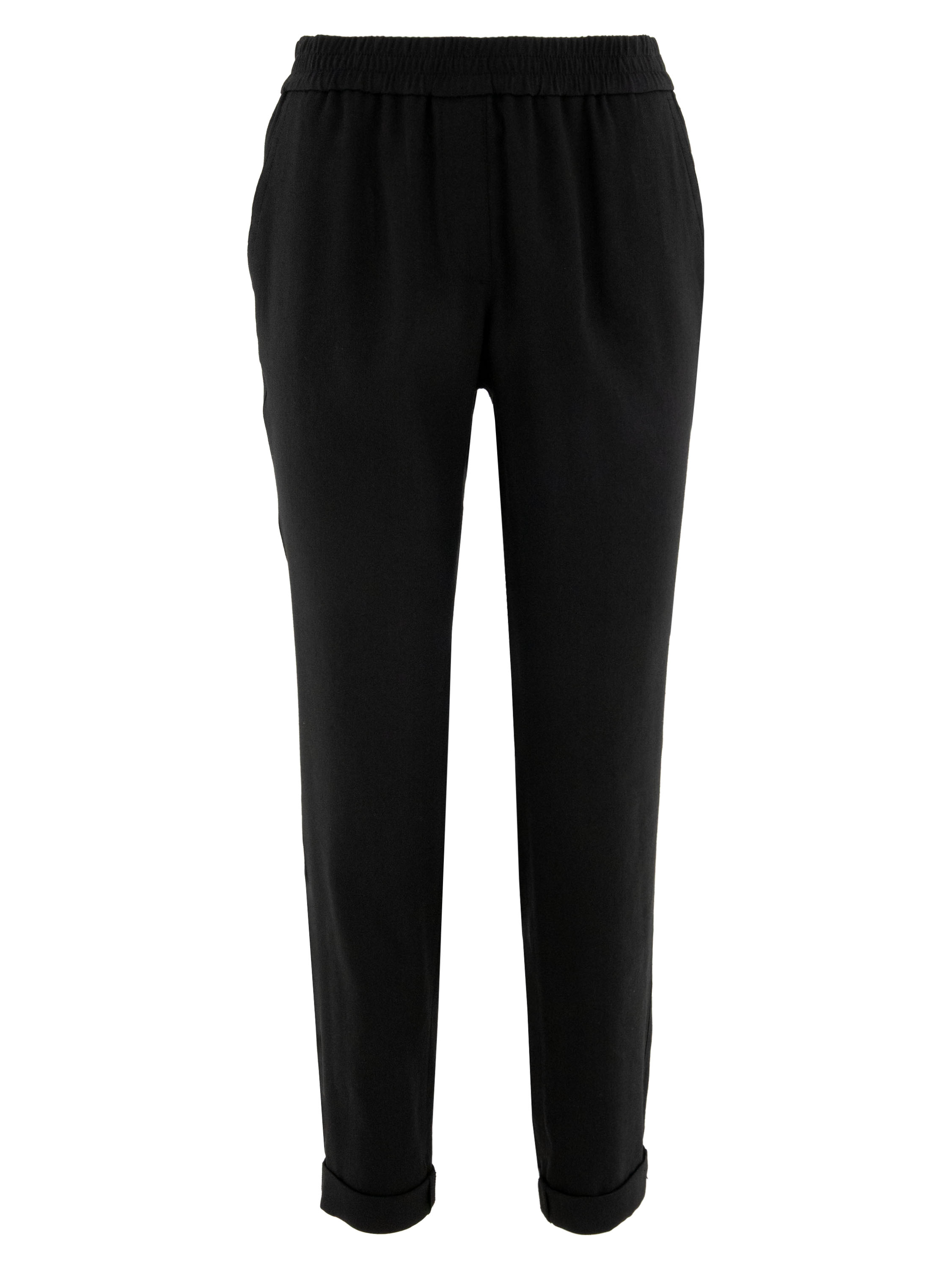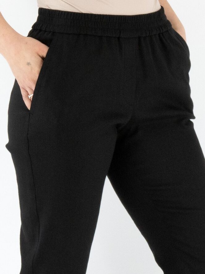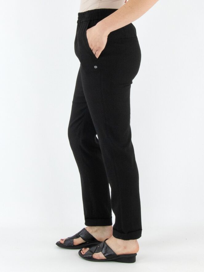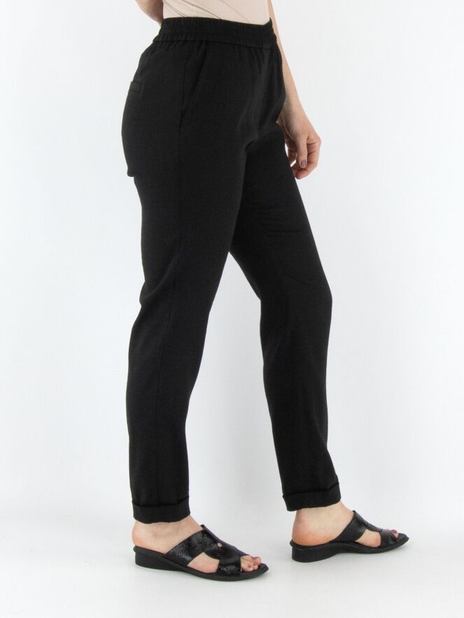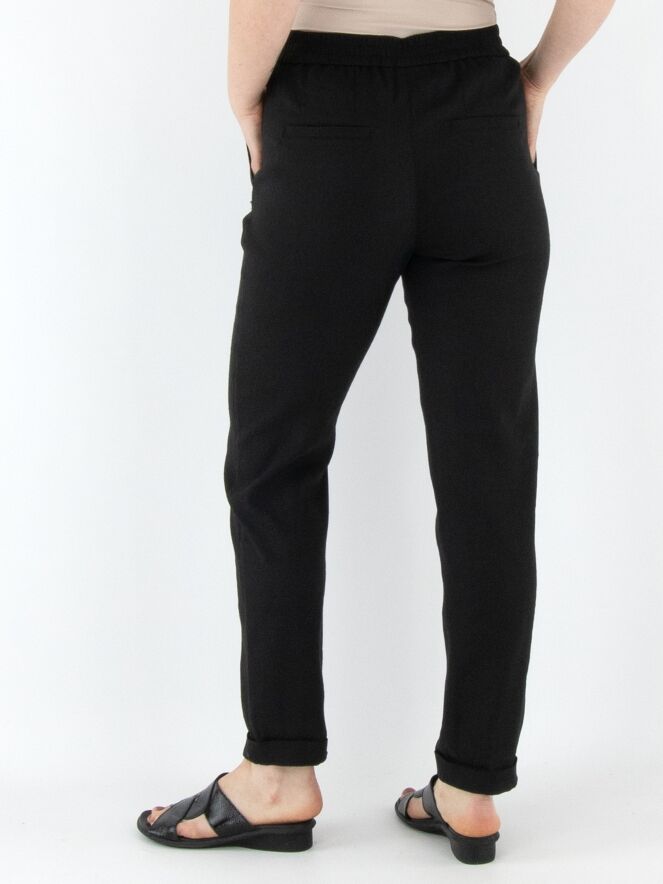 A pair of trousers from Marc Cain in black. The waistband features a finely pleated elastic band. The trousers have side pockets and a short turn-up at the bottom. These trousers can be washed at 30 degrees.
