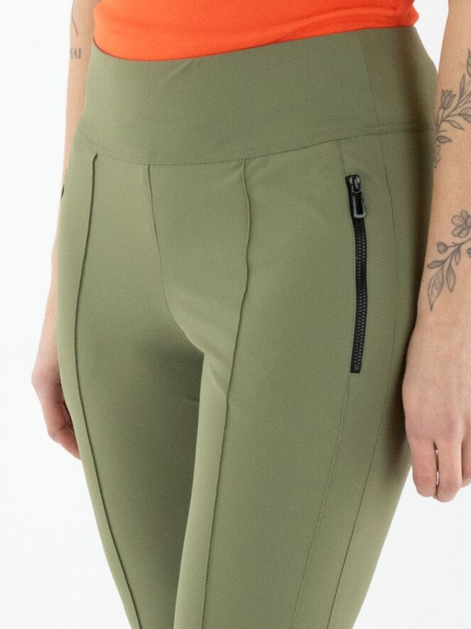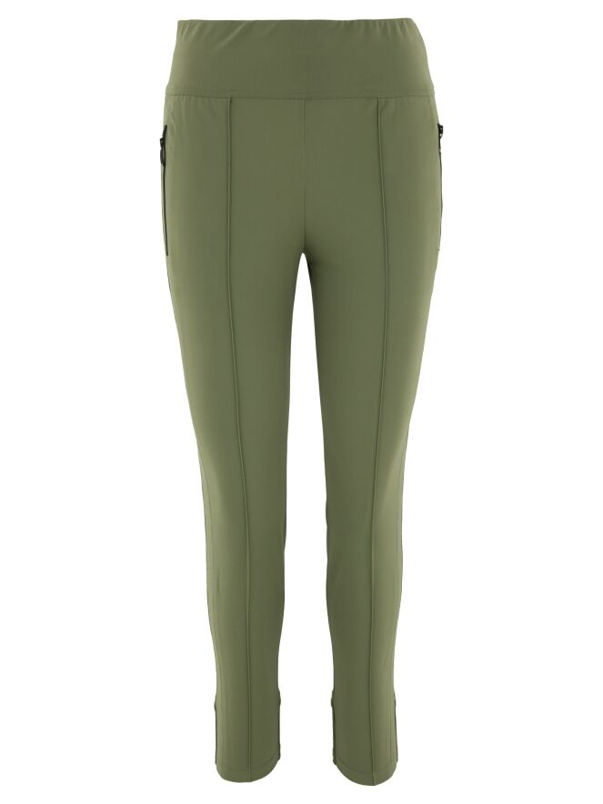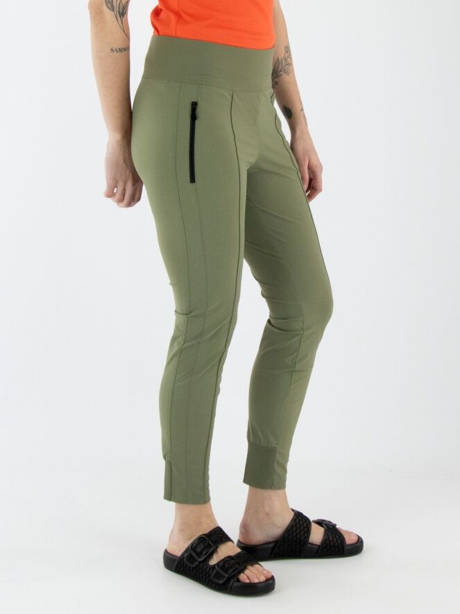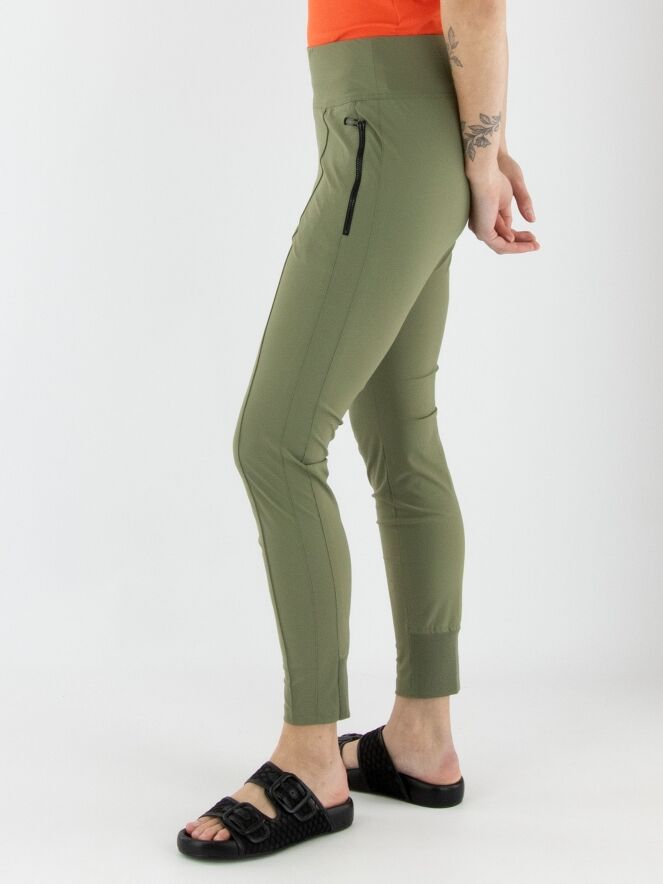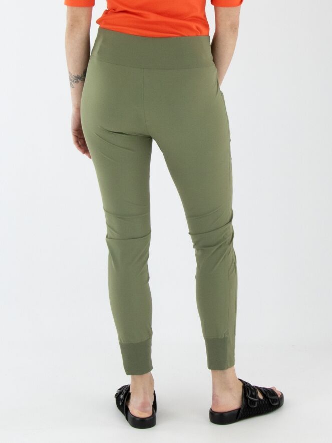 A legging by Marc Cain in olive green. The waistband features a wide elastic band. The pockets are equipped with zippers. At the back of the lower legs, there is a wide, finely ribbed tricot cuff. This legging can be washed at 30 degrees.