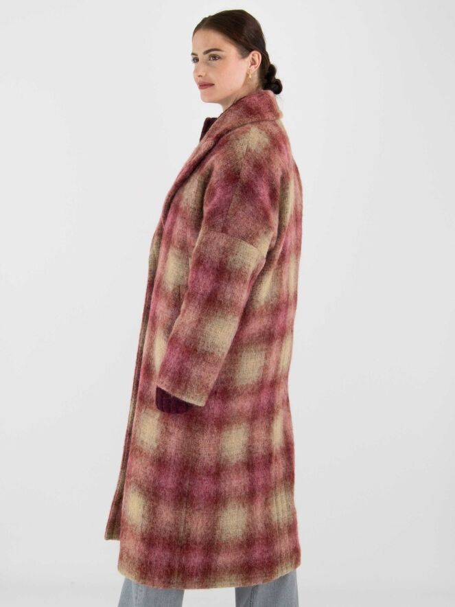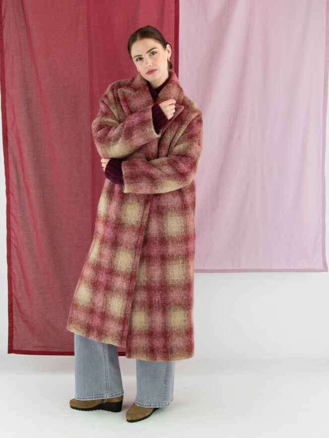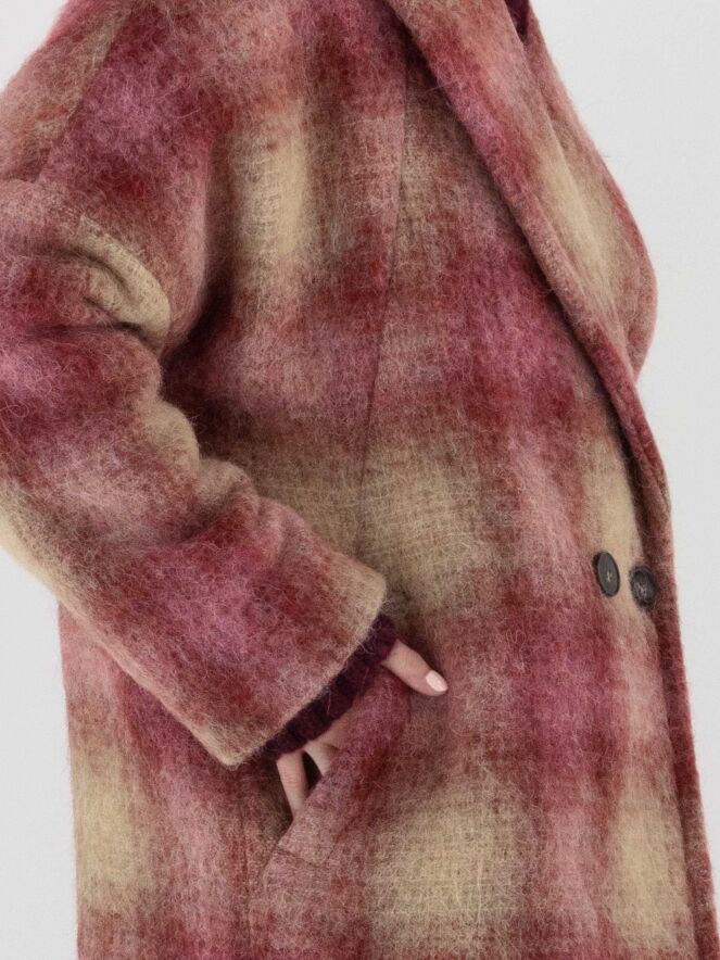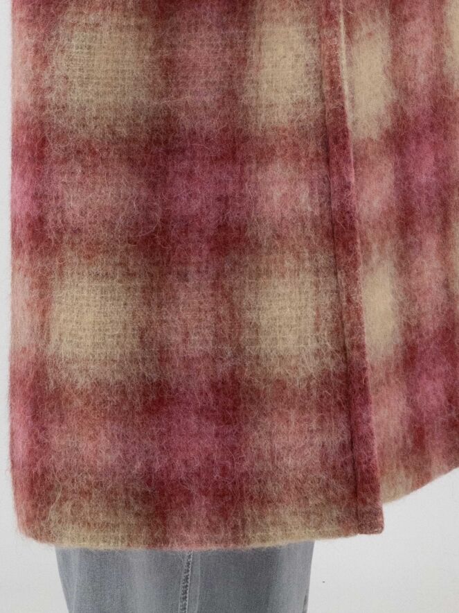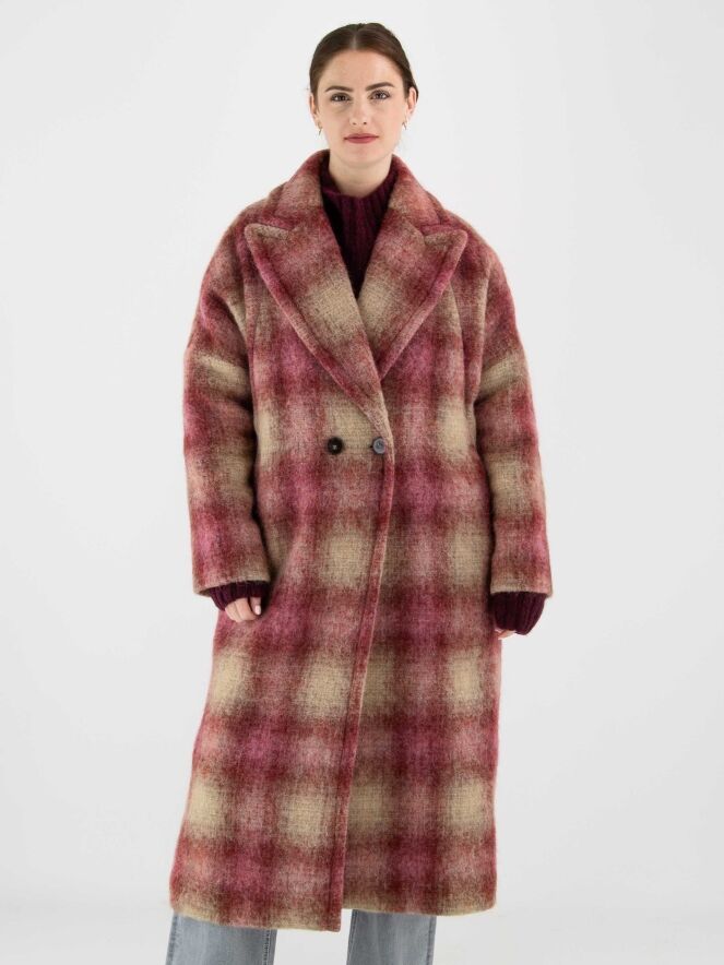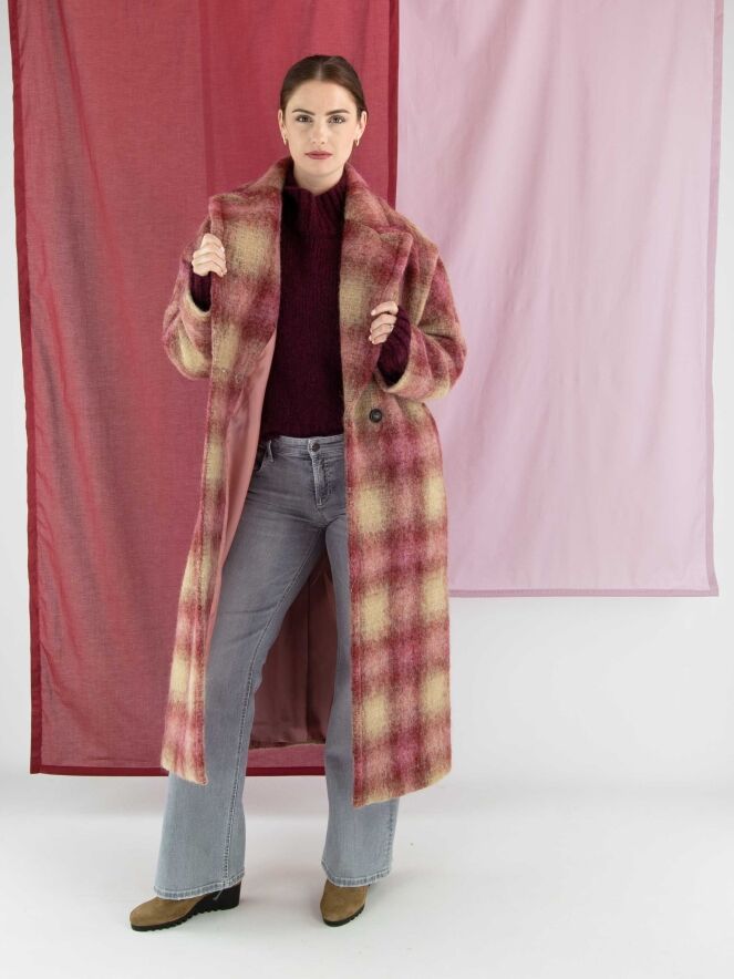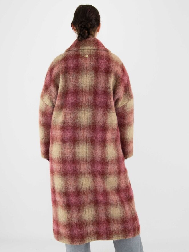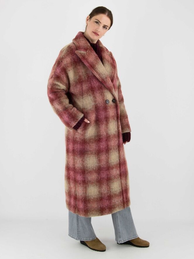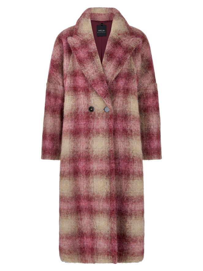 Long double-breasted coat by Marc Cain in a dégradé check print with shades of burgundy and camel. The coat is fully lined and must not be washed.