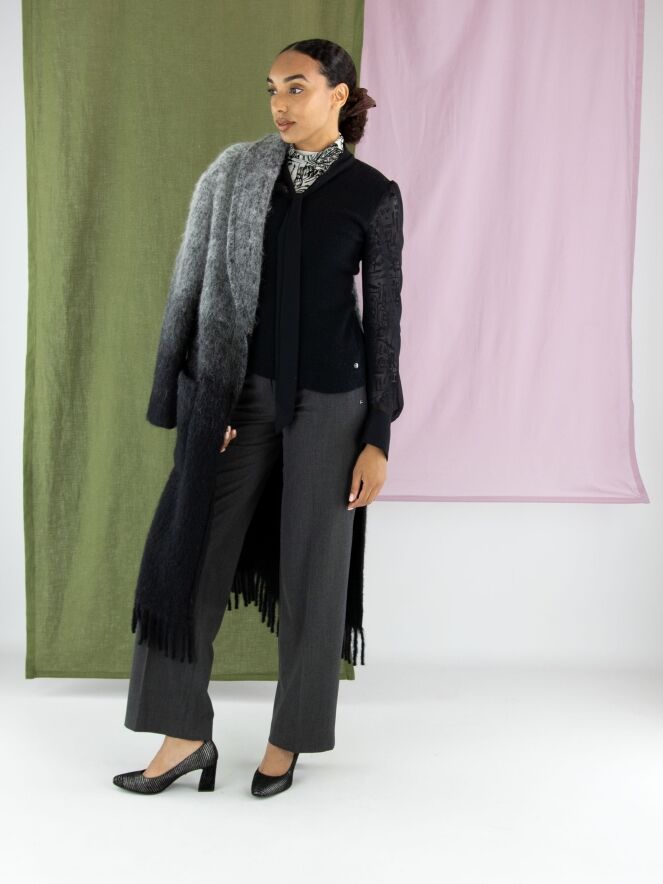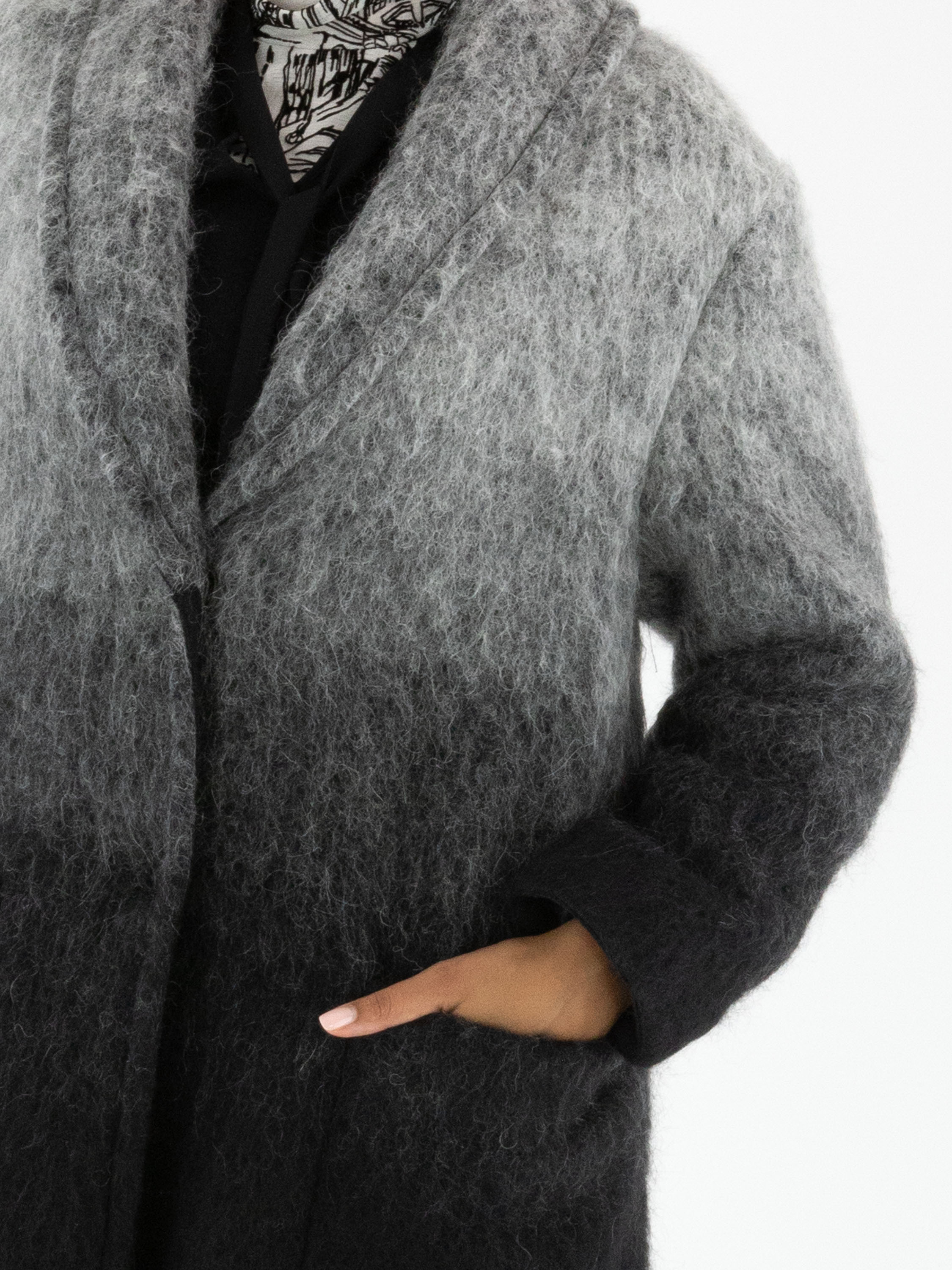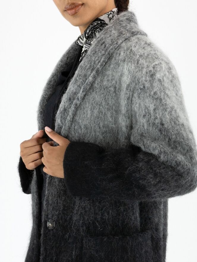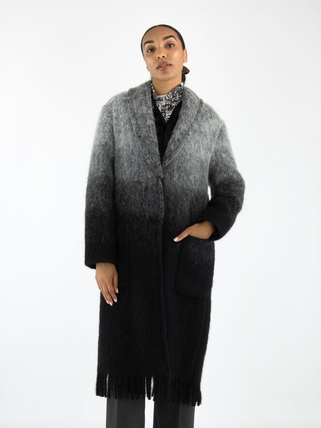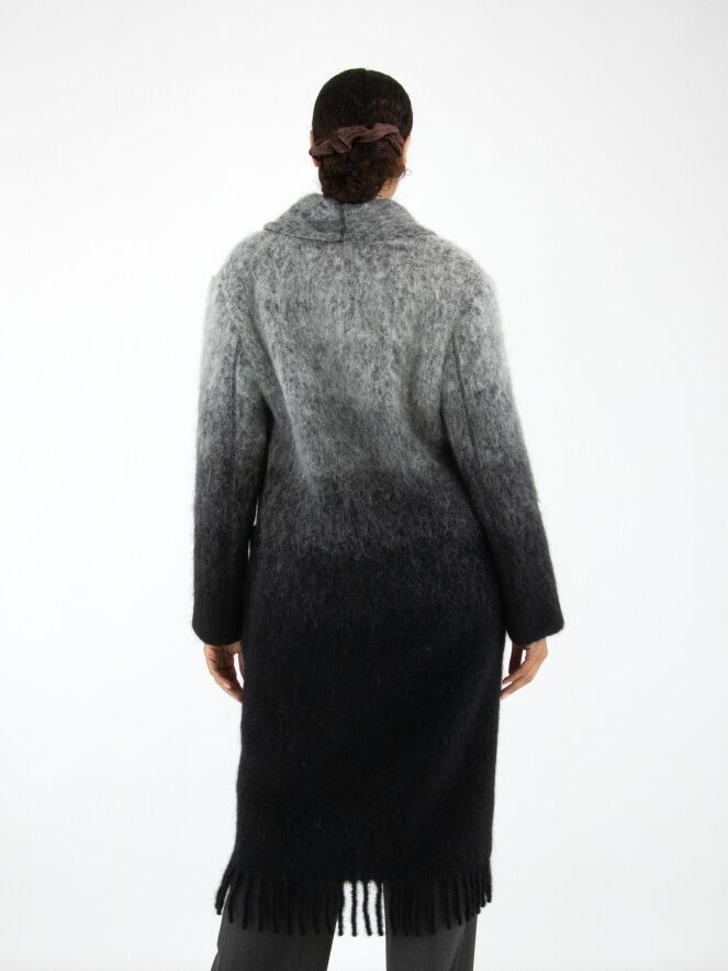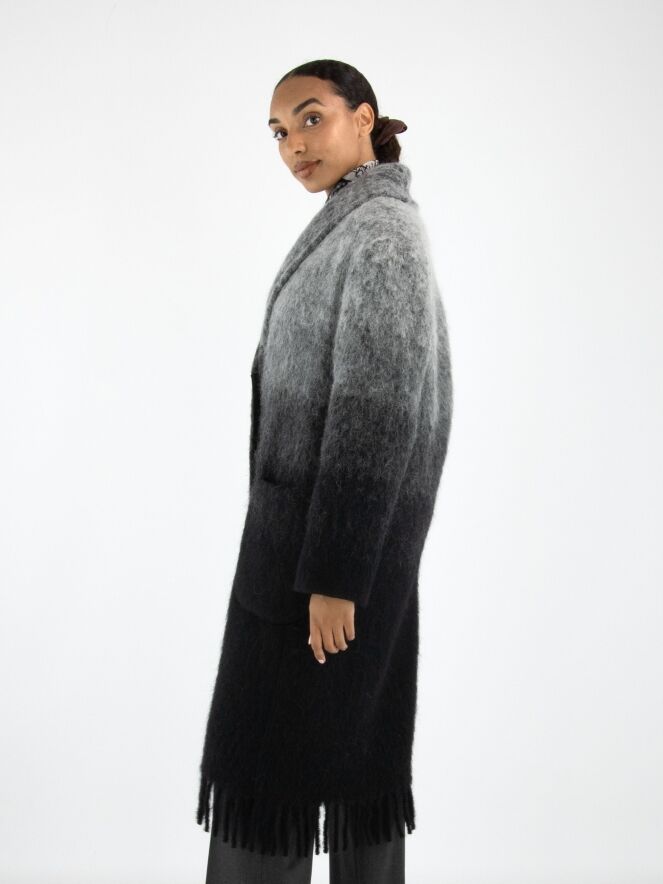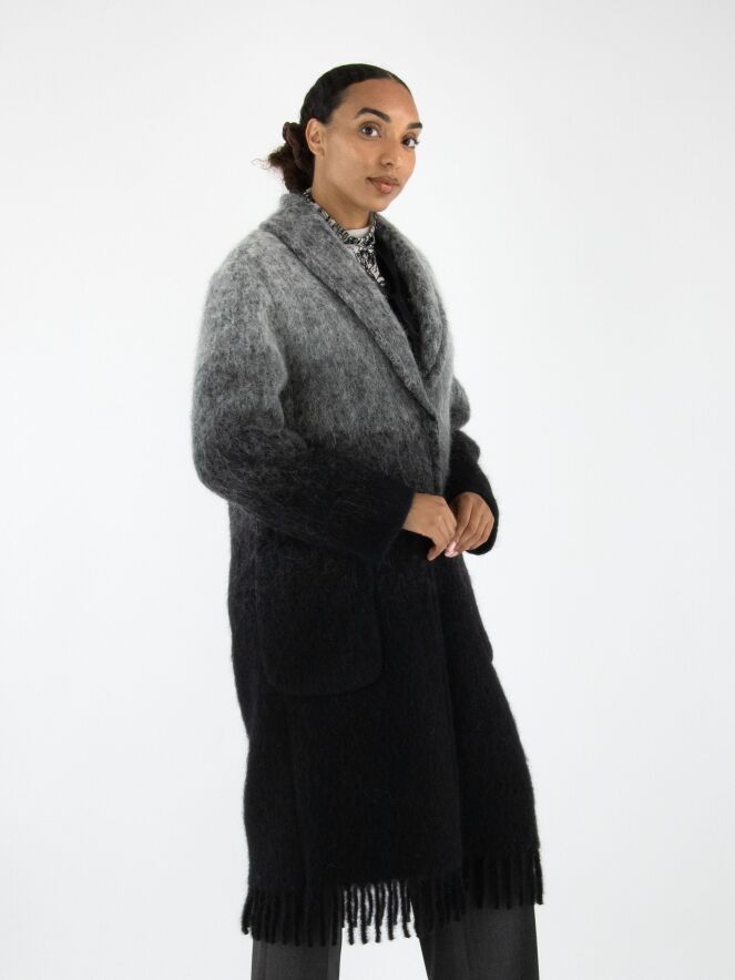 A coat by Marc Cain in a dégradé from light grey at the collar to anthracite grey at the hem. The coat features a closure with two press studs and is unlined. The hem is finished with long fringes. This coat cannot be washed.
