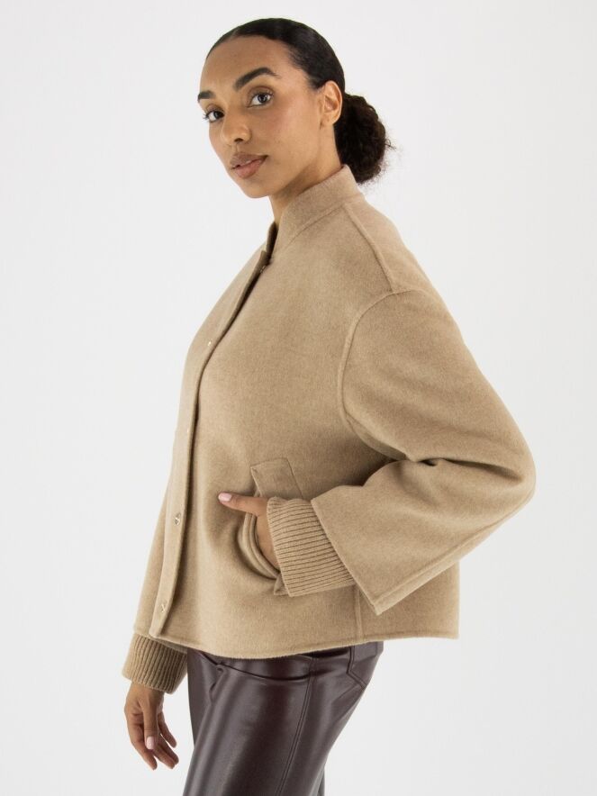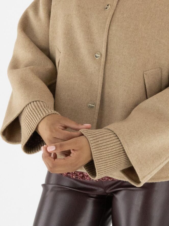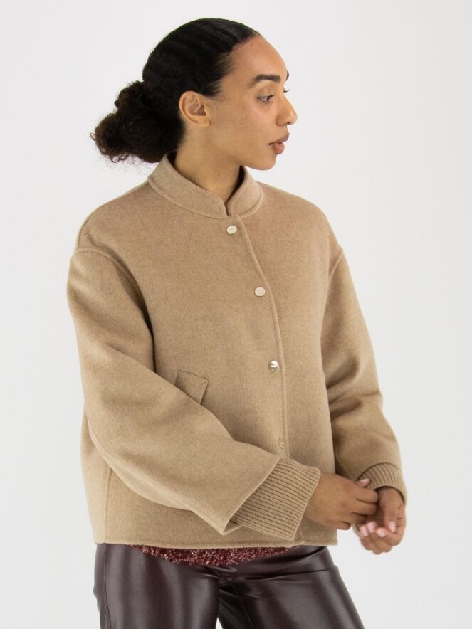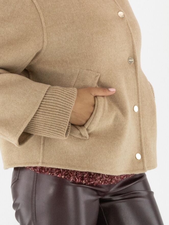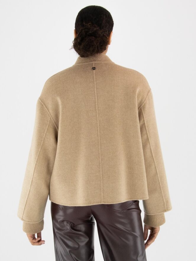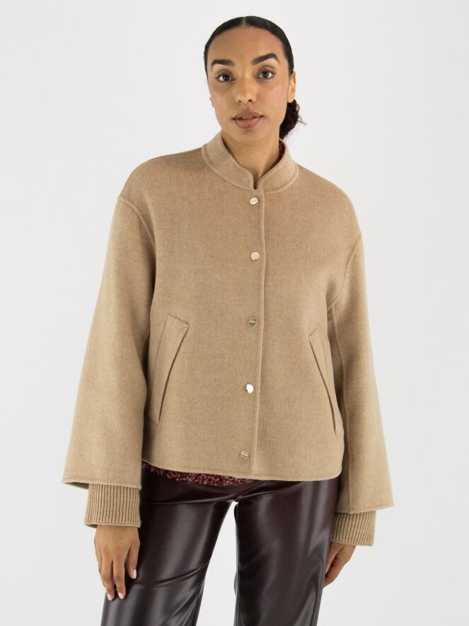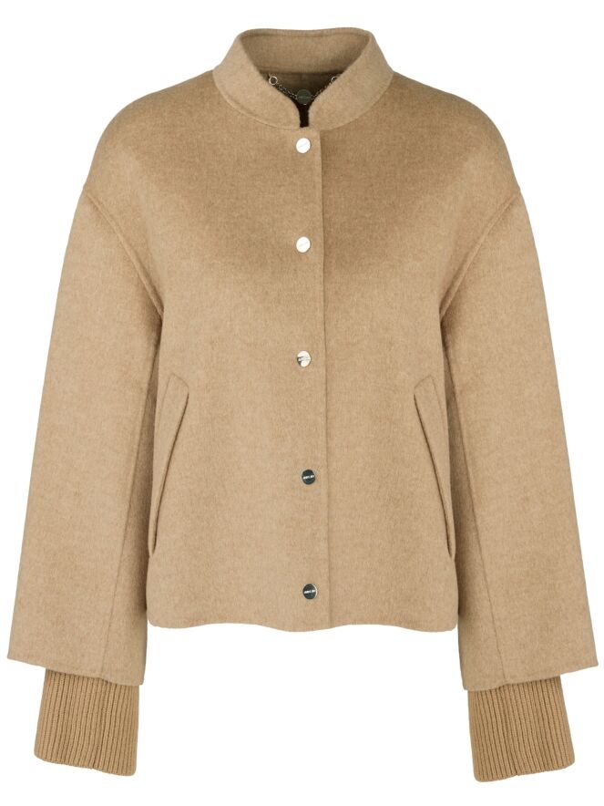 Blazer by Marc Cain in a soft camel colour. The welt pockets feature a reversed flap. The blazer has small gold-coloured press studs as closure and is unlined. Fine ribbed knit cuffs extend from the ends of the sleeves. This blazer should not be washed.