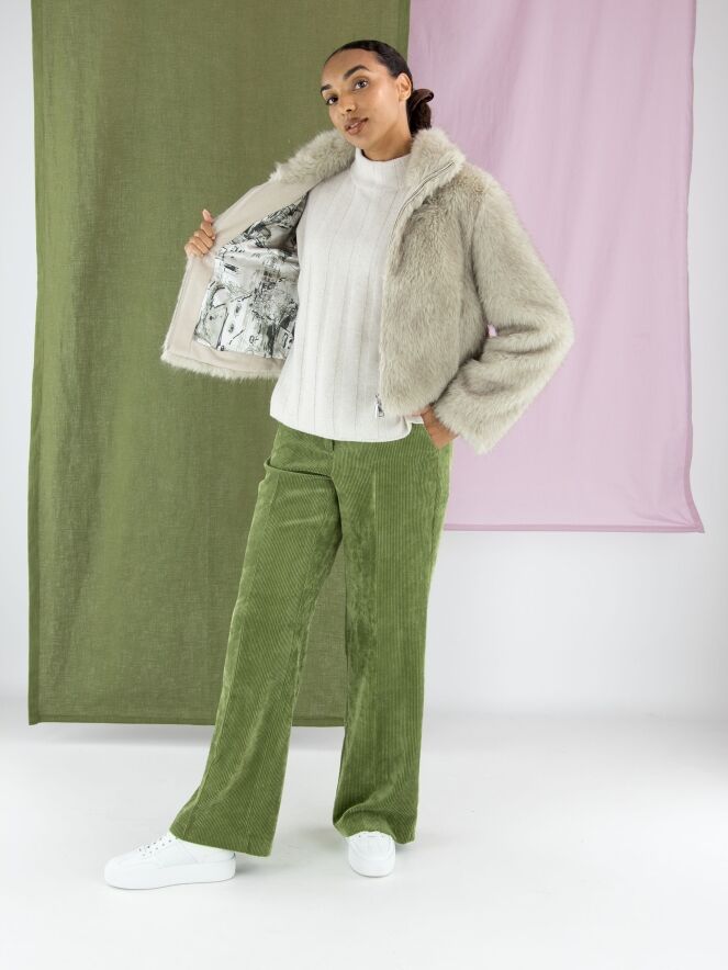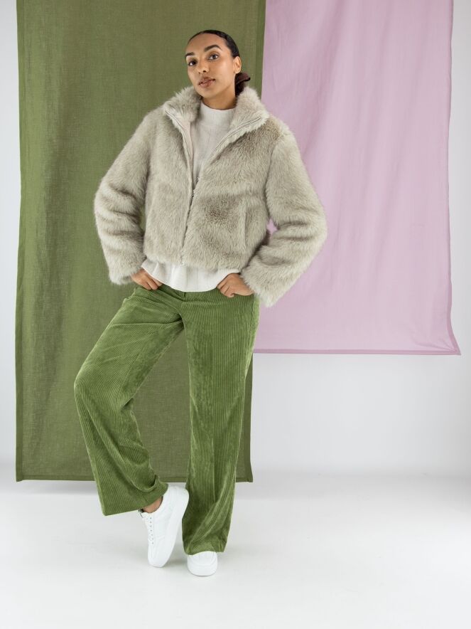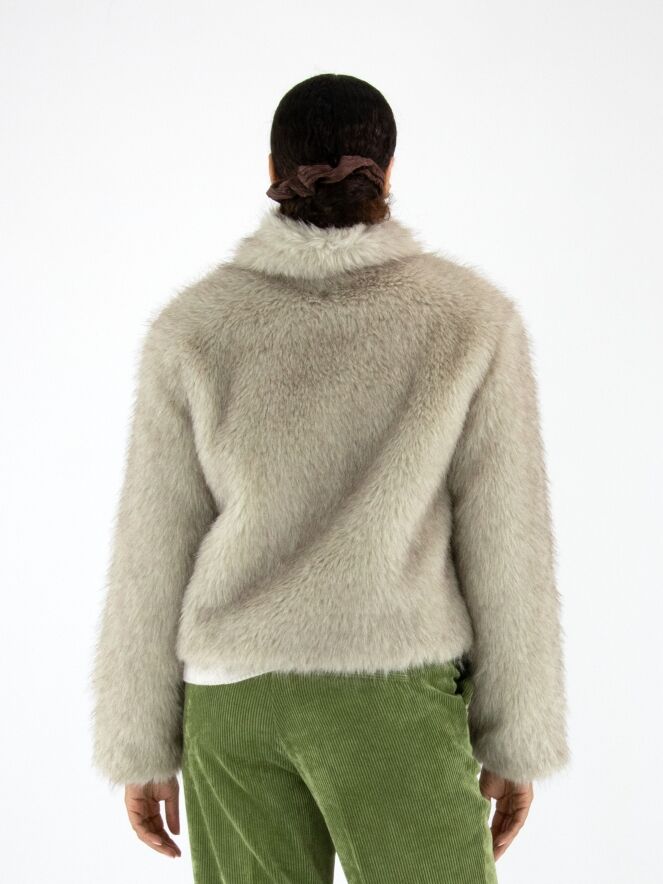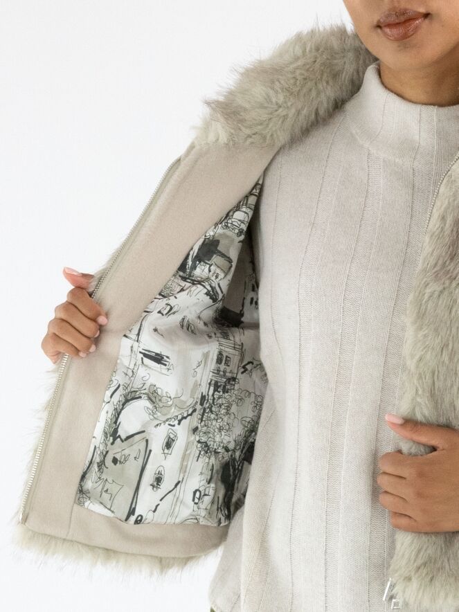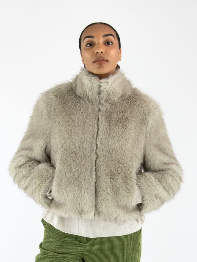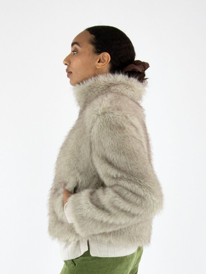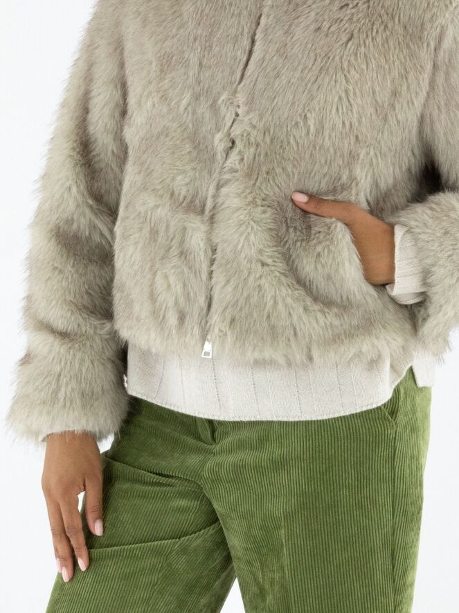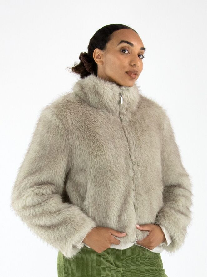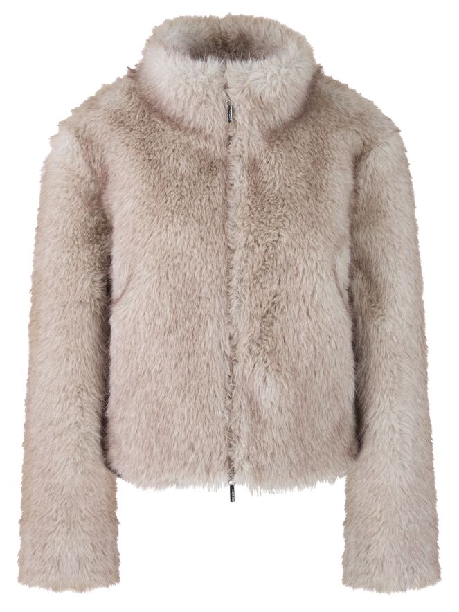 A short faux fur coat by Marc Cain in natural shades of beige, grey, and off-white. The faux fur is left unshorn, creating a rich and luxurious look. The coat features a zipper closure and side pockets. This coat cannot be washed.