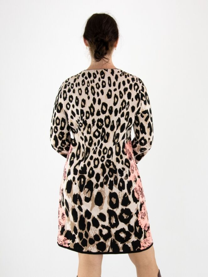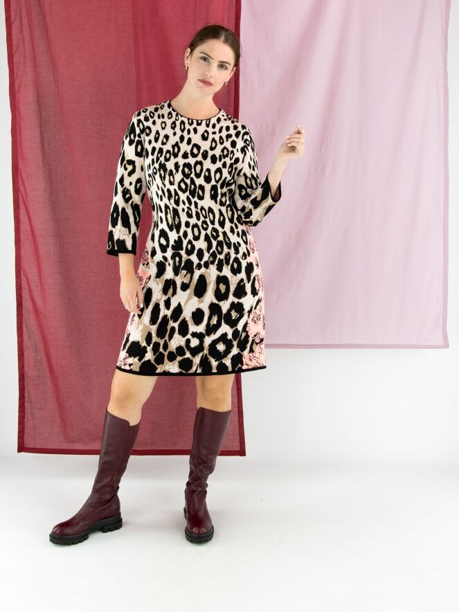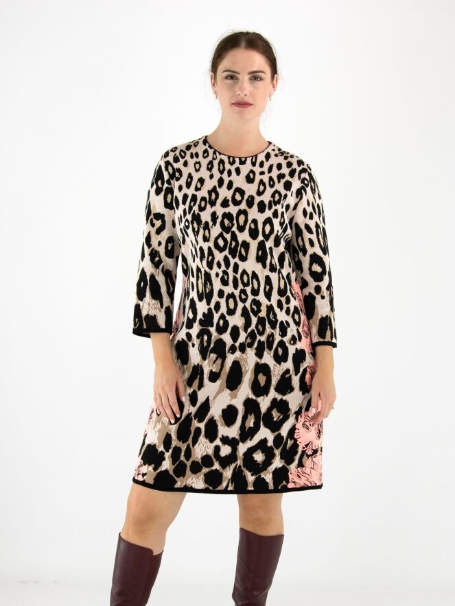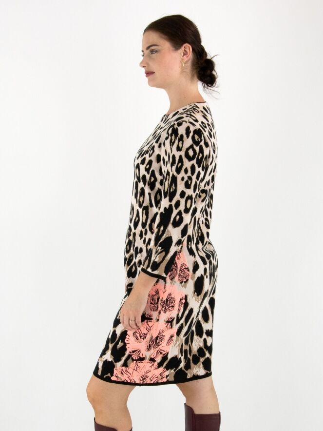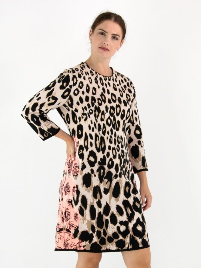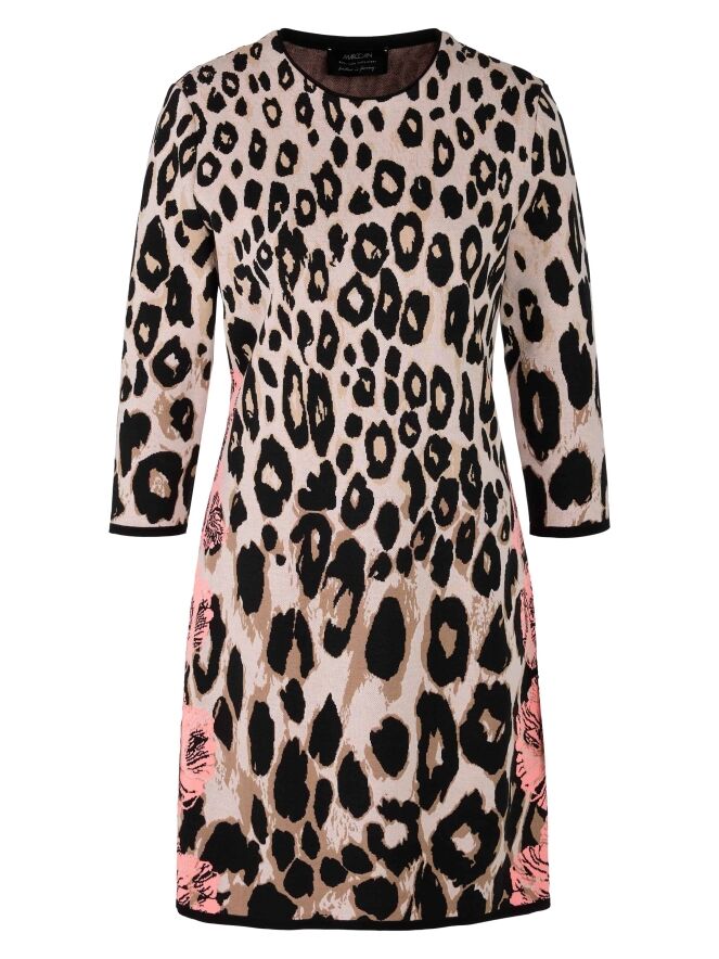 A dress by Marc Cain with a leopard print in various shades of brown and black on a sand-coloured background. From the waist down, a salmon-pink floral motif is printed along the sides. A black trim runs along the round neckline, the sleeve ends, and the hem. This dress can be washed at 30 degrees.