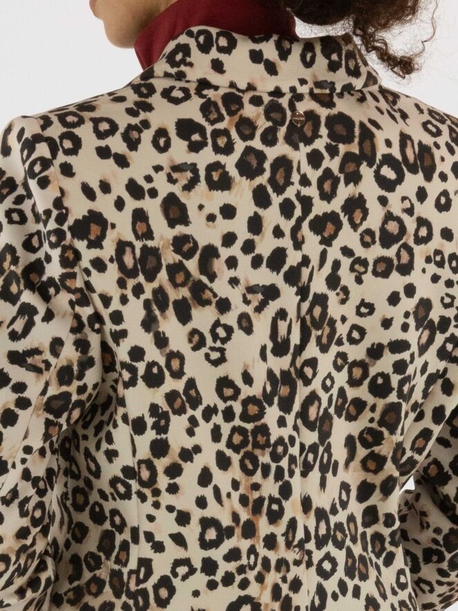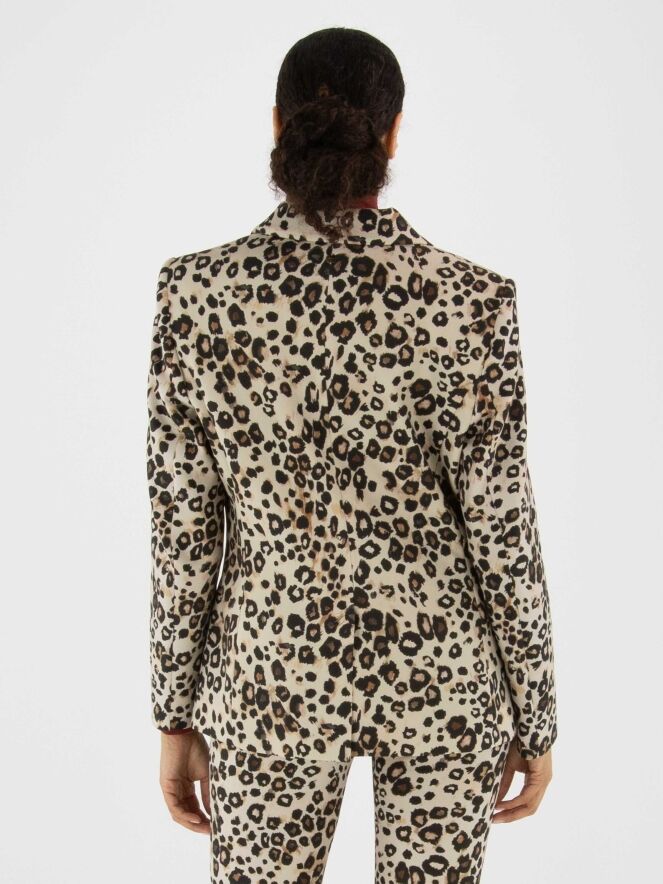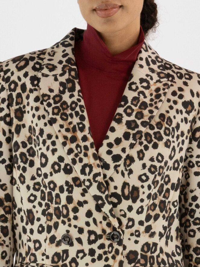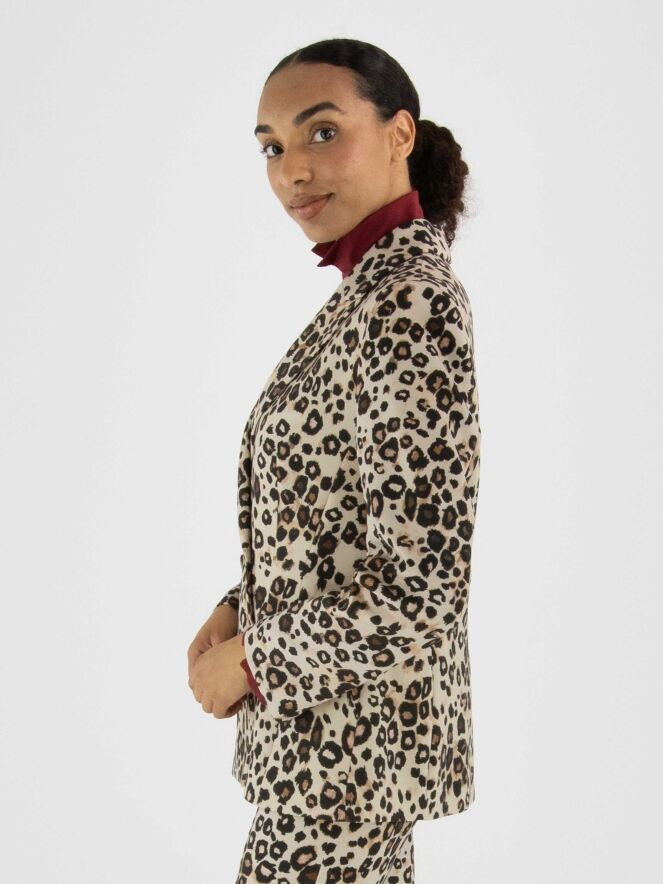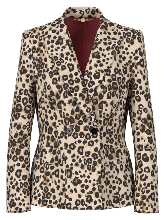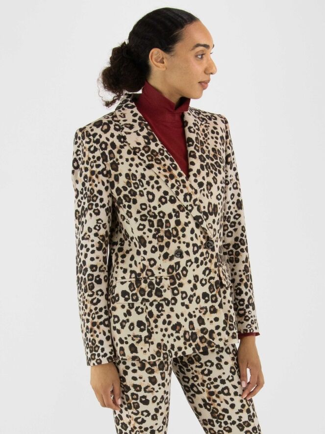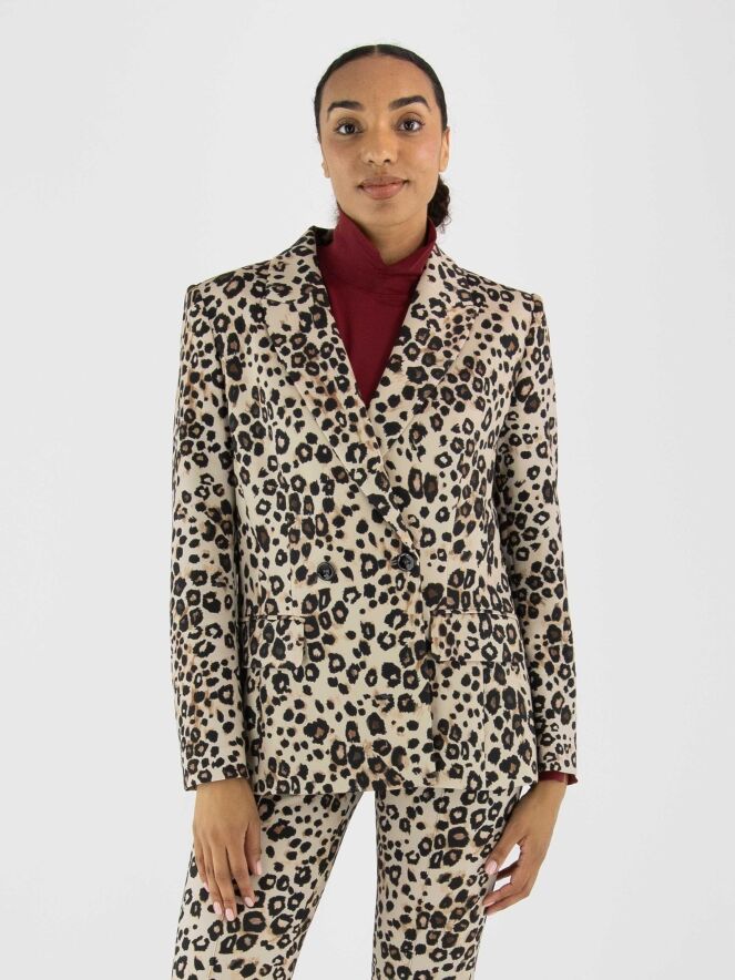 Scuba double-breasted blazer by Marc Cain in a leopard print featuring various shades of brown and black on a sand-coloured background. The blazer is fully lined and should not be washed.