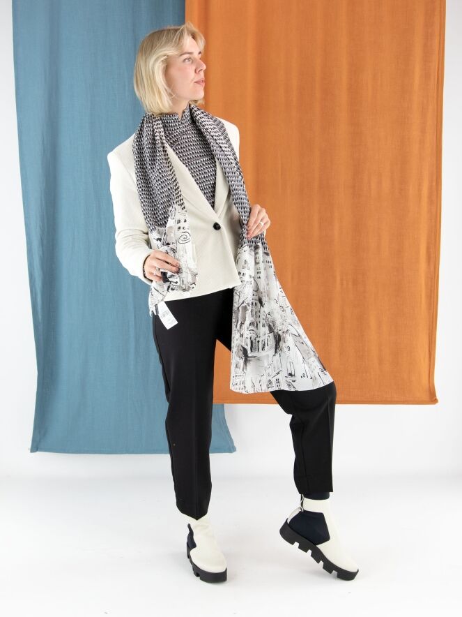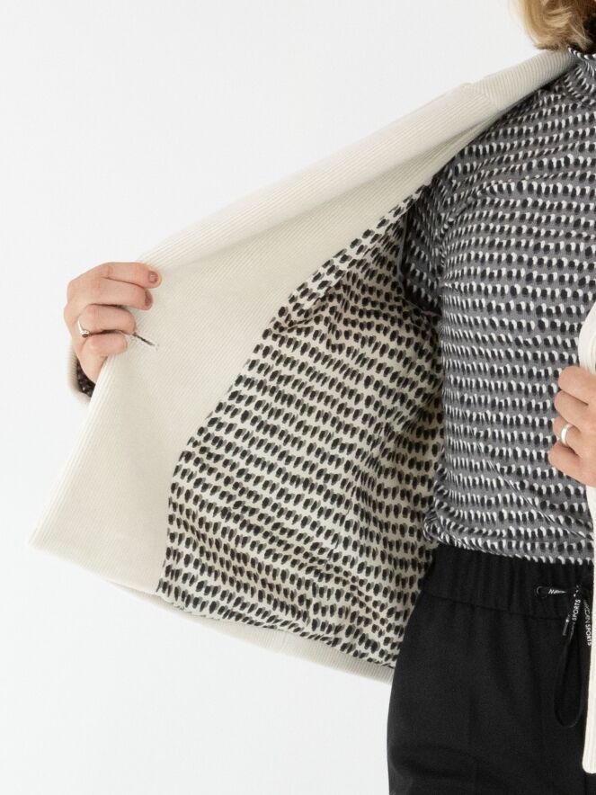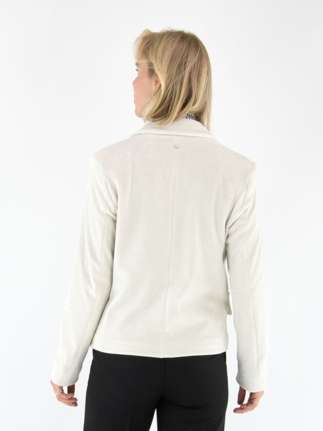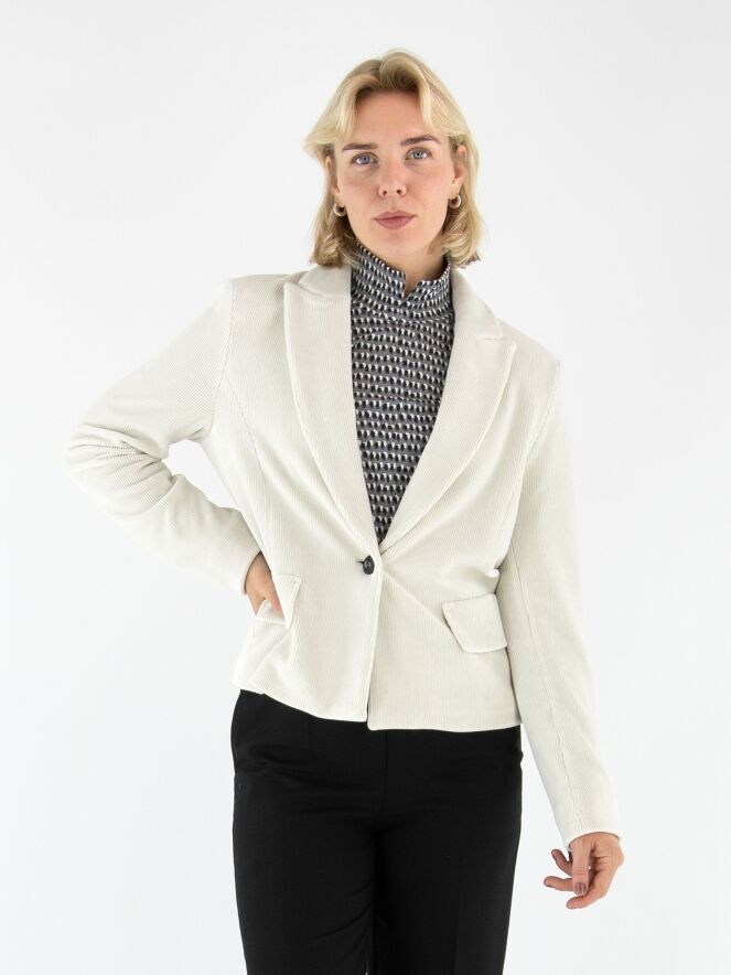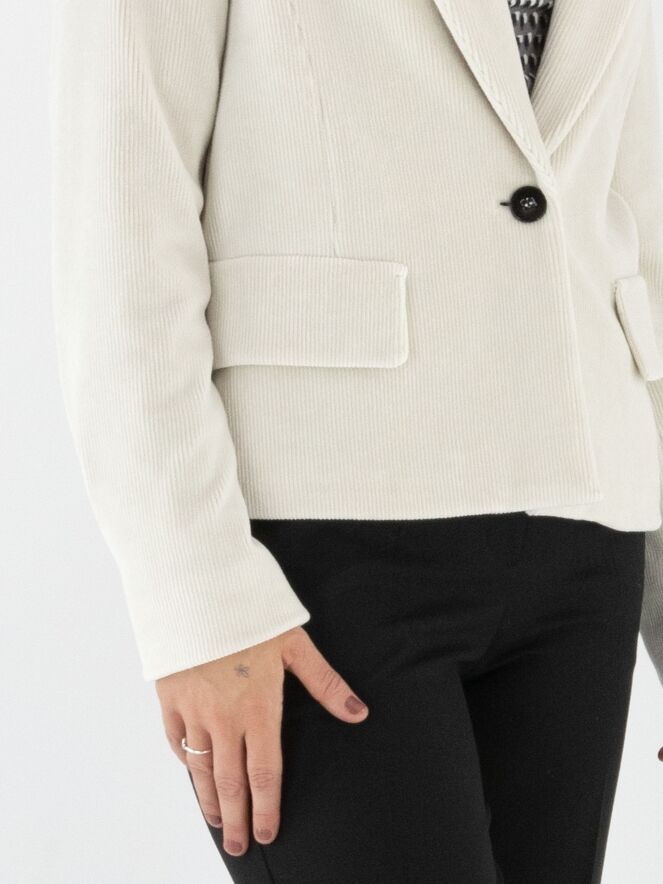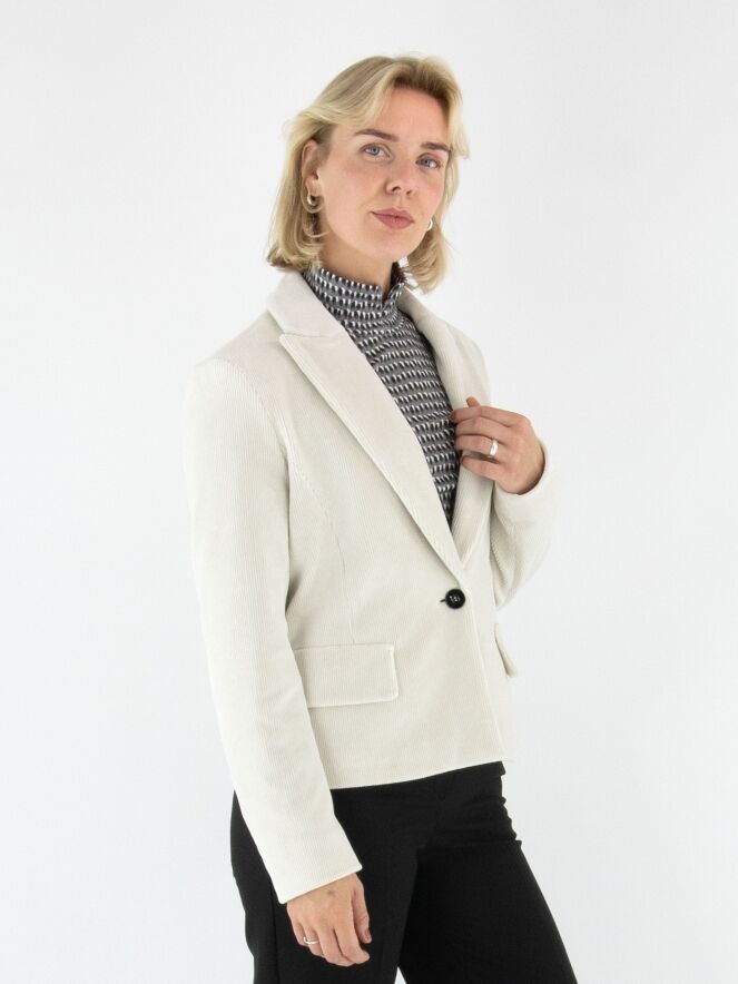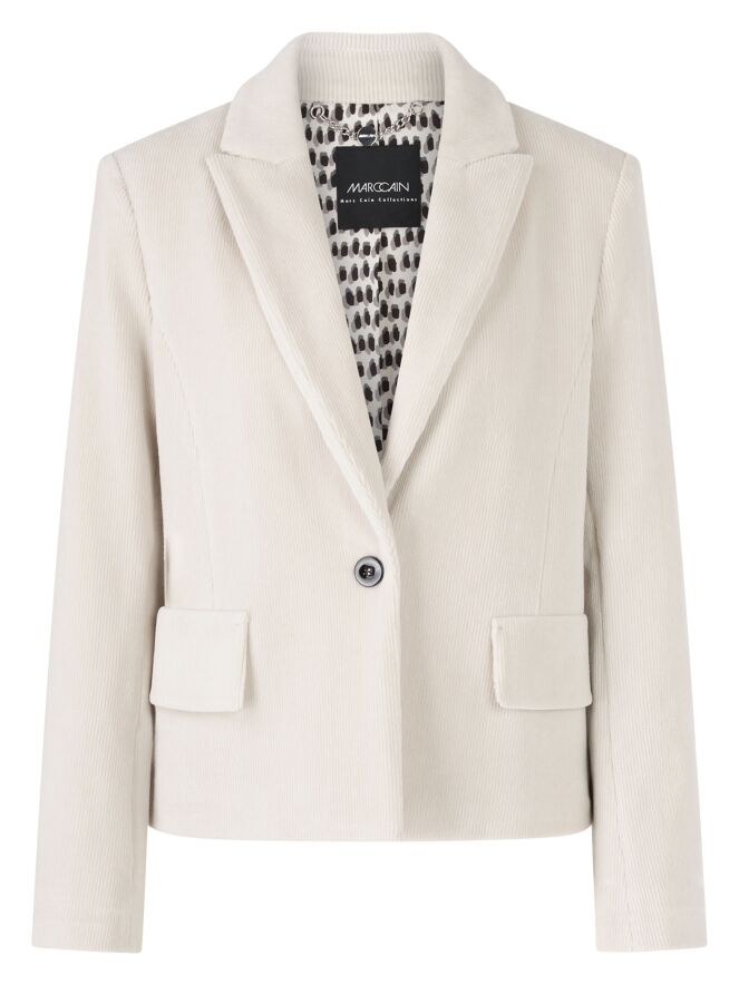 A rib cord blazer from Marc Cain in a soft beige shade. The blazer fastens with a single button and is lined with a playful polka dot print on the inside, adding a touch of charm. This blazer can be washed at 30 degrees.