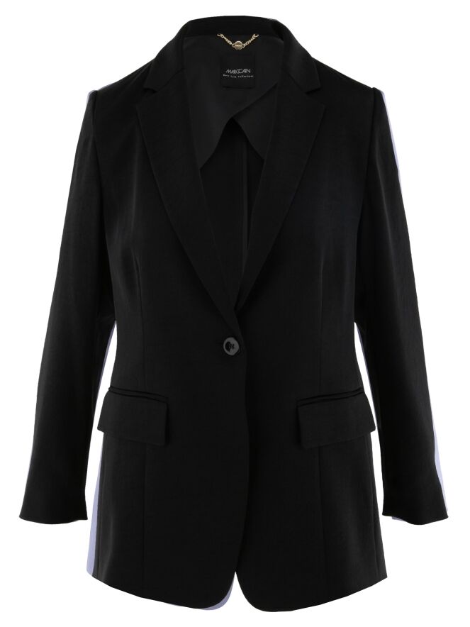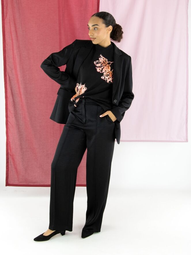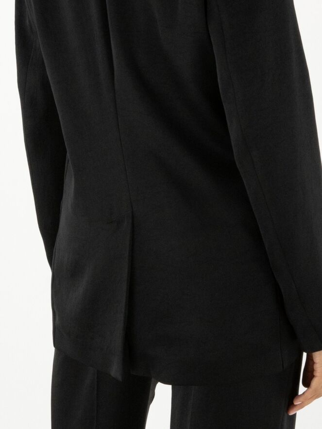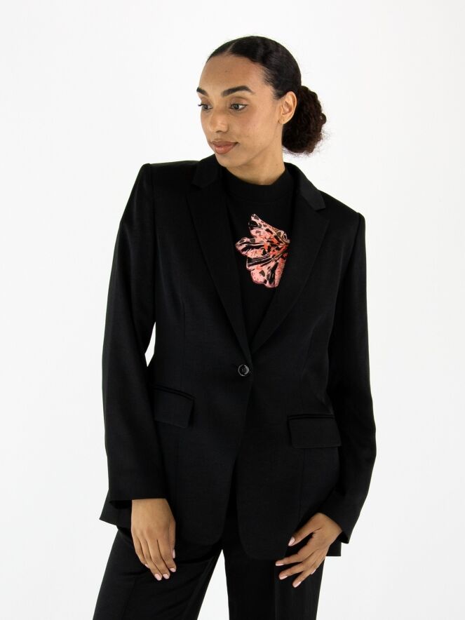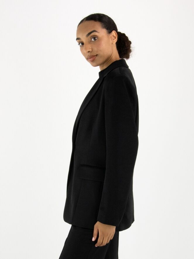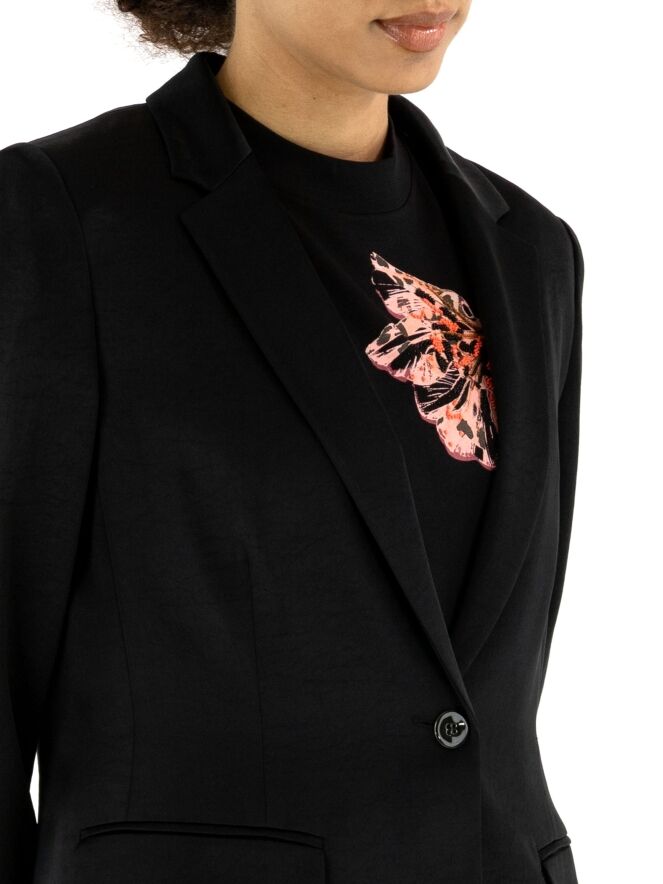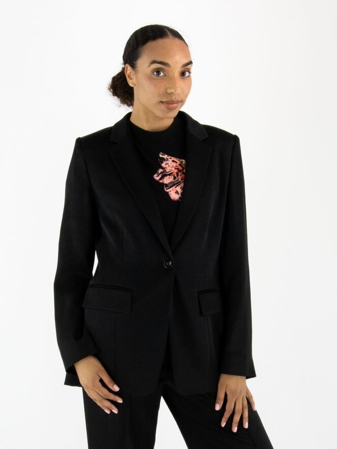 Matte satin blazer by Marc Cain in black. The blazer is half lined and features a centre back slit at the hem. It fastens with a single button and can be washed at 30 degrees.