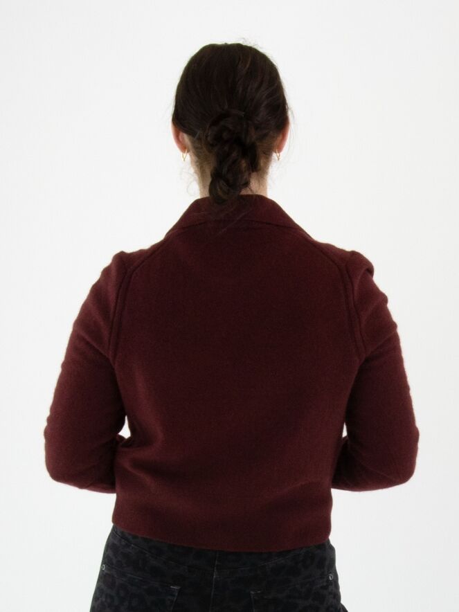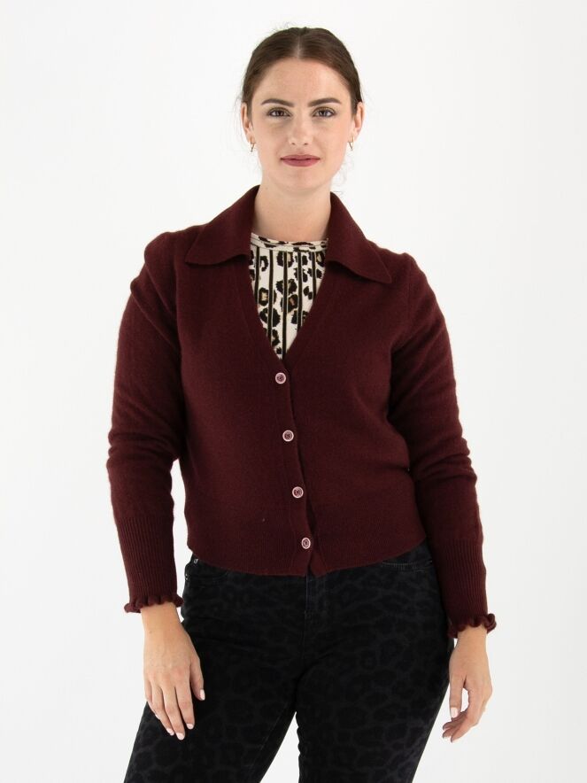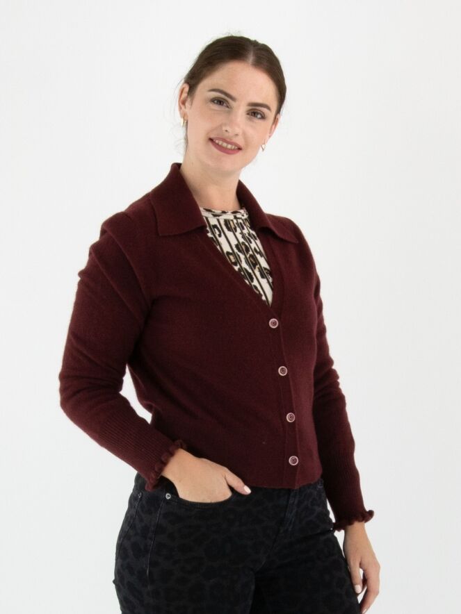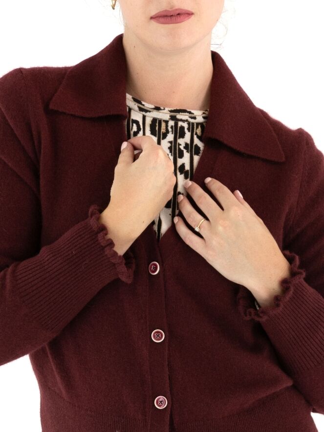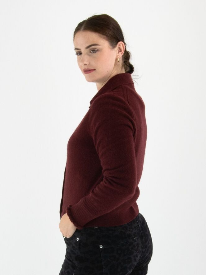 A short cardigan by Marc Cain in aubergine. The cardigan fastens with four buttons. A wide collar runs along the neckline. The long sleeves are finished with extended, finely ribbed cuffs featuring a smocked edge. This cardigan should be hand washed.