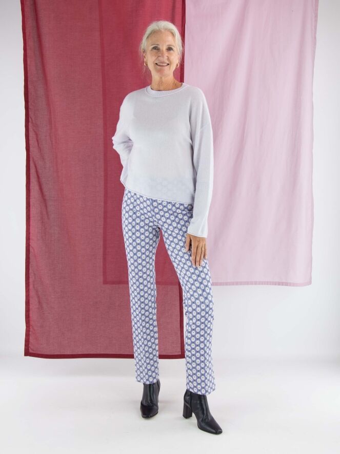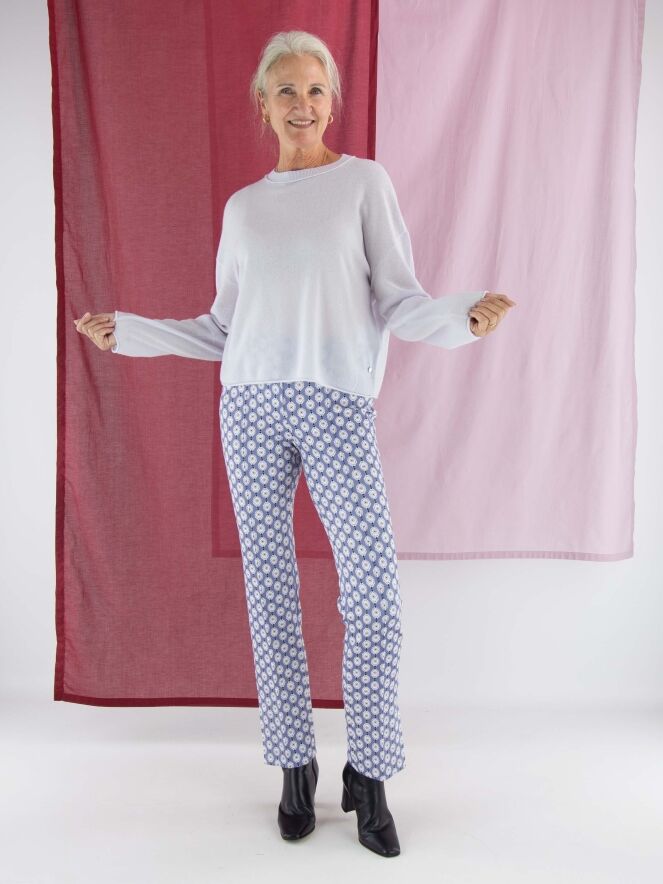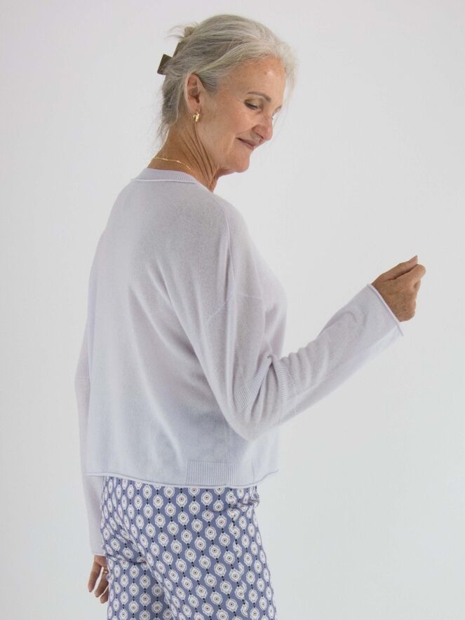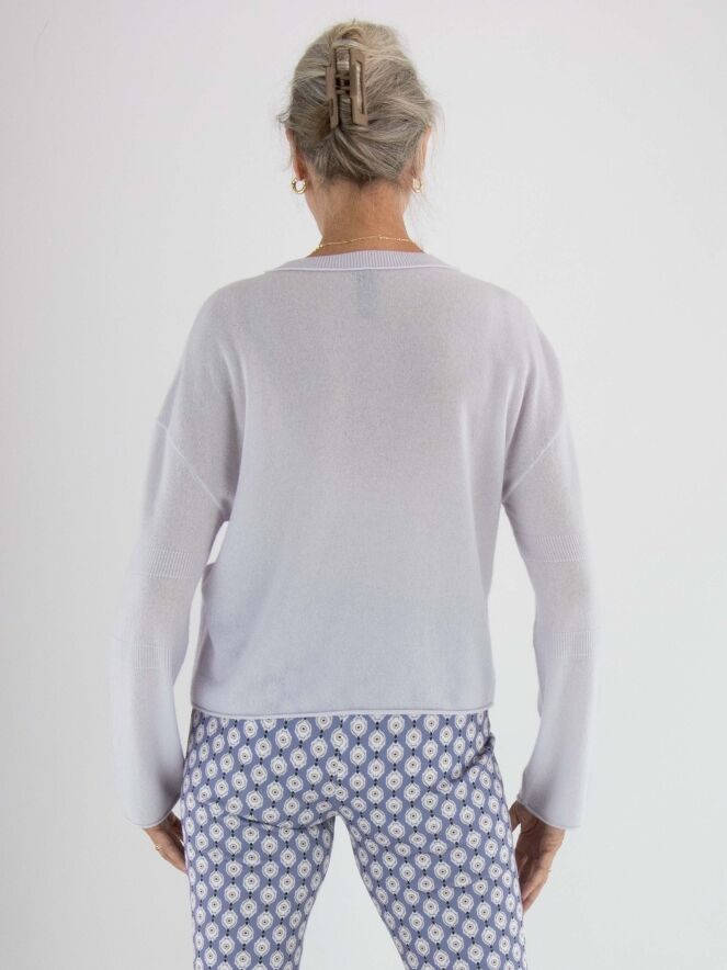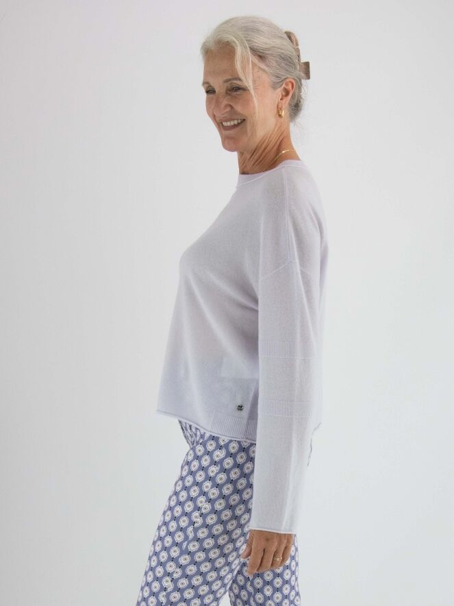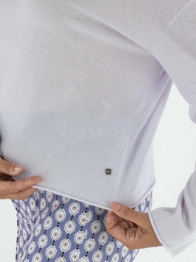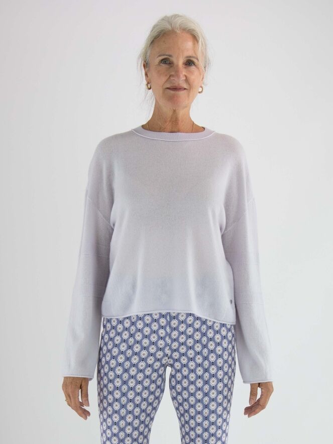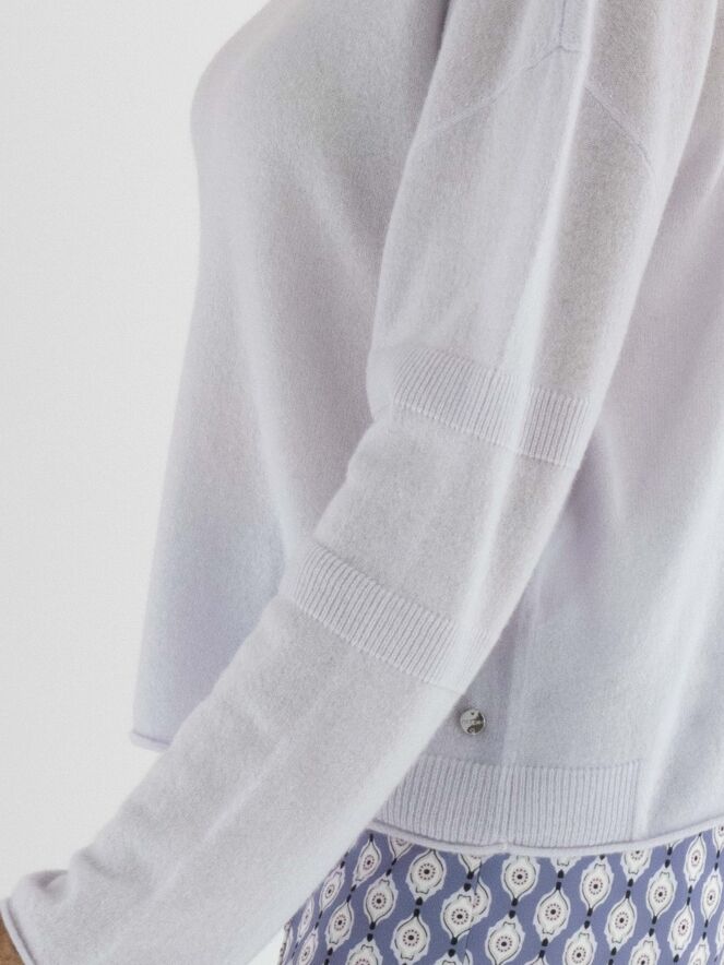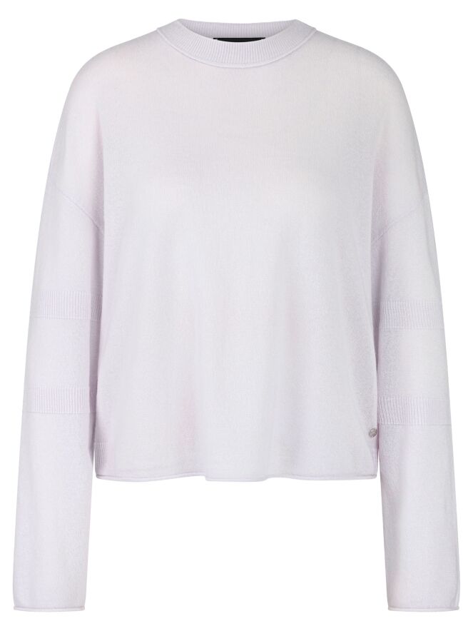 A pullover by Marc Cain in a pastel lilac shade. The pullover features a round neckline and long sleeves. Just above and below the elbow, there is a finely ribbed knitted trim. This pullover should be hand-washed.