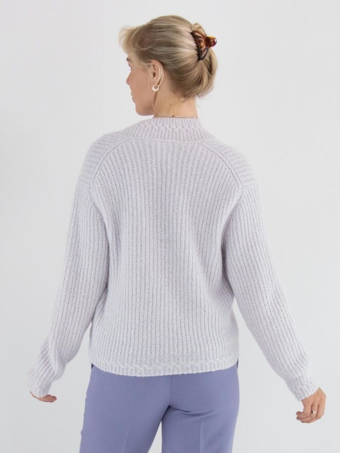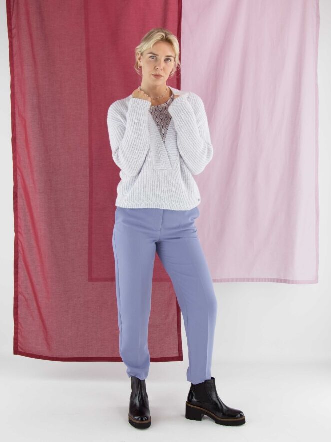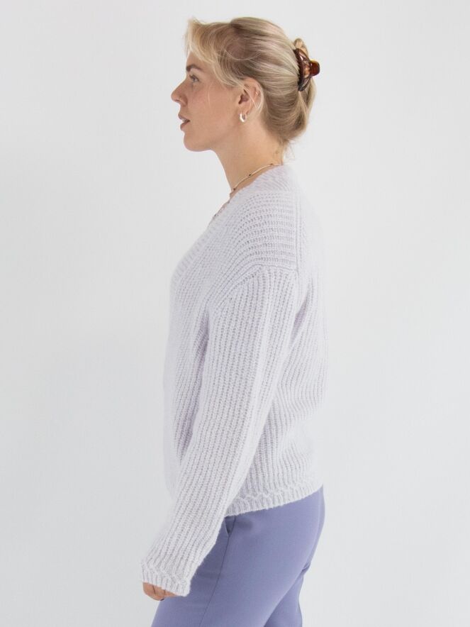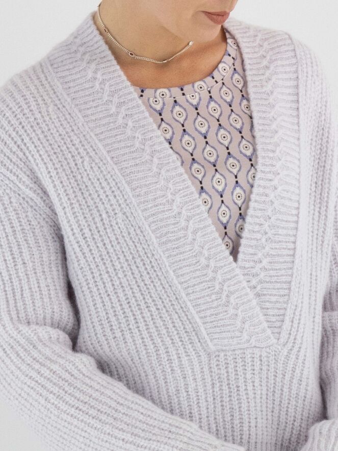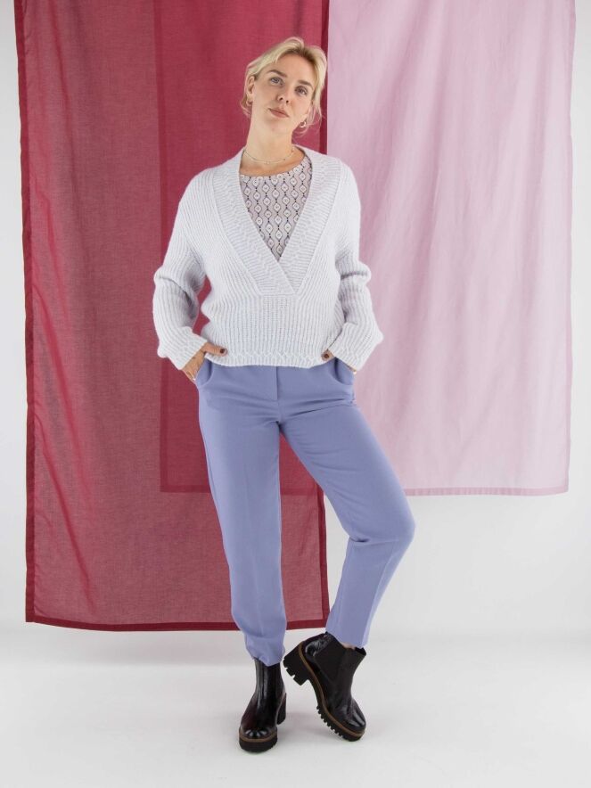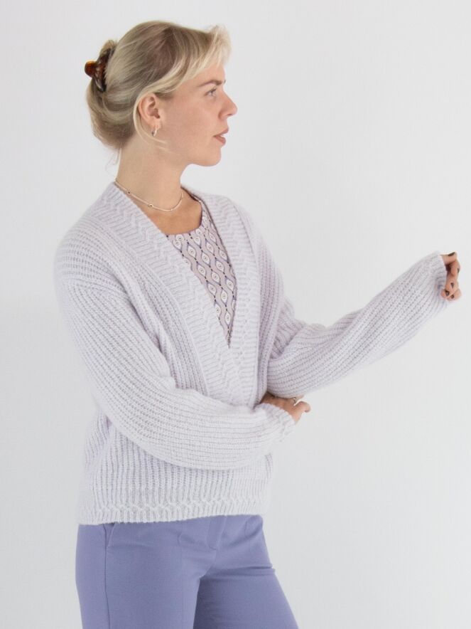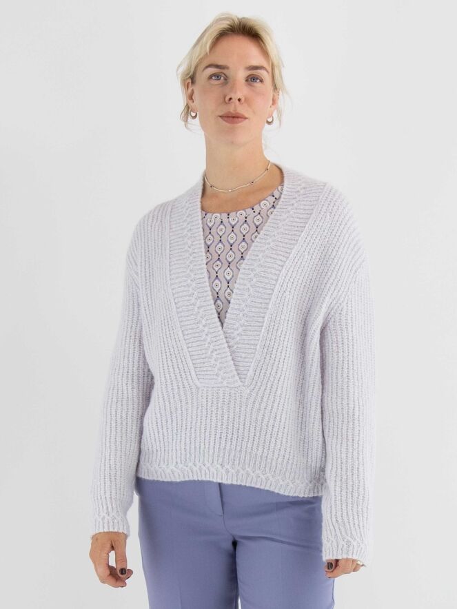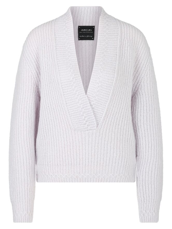 A cropped pullover by Marc Cain in a pastel lilac shade. The pullover features a deep V-neckline with a wide knitted trim along the edge. This pullover should be hand-washed.