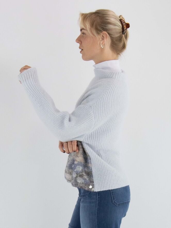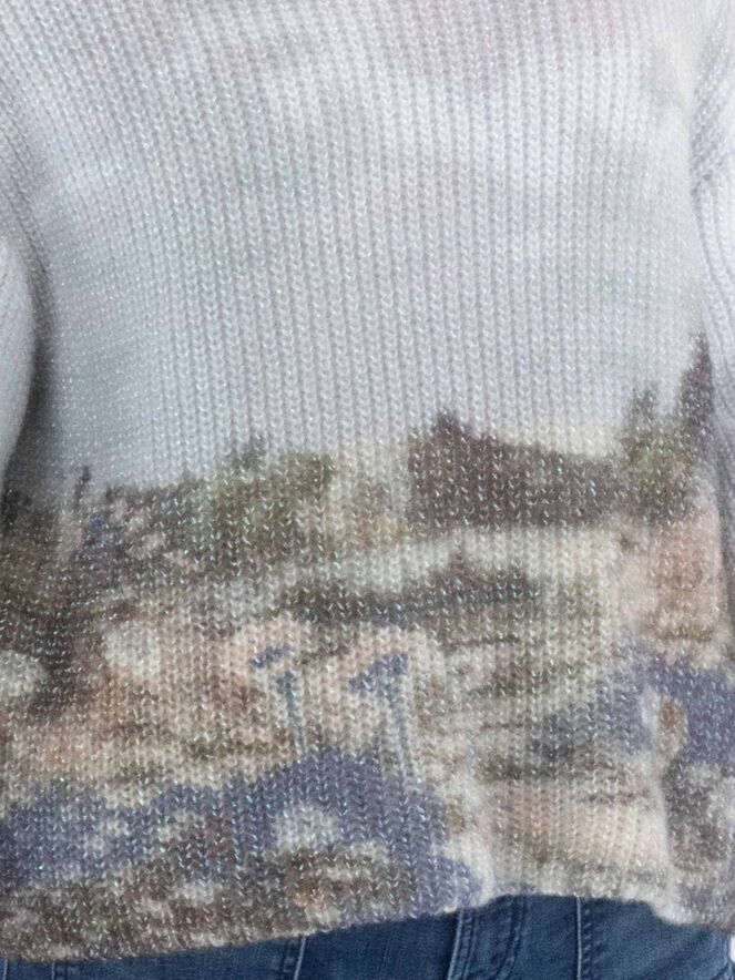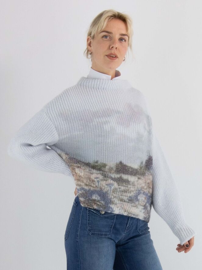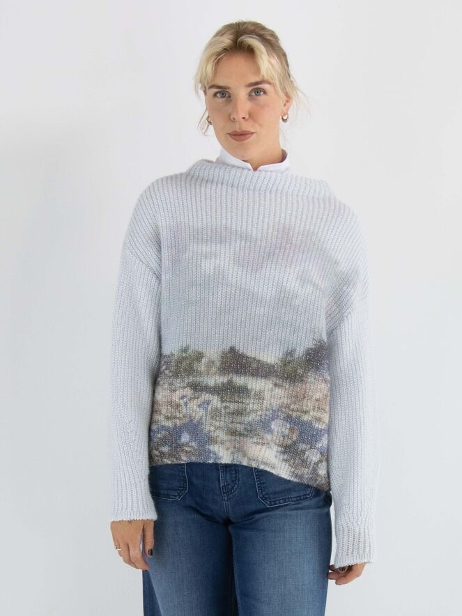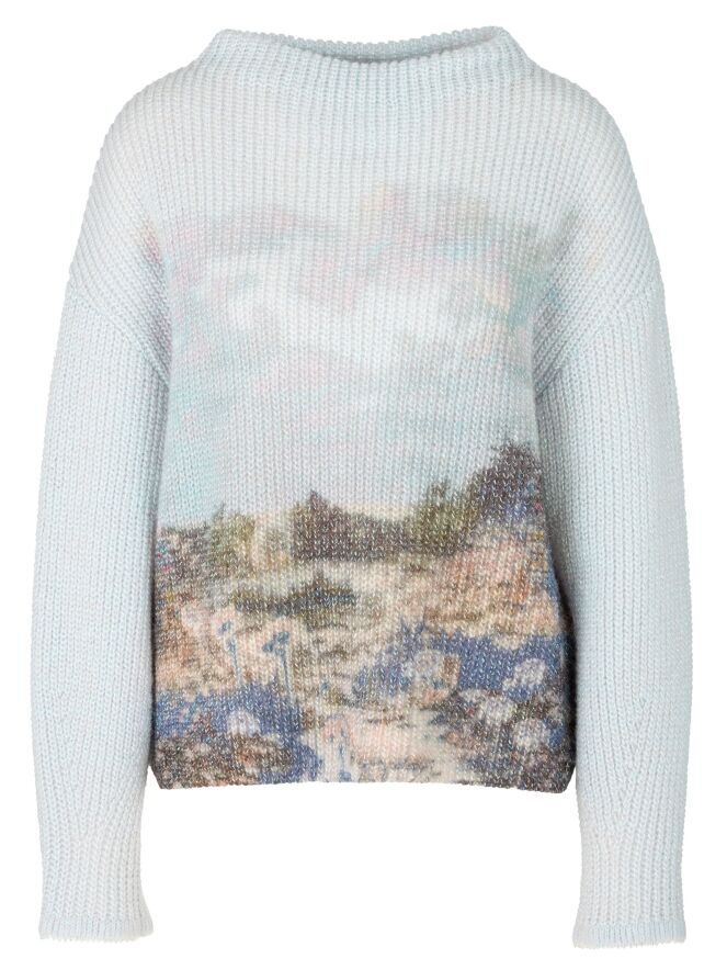 A pullover by Marc Cain, knitted in a fisherman's rib stitch, featuring a graphic landscape print in multiple colours on a light blue background. The pullover has a boat neckline and long sleeves. This pullover should be hand-washed.