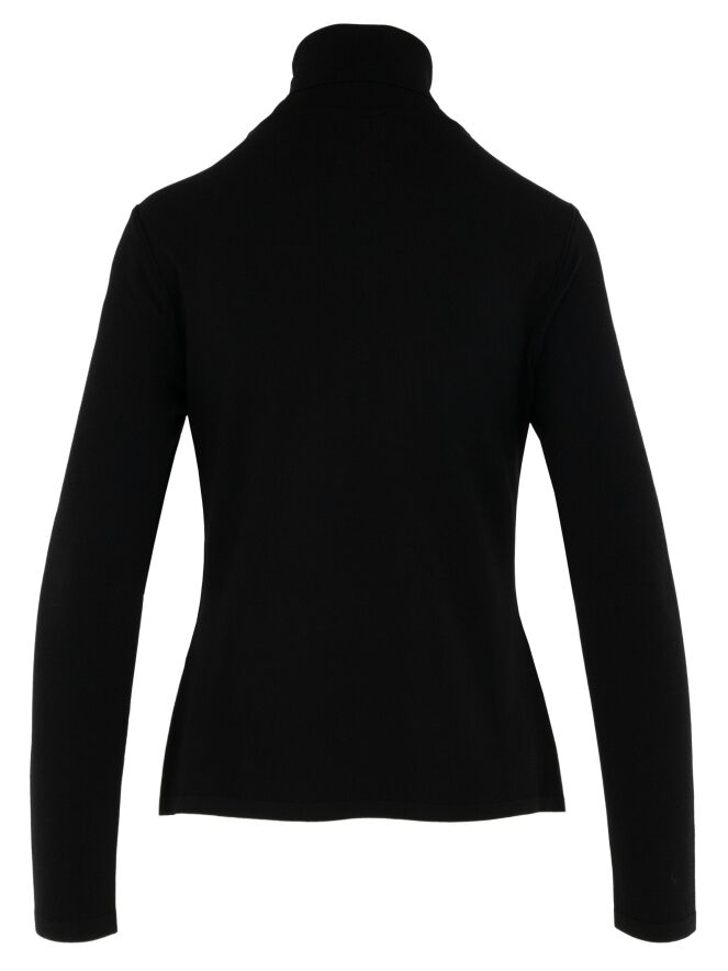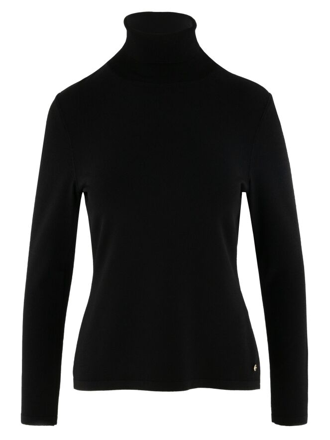 A fine-knit pullover by Marc Cain in black. The draped turtleneck is finely ribbed, and the pullover has long sleeves. This pullover can be washed at 30 degrees.