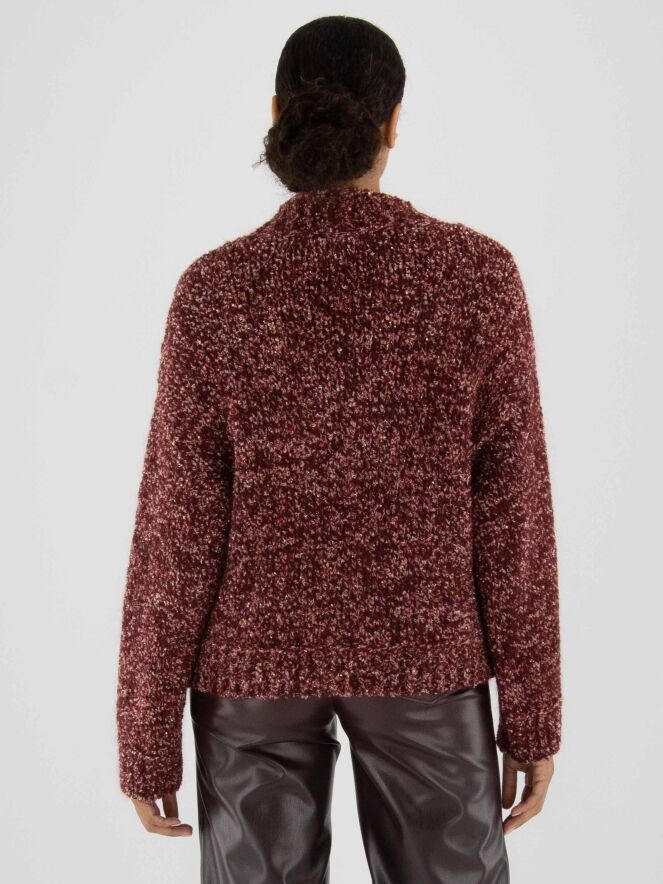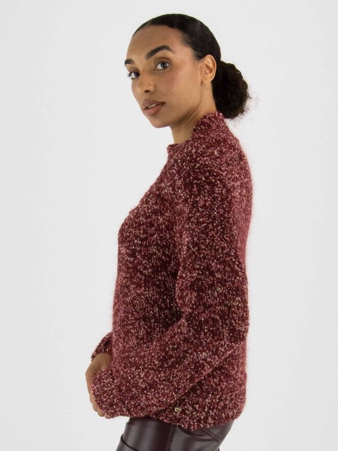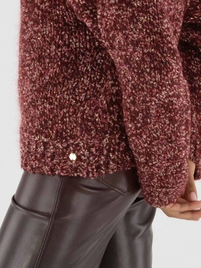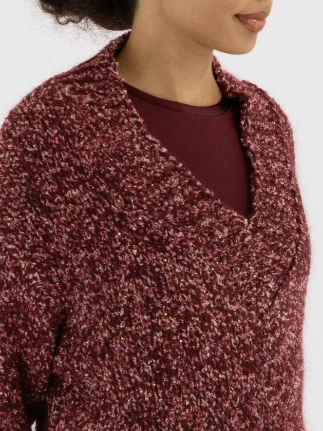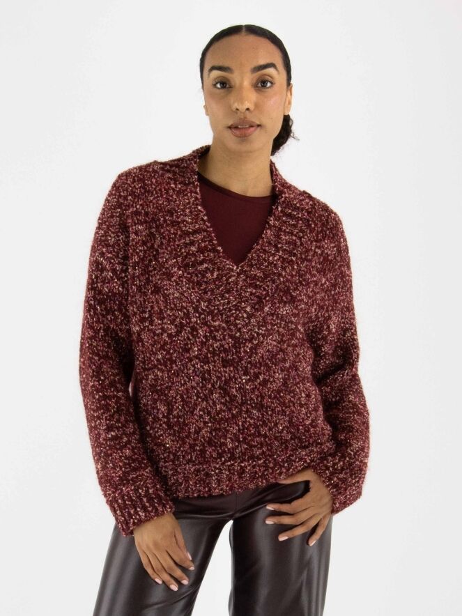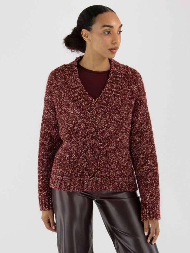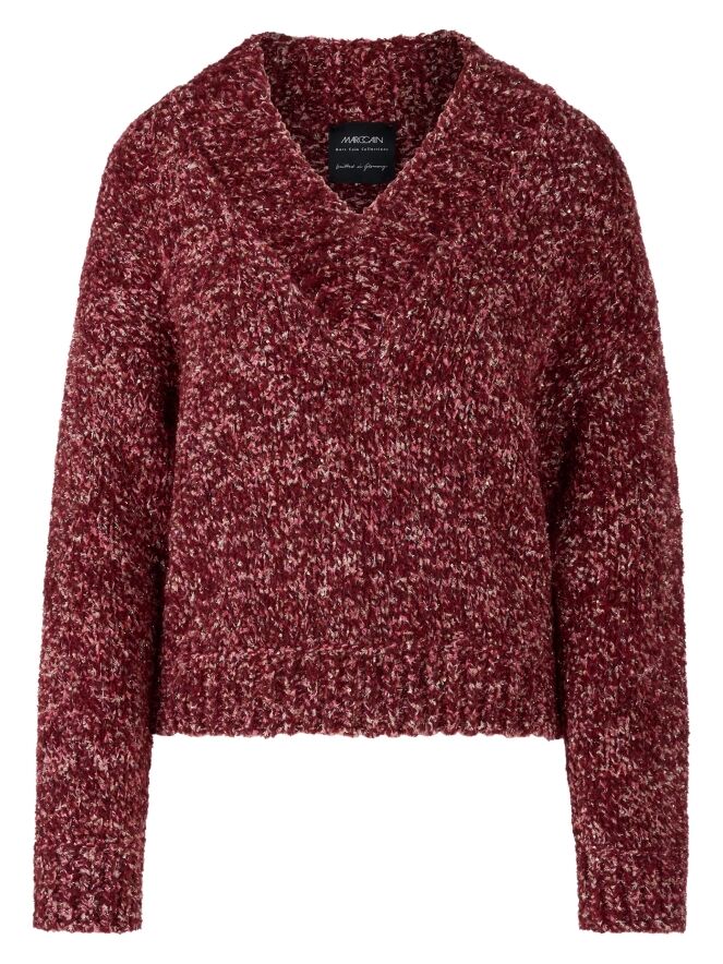 Luxurious marl pullover by Marc Cain in various shades of red with off-white. A gold thread is woven through the fabric. The pullover features a V-neckline and long sleeves. Hand wash only.