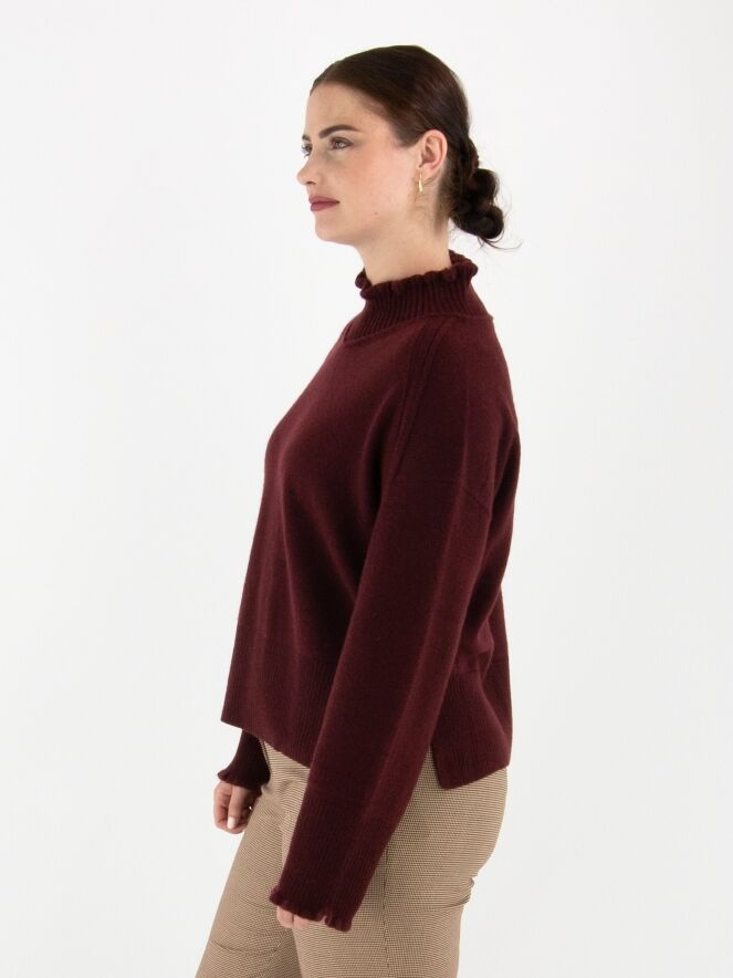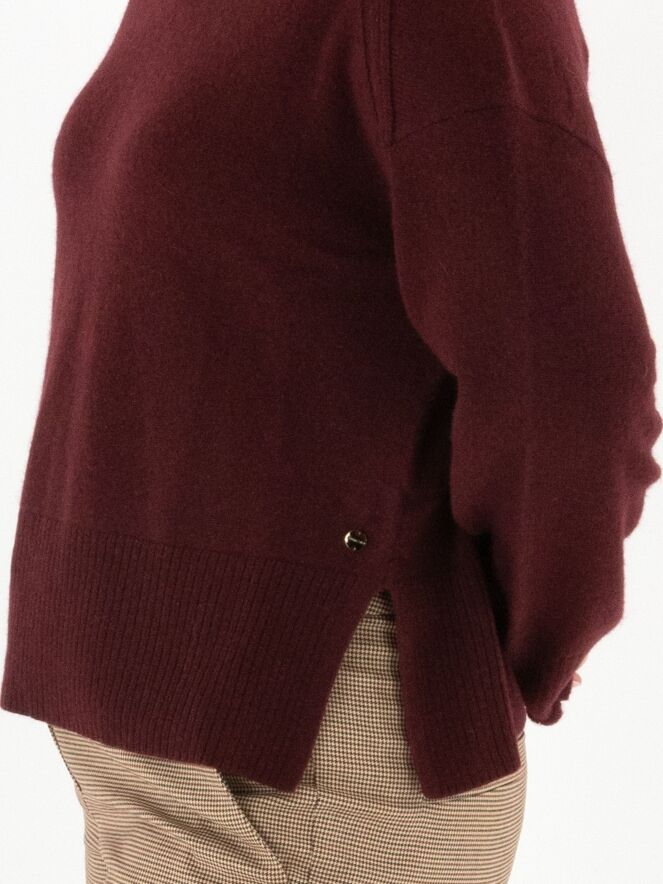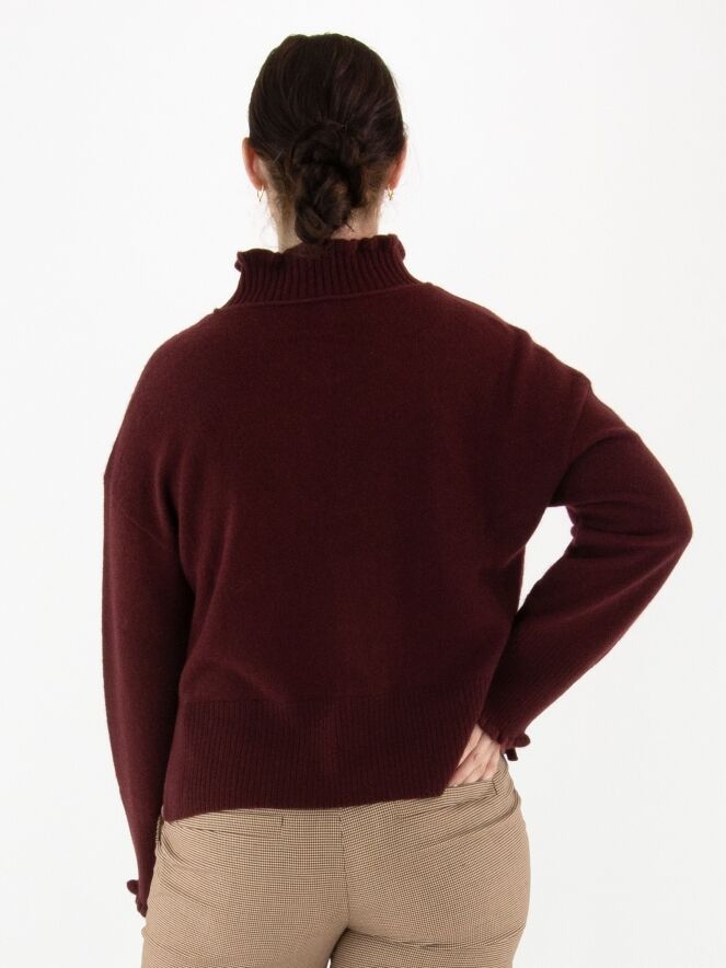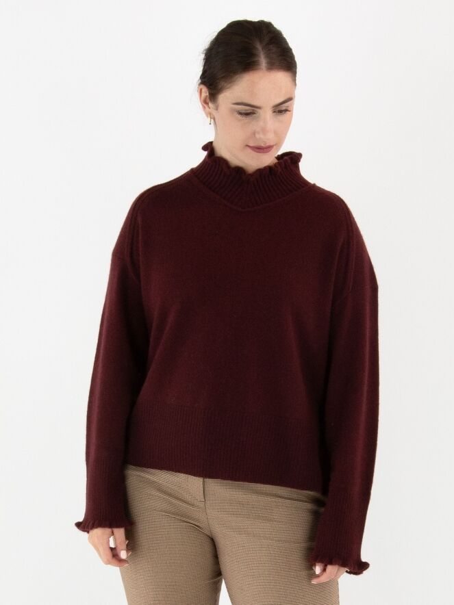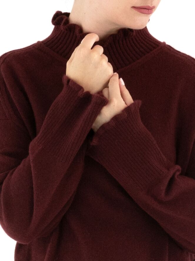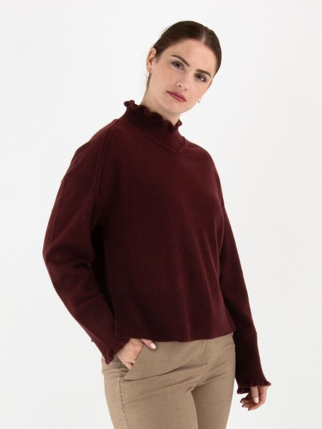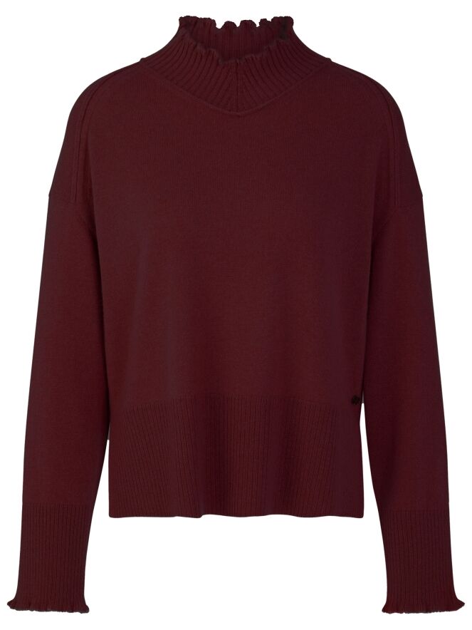 A pullover by Marc Cain in bordeaux red. It features a high, draped turtleneck with a chunky ribbed trim. The sleeve cuffs are smocked, and the hem is finished with a wide ribbed band. This pullover should be hand-washed.