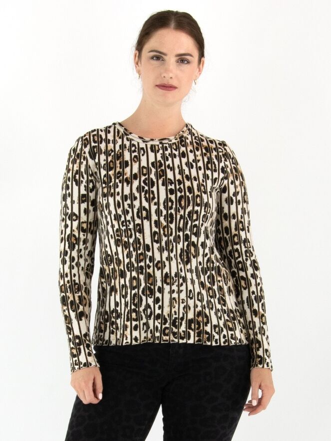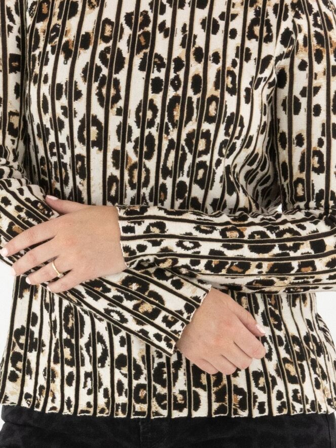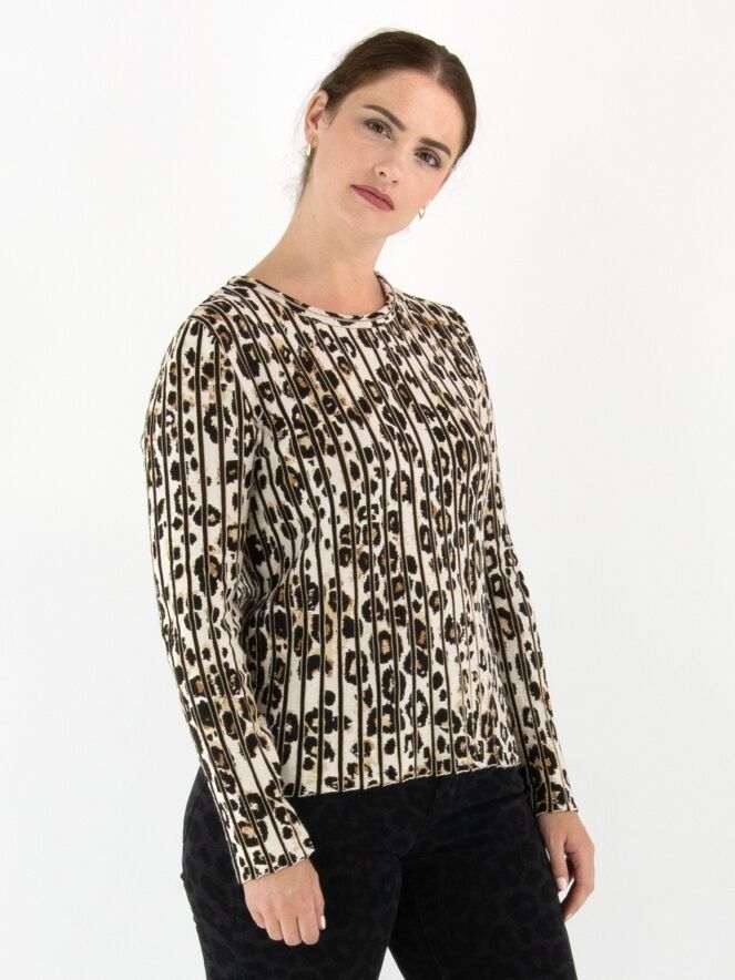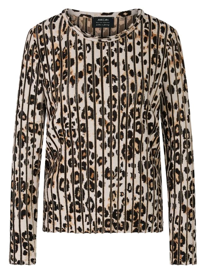 A pullover by Marc Cain featuring a leopard print in various shades of brown and black on a sand-coloured background. The print includes a vertical stripe pattern in black. The pullover has a round neckline and long sleeves. This pullover can be washed at 30 degrees.