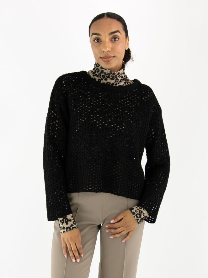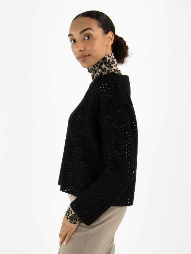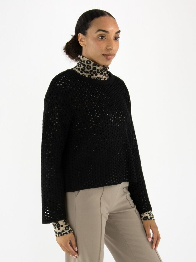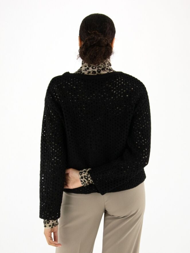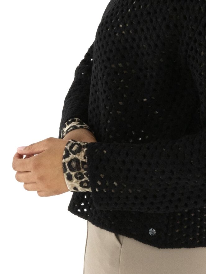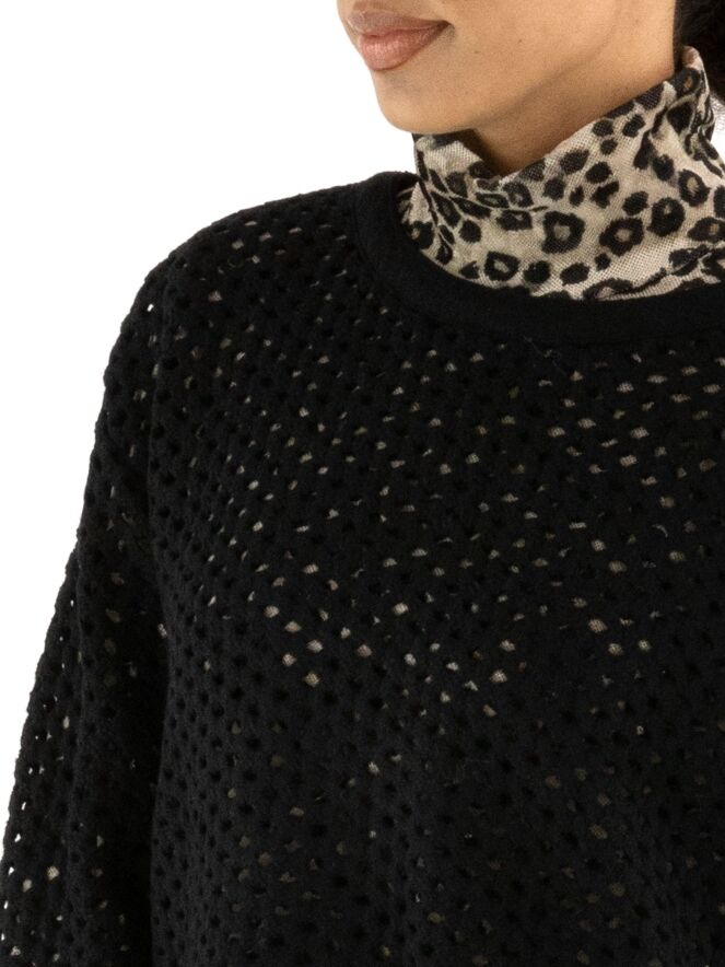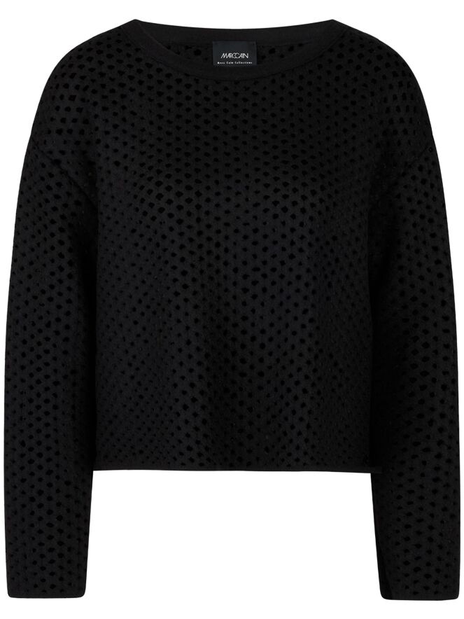 An open-knit pullover by Marc Cain in black. The pullover features a round neckline and long sleeves and must not be washed.