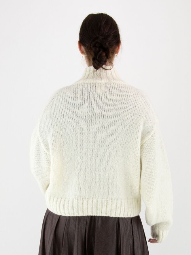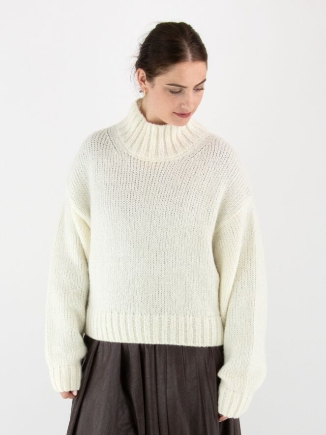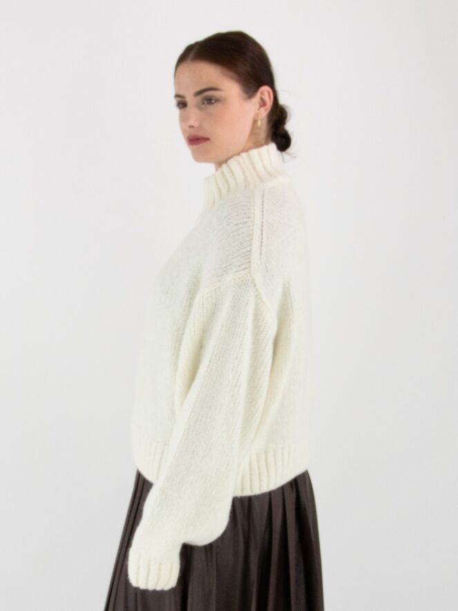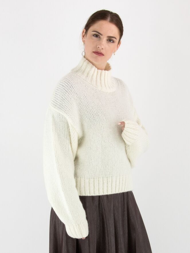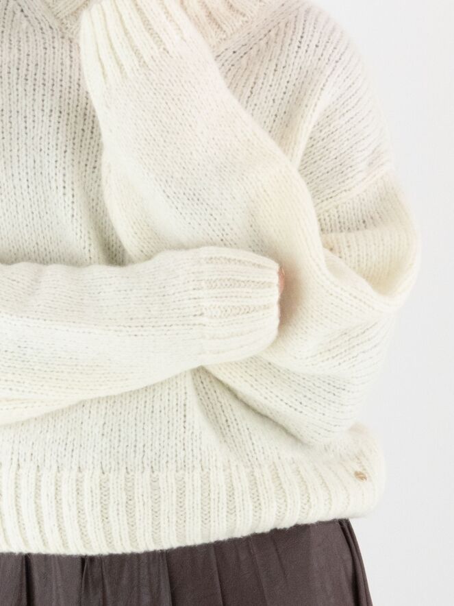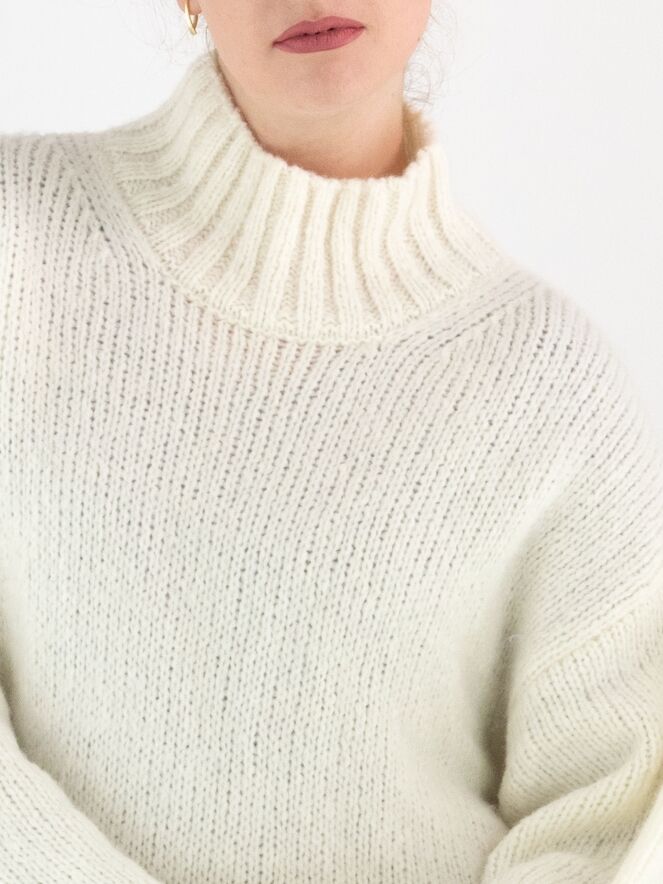 A pullover by Marc Cain in off-white. The edge of the turtleneck, the cuffs of the long sleeves, and the hem are finished with a chunky ribbed knit. This pullover should be hand-washed.