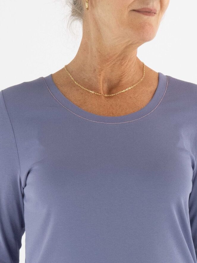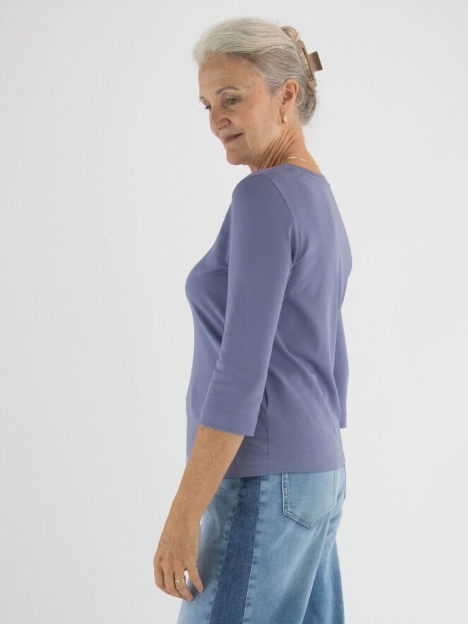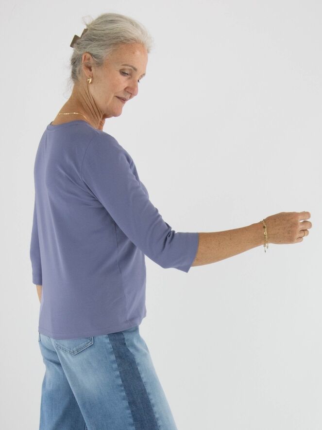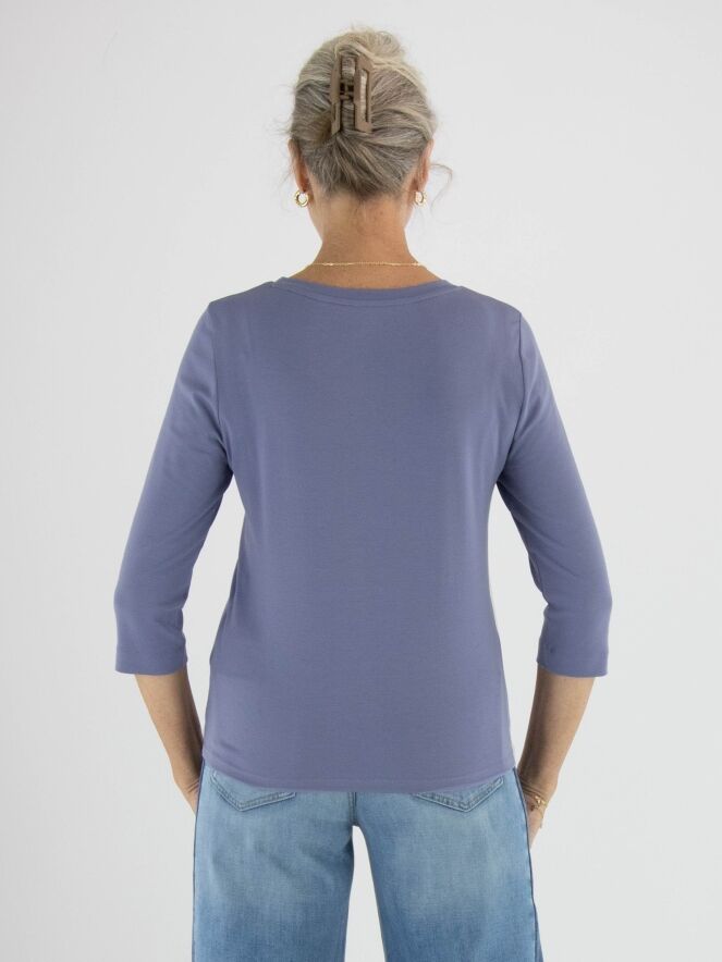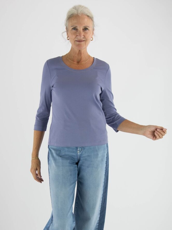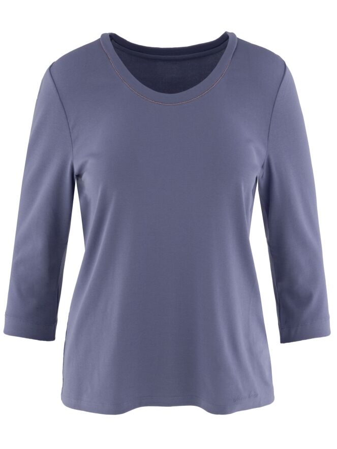 A lilac shirt by Marc Cain. The shirt features half-length sleeves and a round neckline. A rhinestone trim runs along the edge of the neckline. This shirt can be washed at 30 degrees.