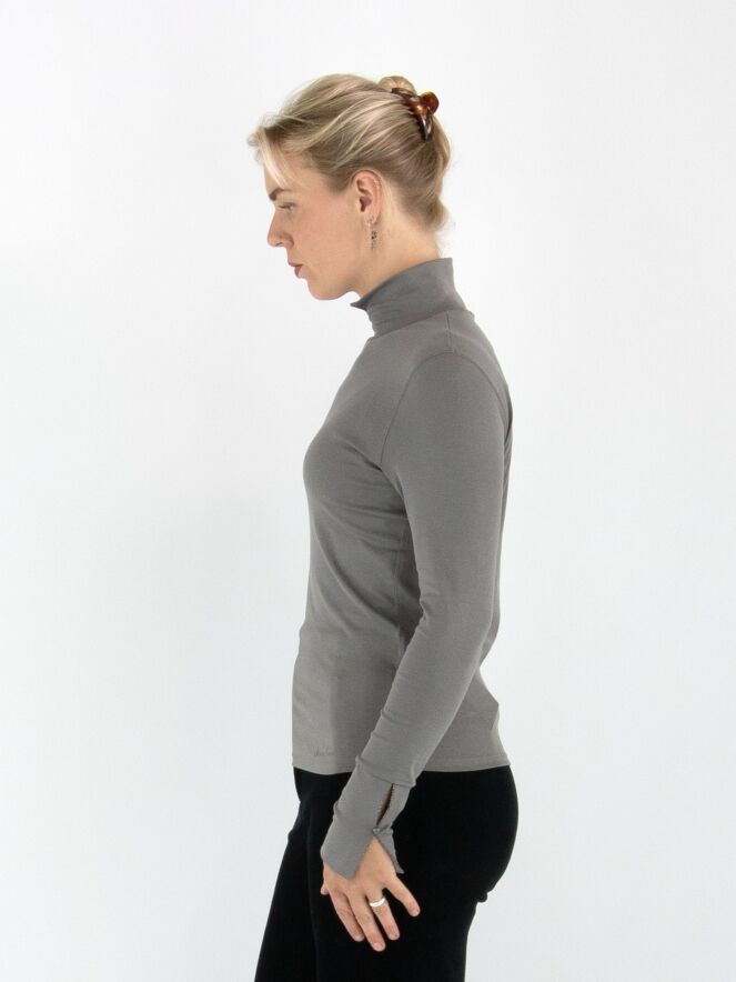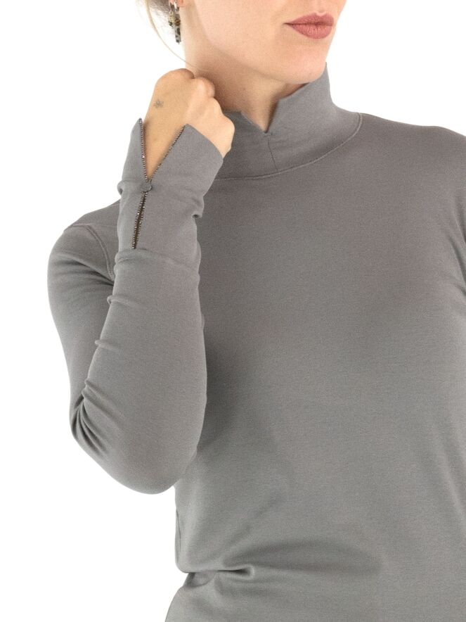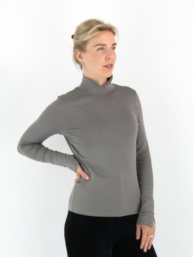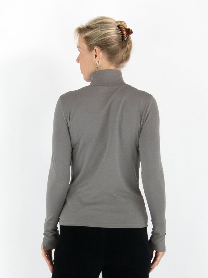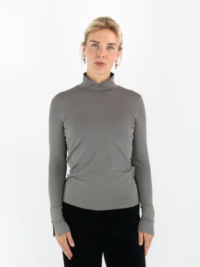 Marc Cain shirt in grey. It features long sleeves and a turtleneck with a front slit. This shirt can be washed at 30 degrees.