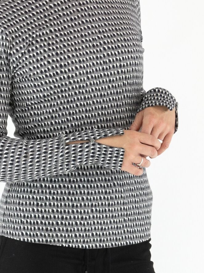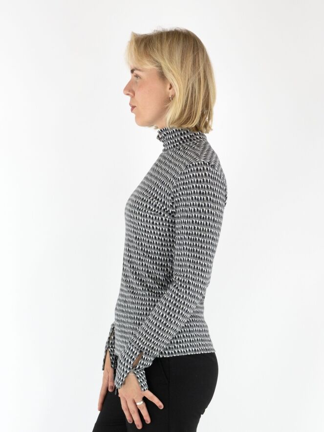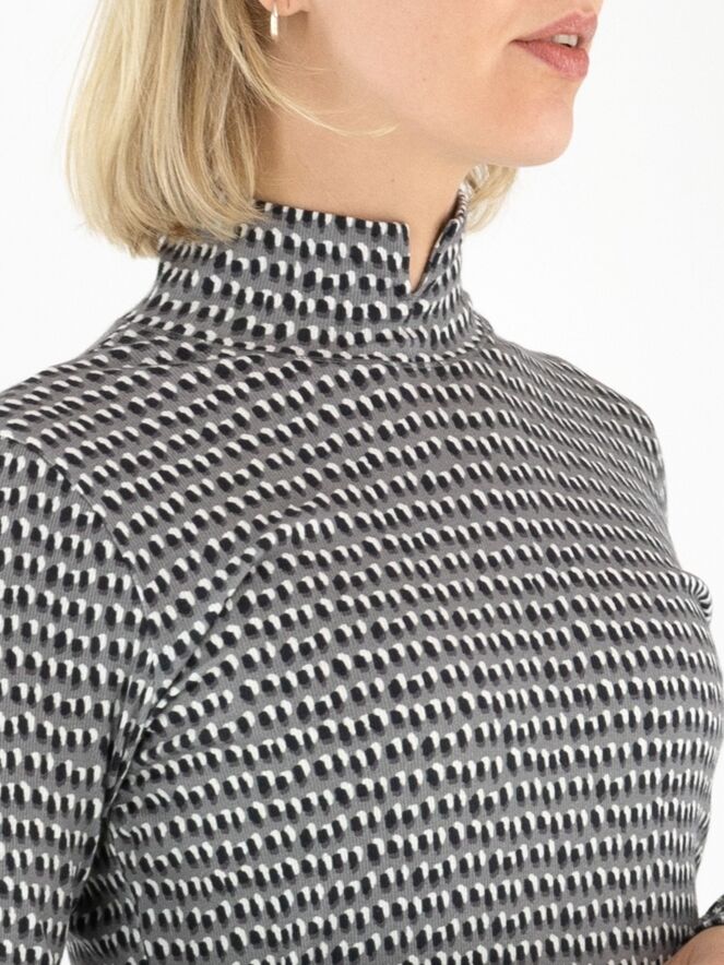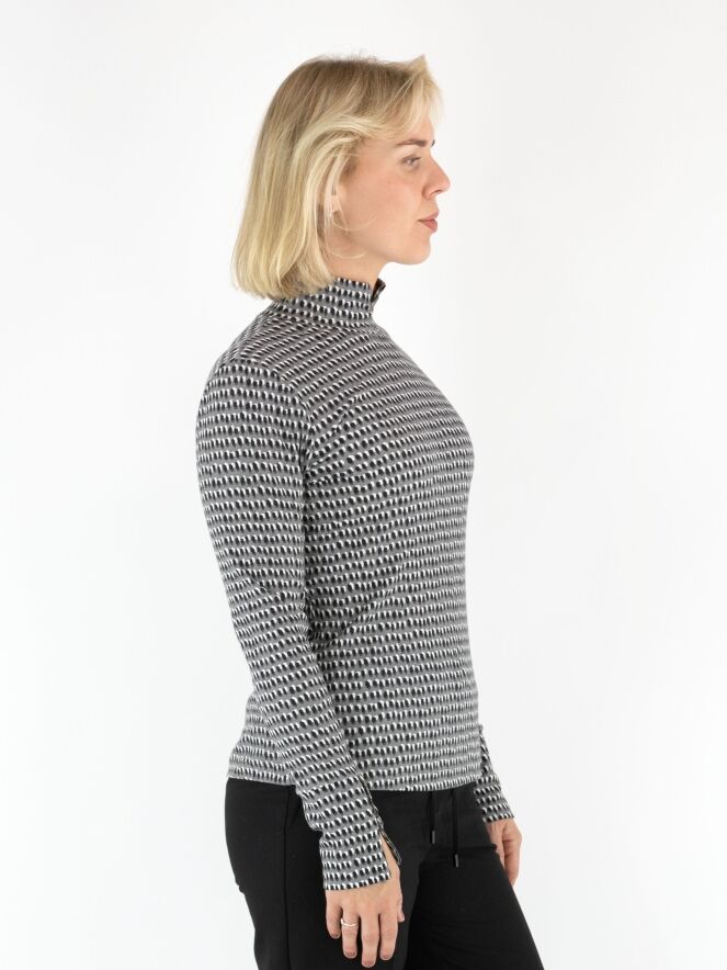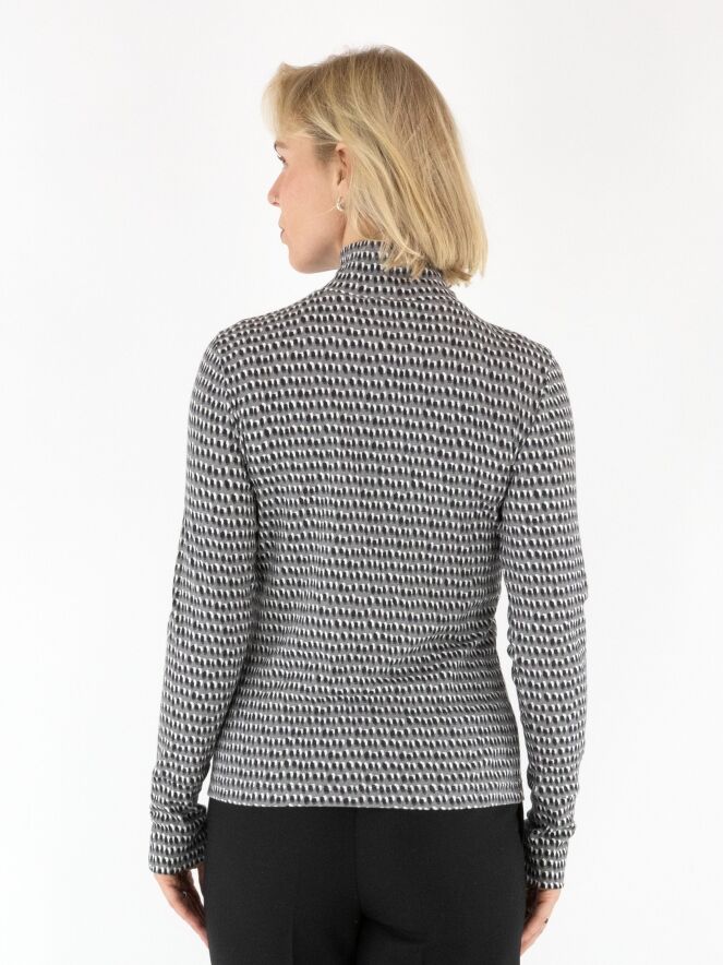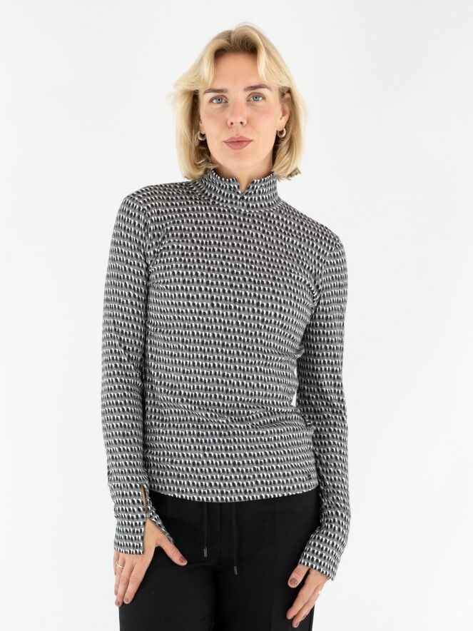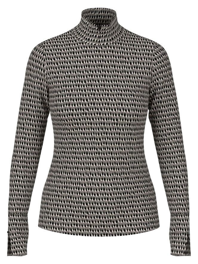 Marc Cain fine ribbed shirt in a polka dot print with black and off-white on a light grey background. The shirt features a turtleneck and long sleeves. This shirt can be washed at 30 degrees.
