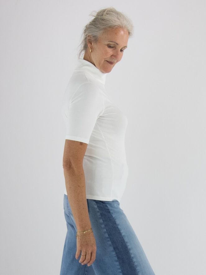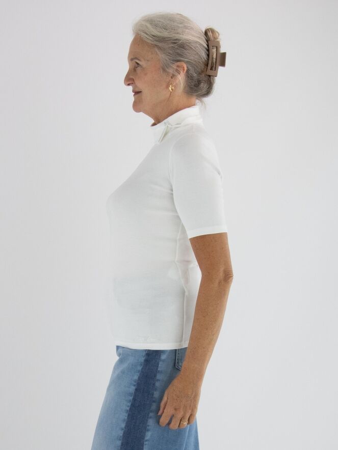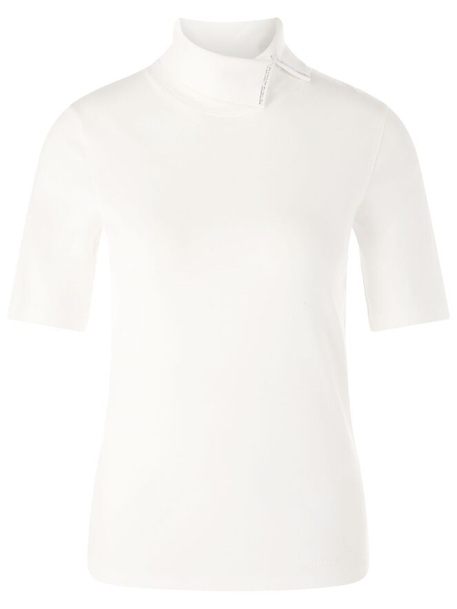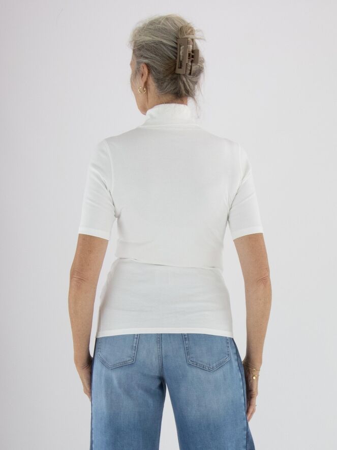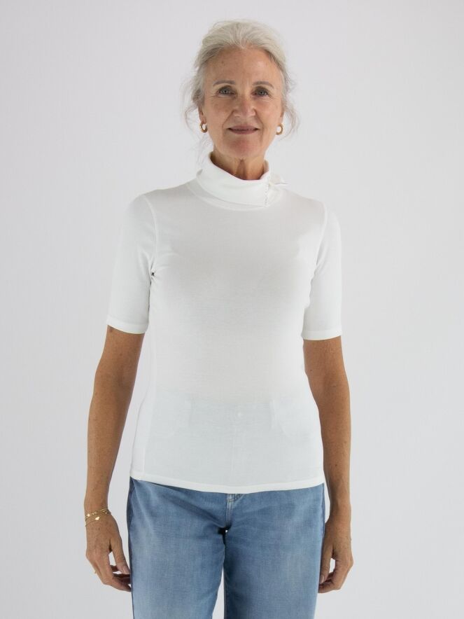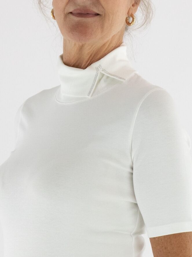 A shirt by Marc Cain in an off-white colour. It features short sleeves and a turtleneck with a front slit slightly left of centre. Along the edge of the slit are decorative rhinestones. This shirt can be washed at 30 degrees.