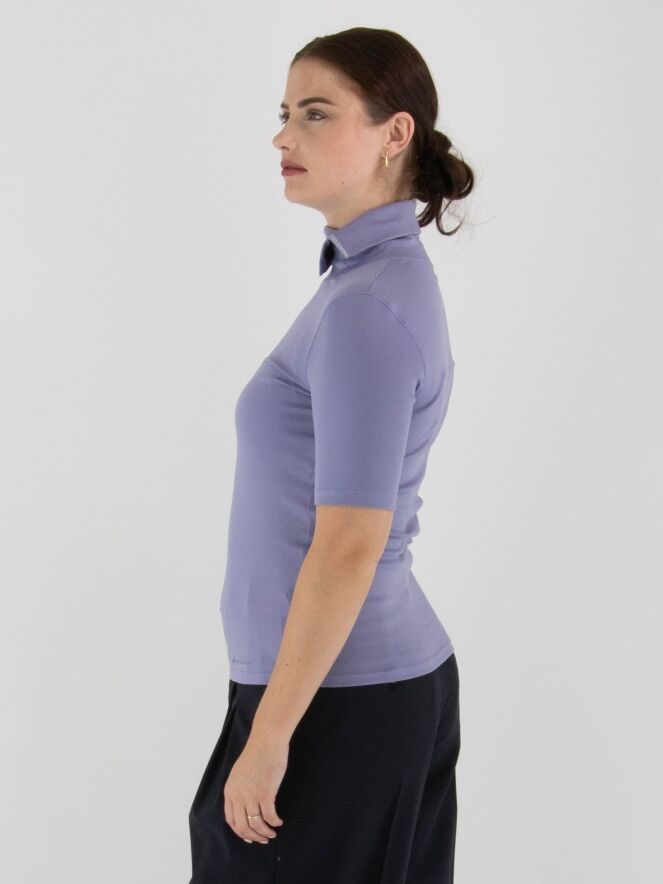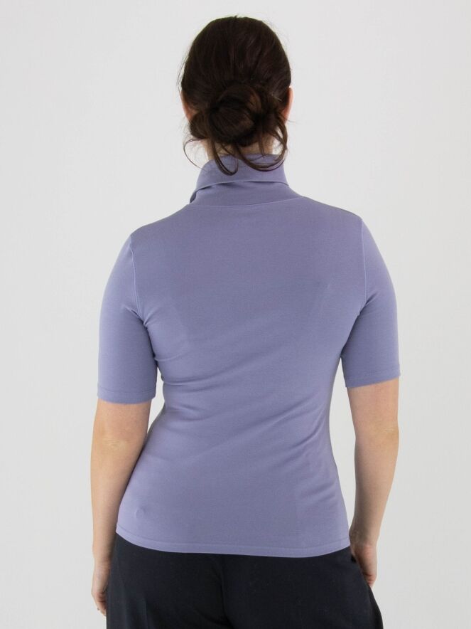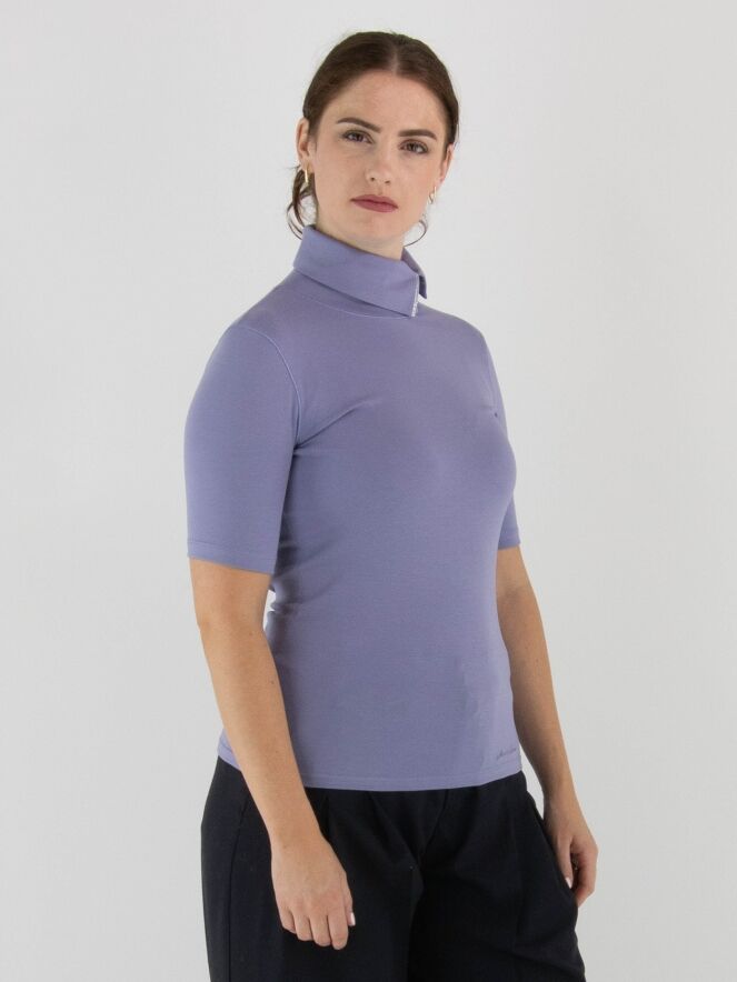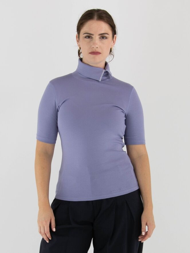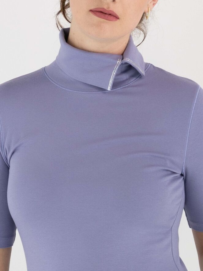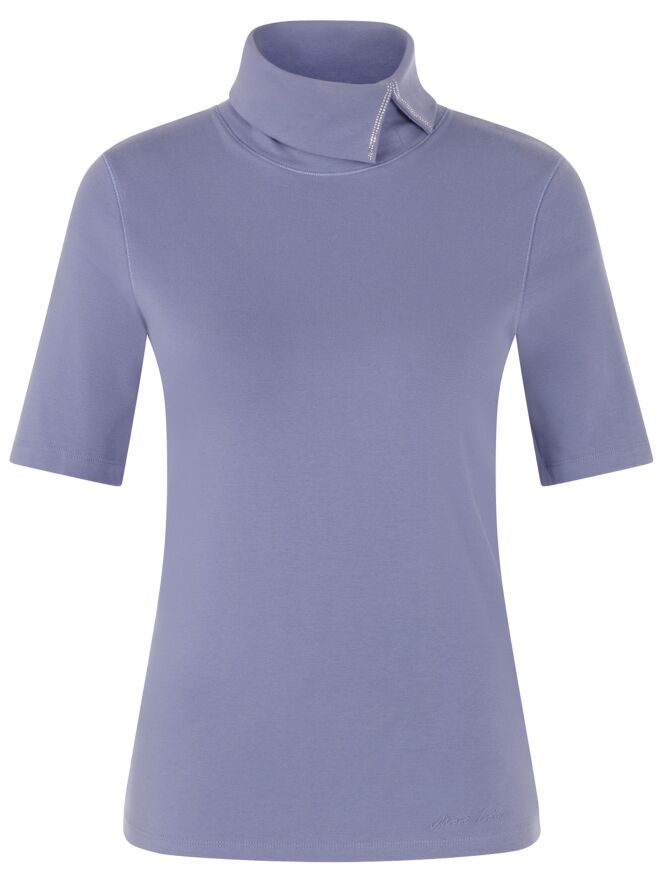 A shirt by Marc Cain in a lilac colour. The shirt has short sleeves and a turtleneck with a small slit on the left side of the front. Decorative rhinestones are placed along the edge of the slit. This shirt can be washed at 30 degrees.