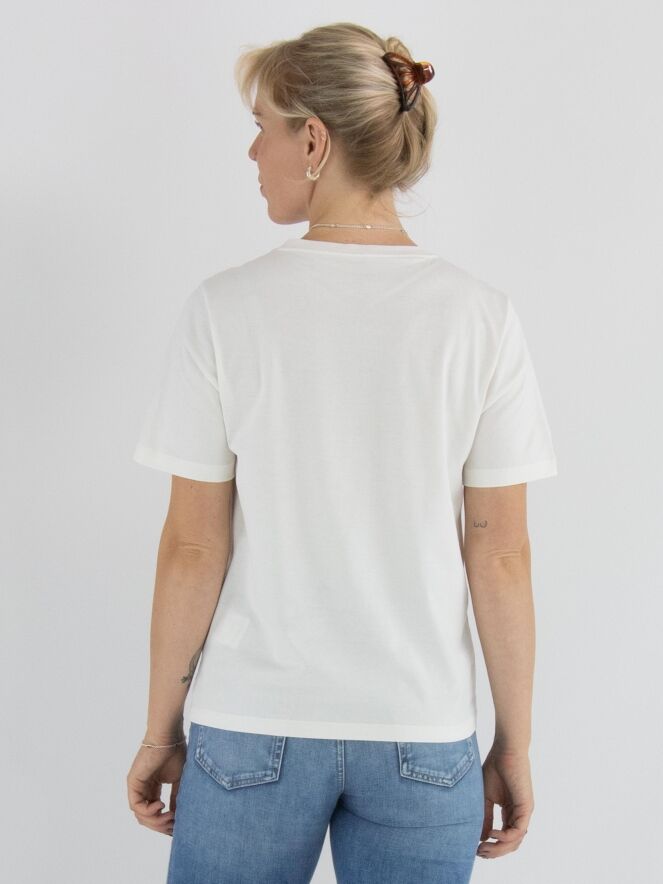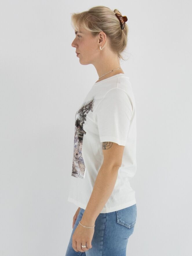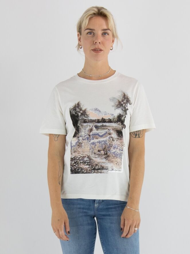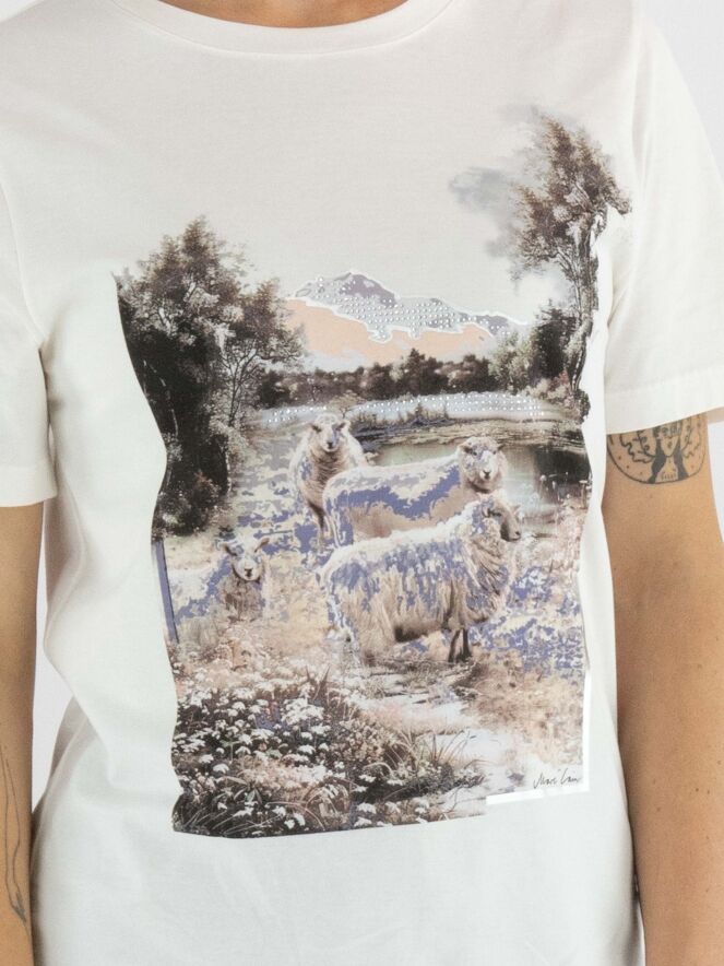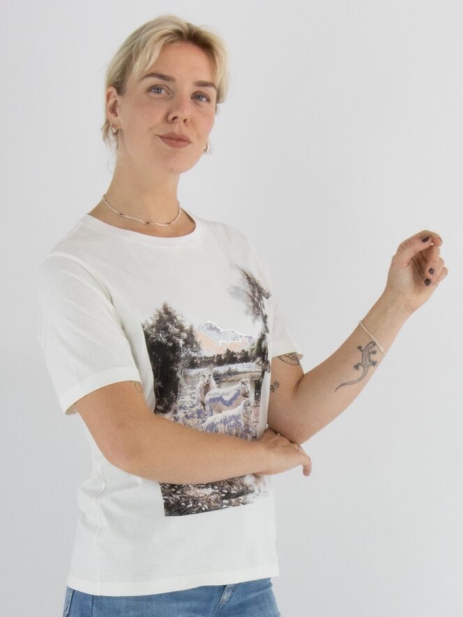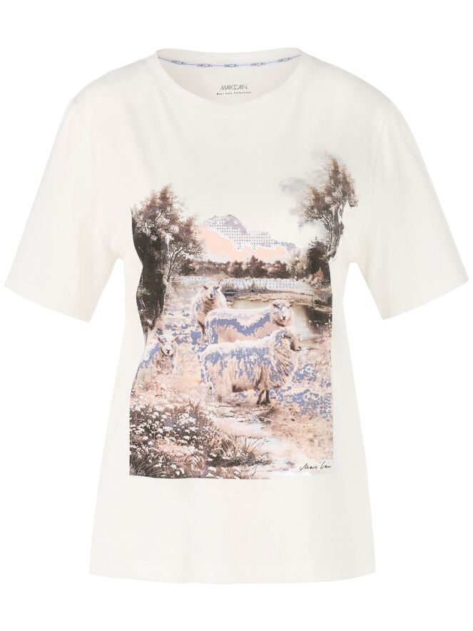A shirt by Marc Cain featuring a landscape print with sheep on the front. The print is done in lilac, brown and salmon pink on an off-white background. The shirt has a round neckline and short sleeves and can be washed at 30 degrees.