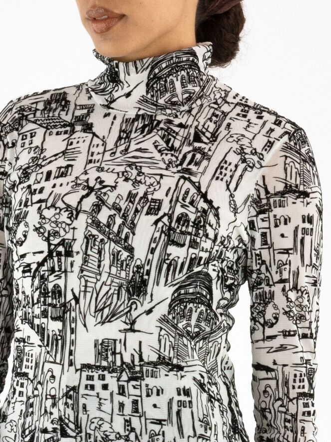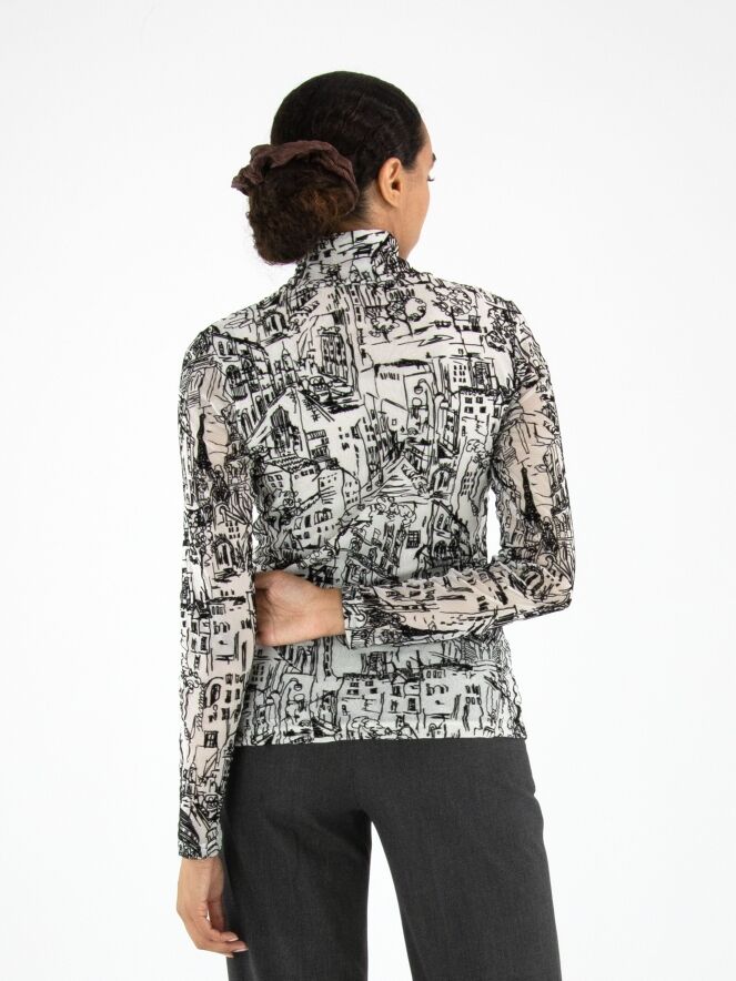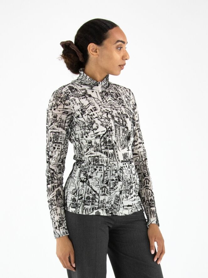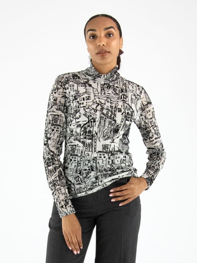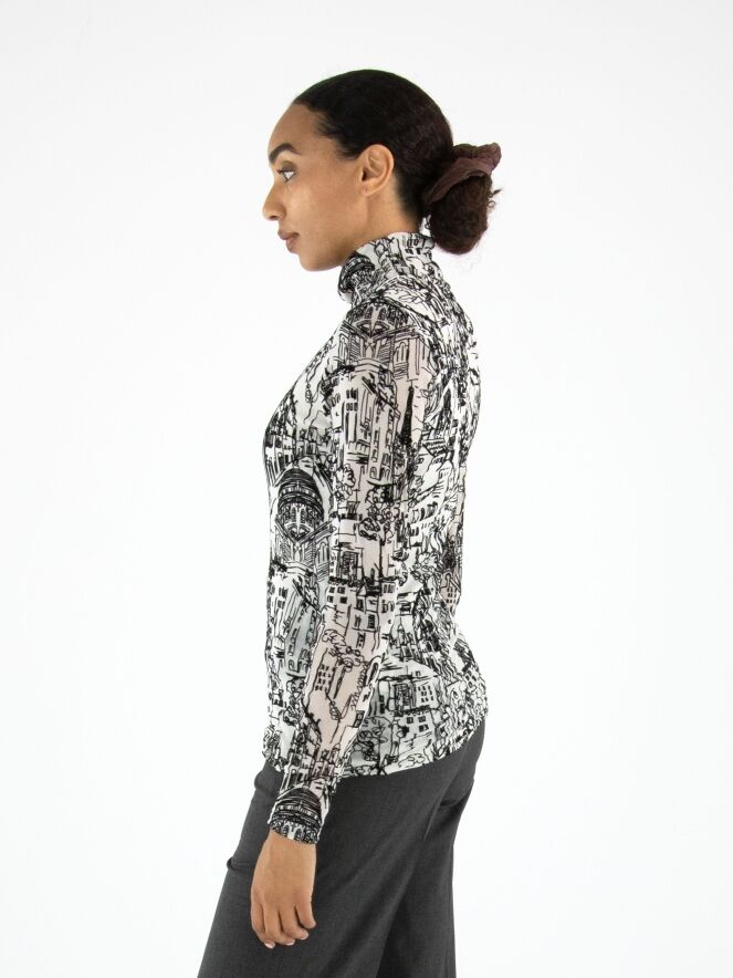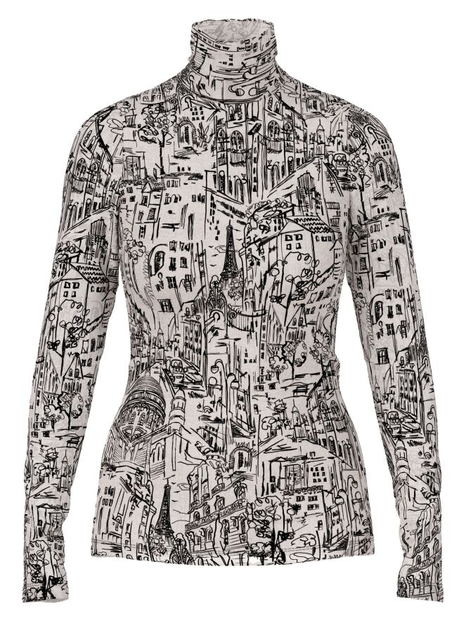 Semi-sheer Marc Cain shirt featuring a sketch print of the streets of Paris in black on a light grey background. Designed with a turtleneck and long sleeves. This shirt can be washed at 30 degrees.