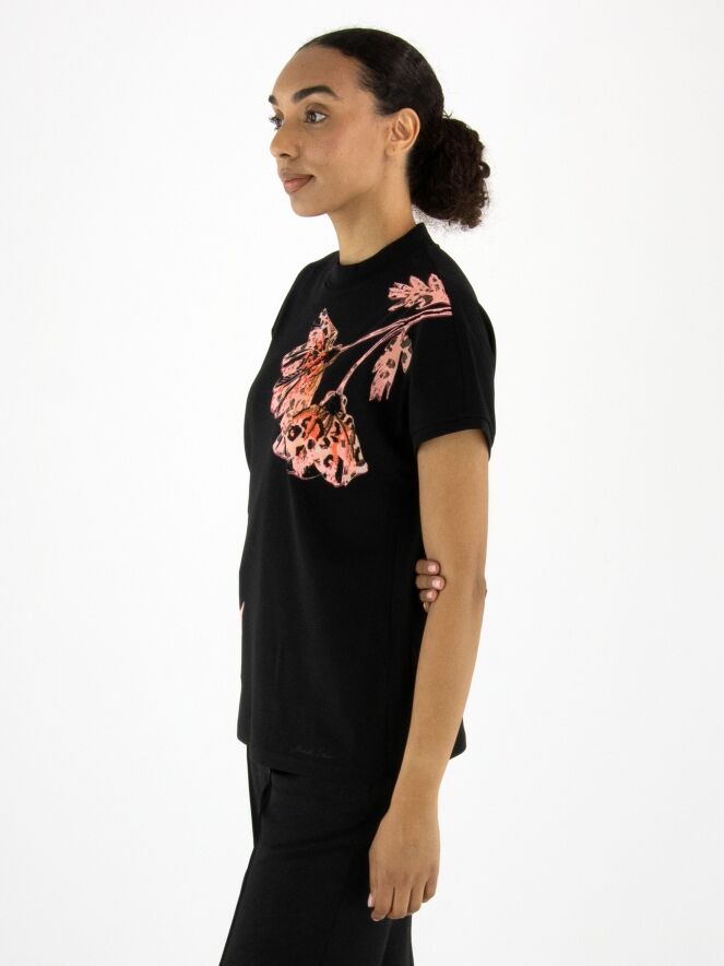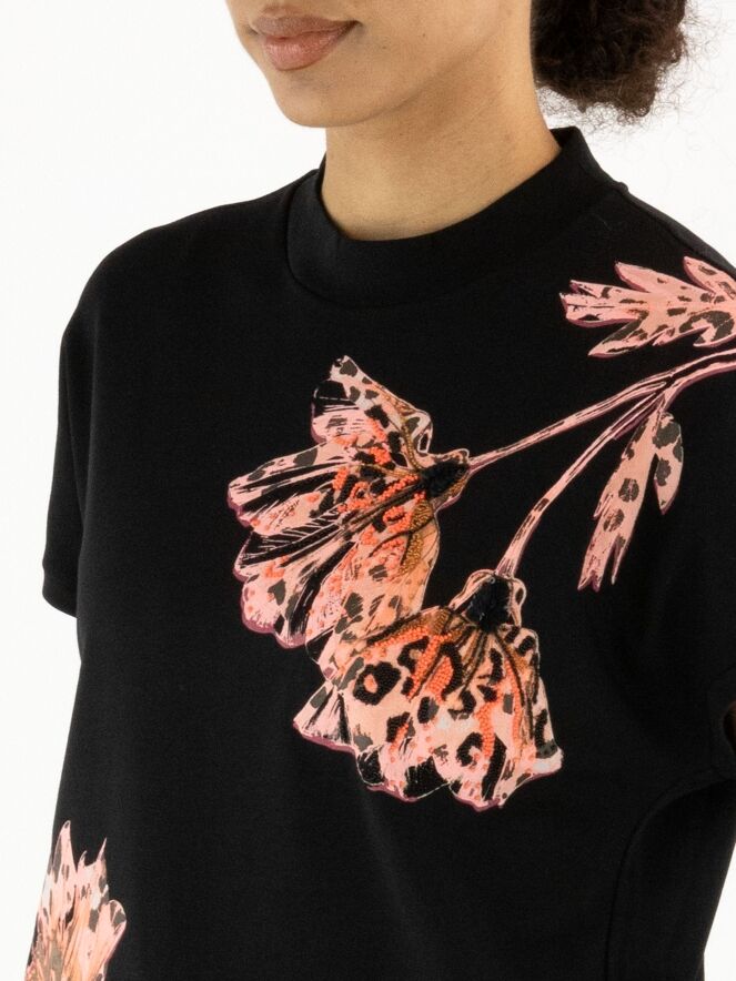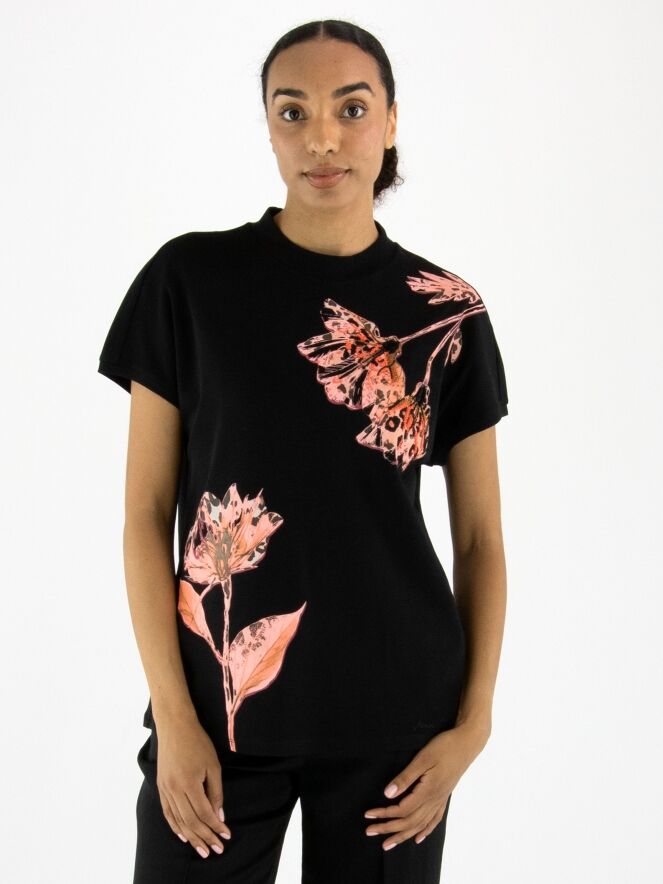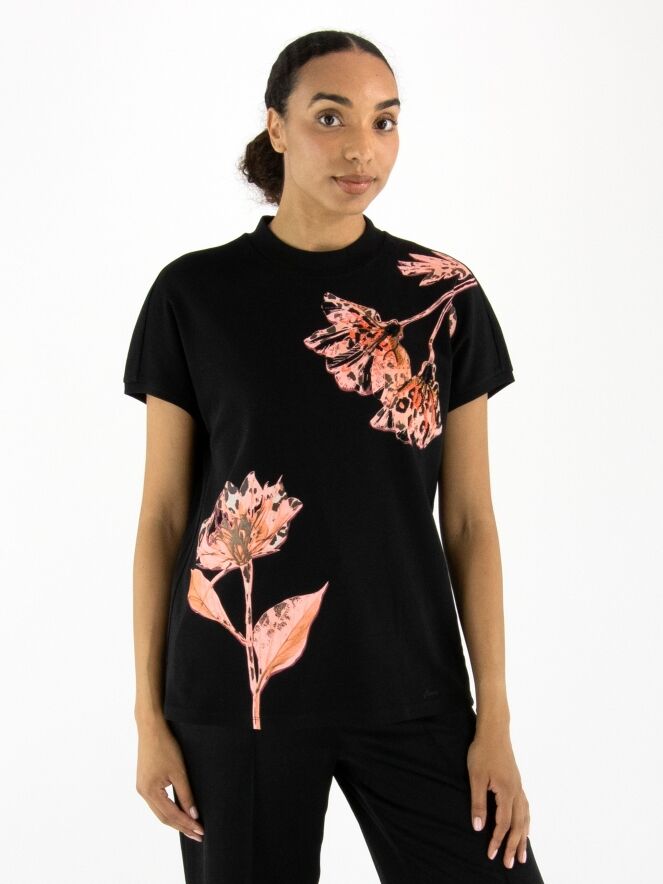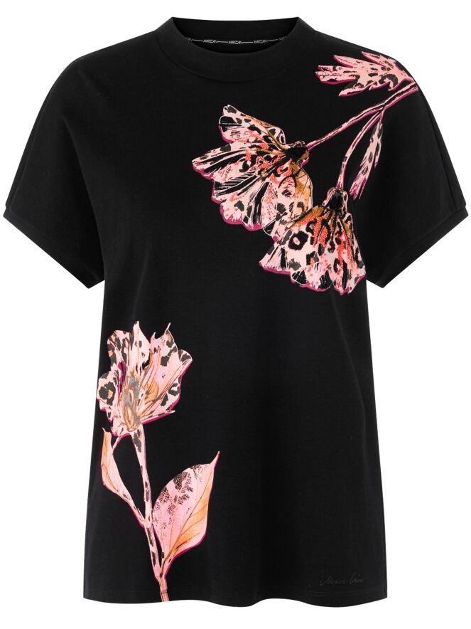 A Marc Cain shirt with a floral print in various shades of pink, brown, and black on a black background. The print is embellished with black and coral rhinestones. The shirt features cap sleeves and a round neckline. This shirt can be washed at 30 degrees.