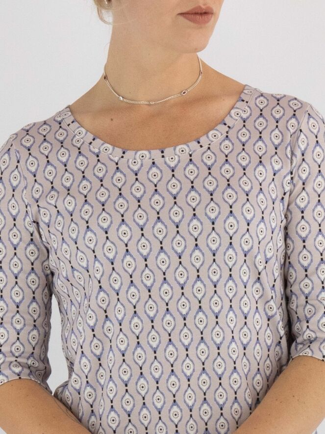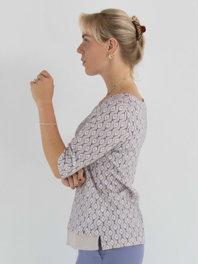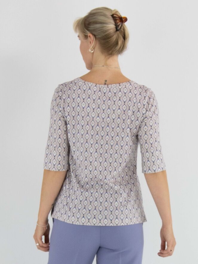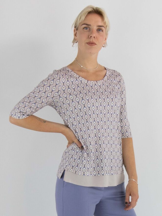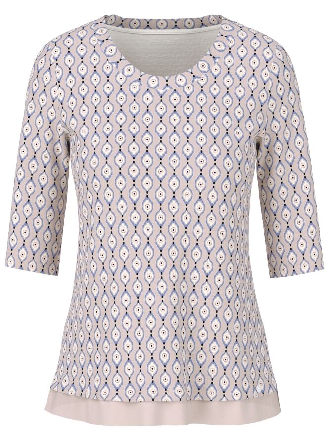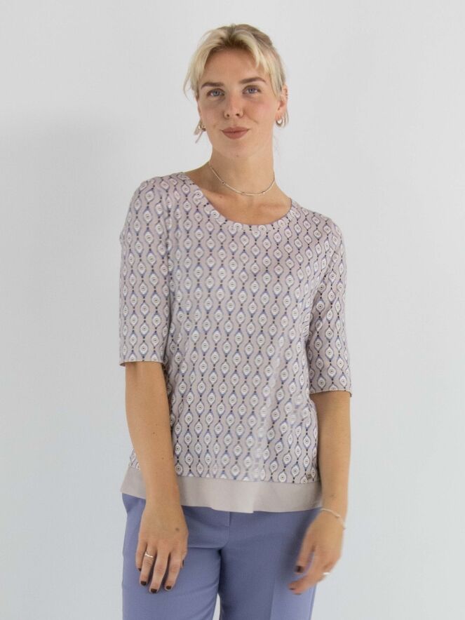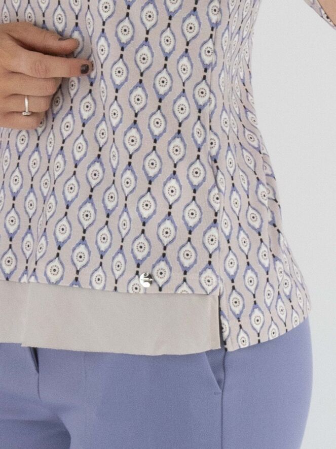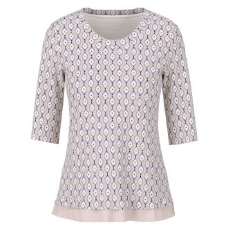 A shirt by Marc Cain featuring a graphic print in lilac, off-white and black on a pink background. At the front hemline, a wide voile trim in pink adds a delicate touch. The shirt has a round neckline and short sleeves. It can be washed at 30 degrees.