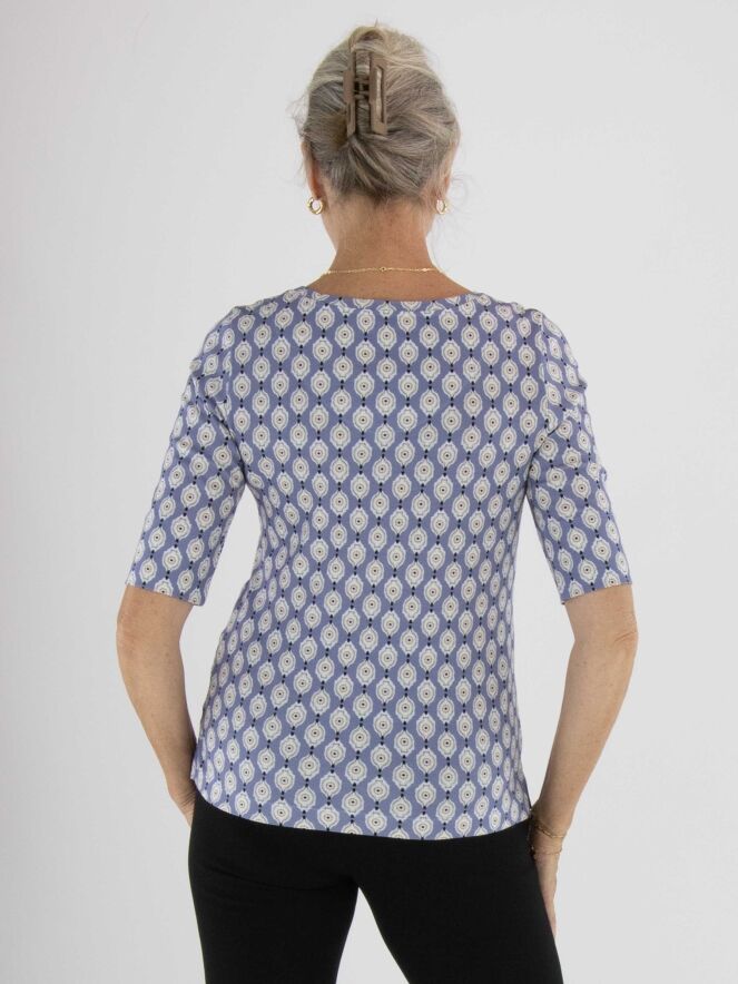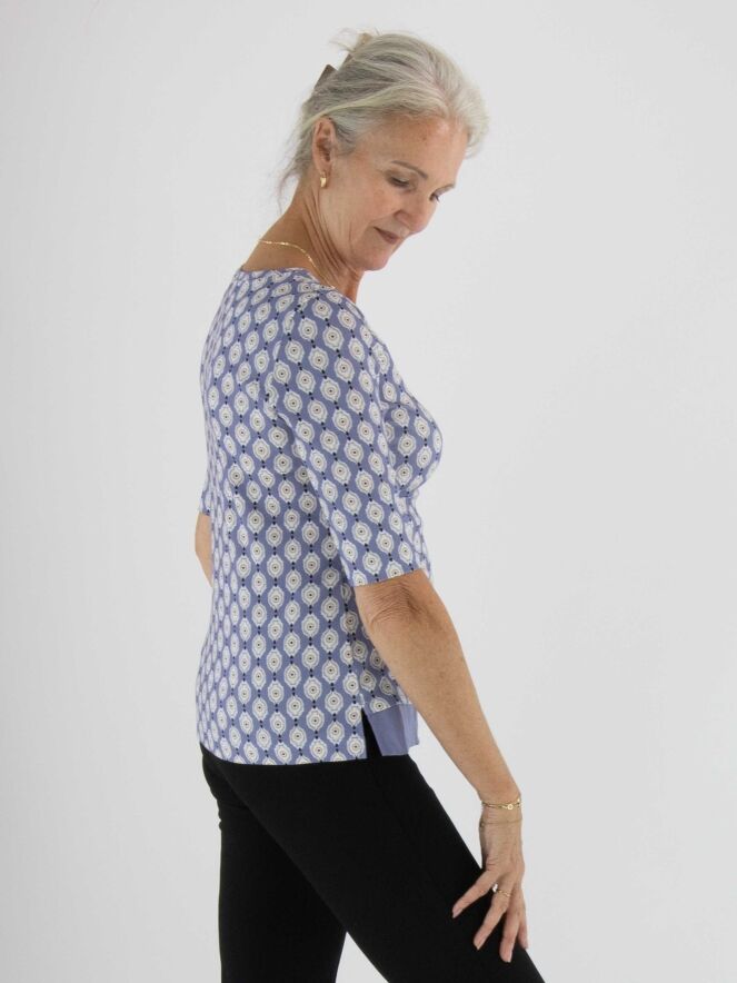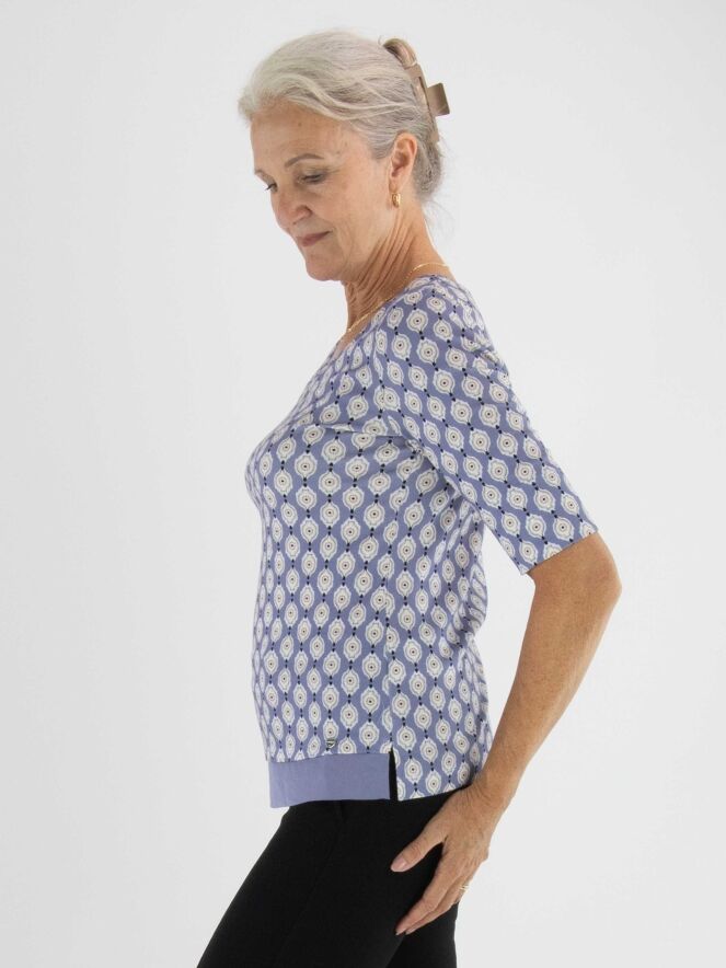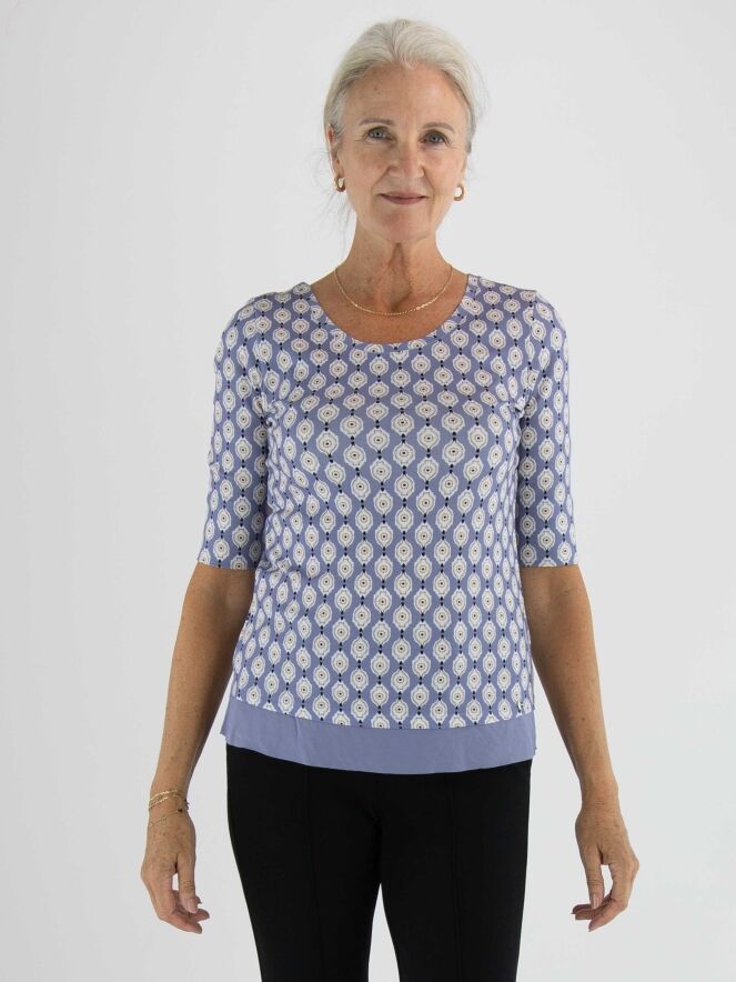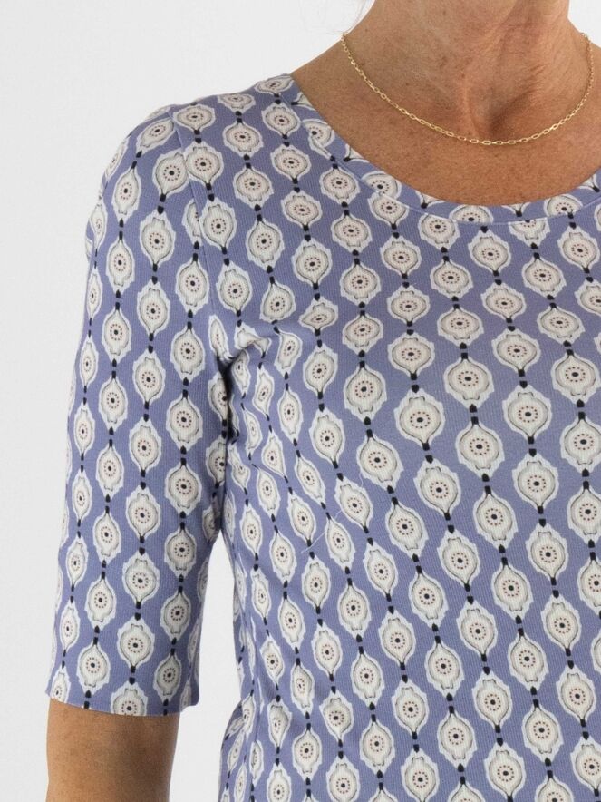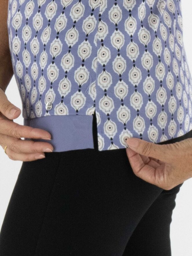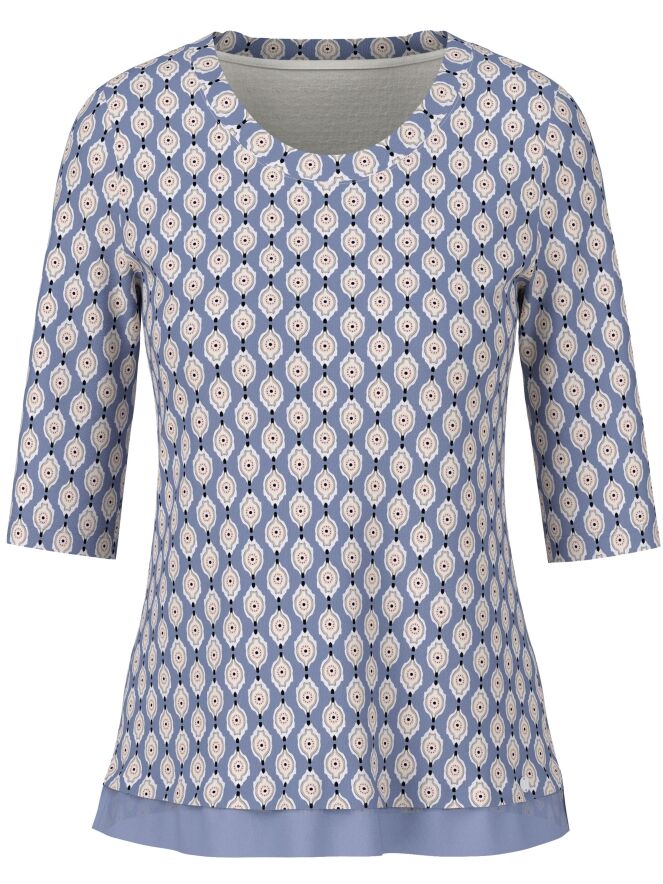 A shirt by Marc Cain with a graphic print in beige, pink, off-white and black on a lilac background. At the front hemline, a wide voile trim in pink adds a soft detail. The shirt features a round neckline and short sleeves. It can be washed at 30 degrees.