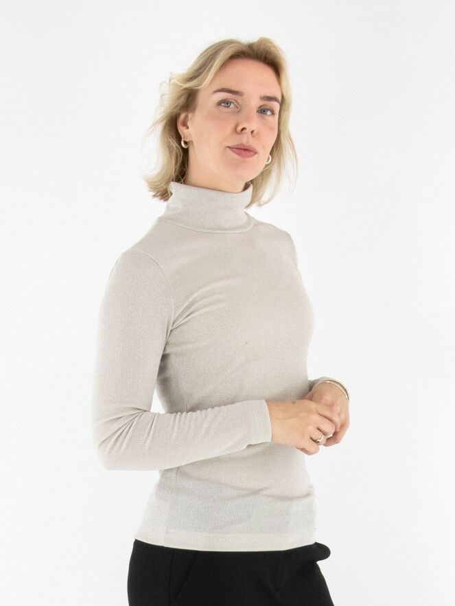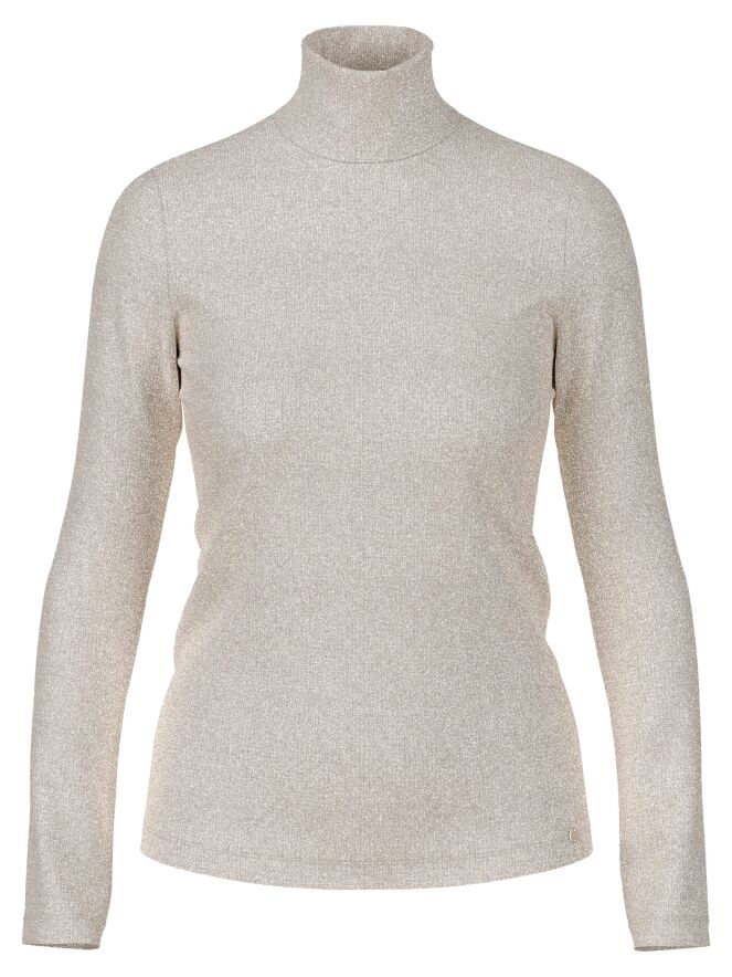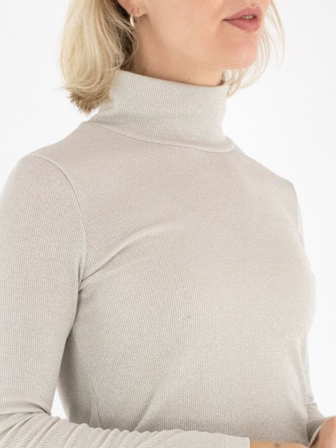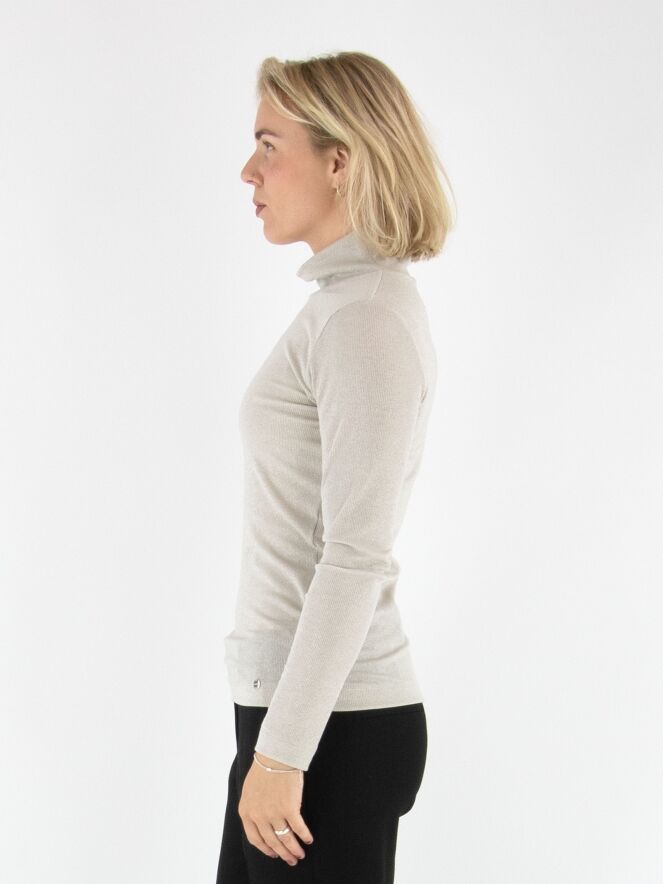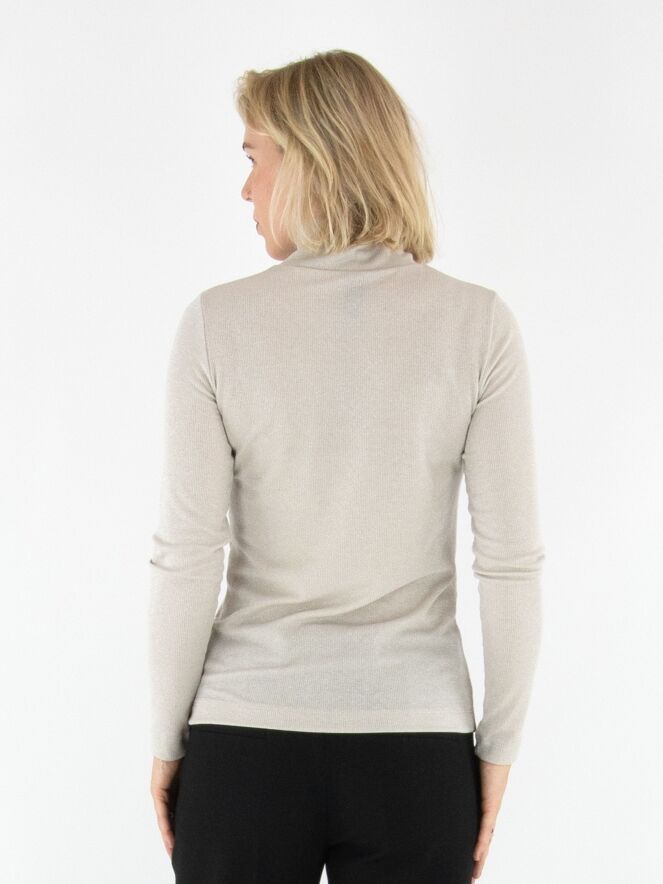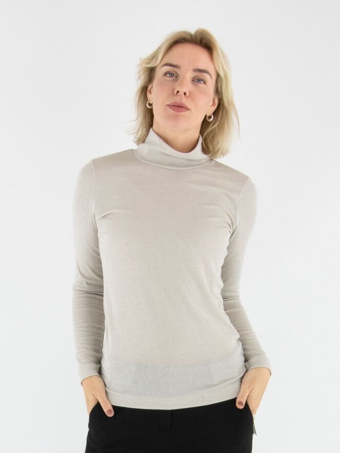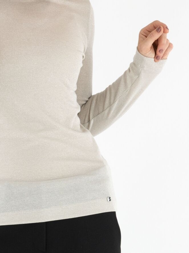 Marc Cain pullover in a fine ribbed texture in light grey. A subtle silver thread is woven through the fabric. The pullover features a relaxed cowl neck and long sleeves. This pullover can be washed at 30 degrees.