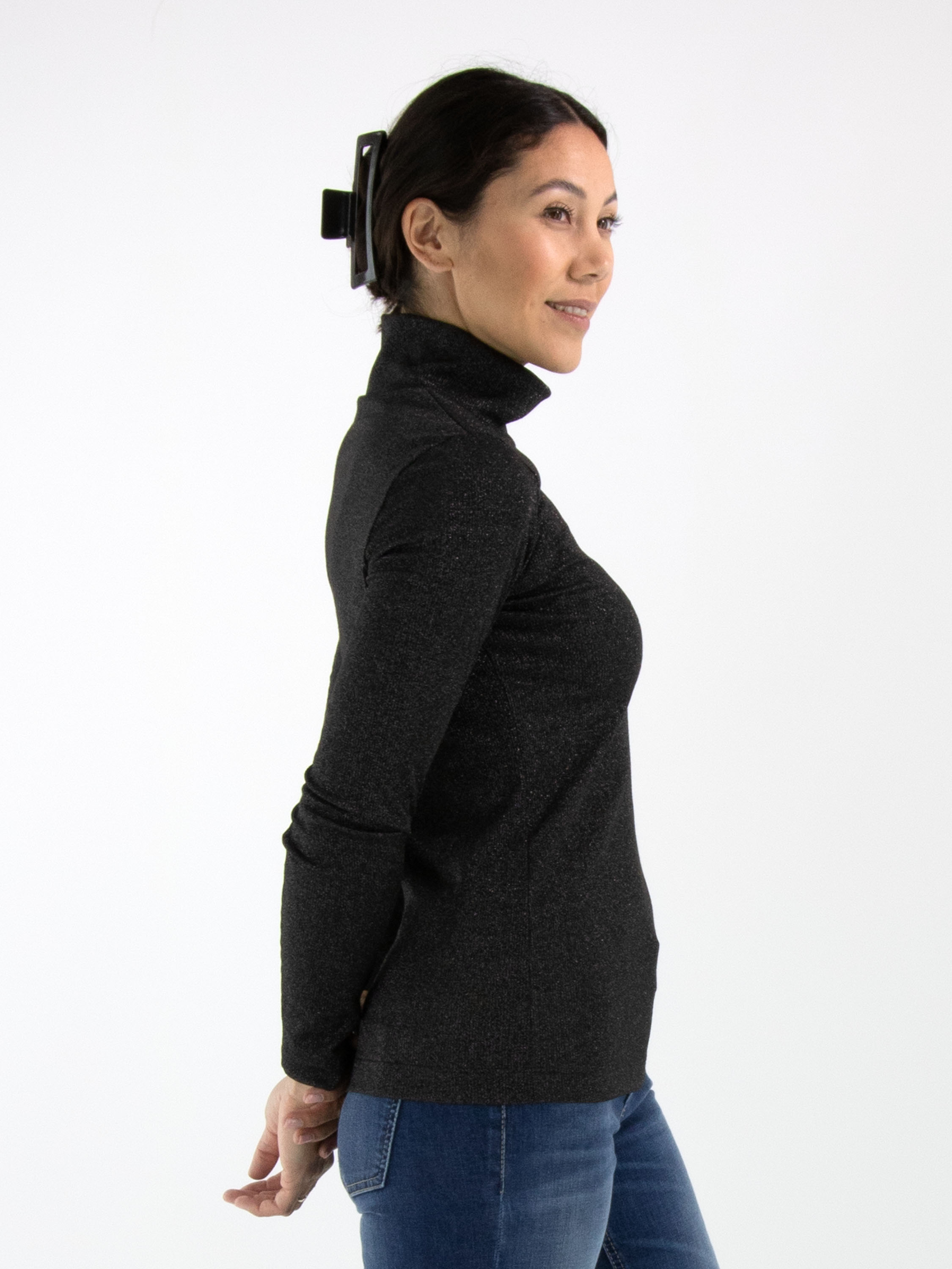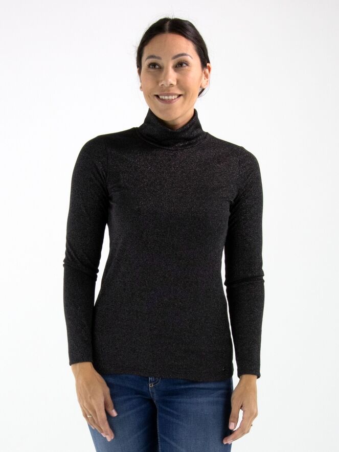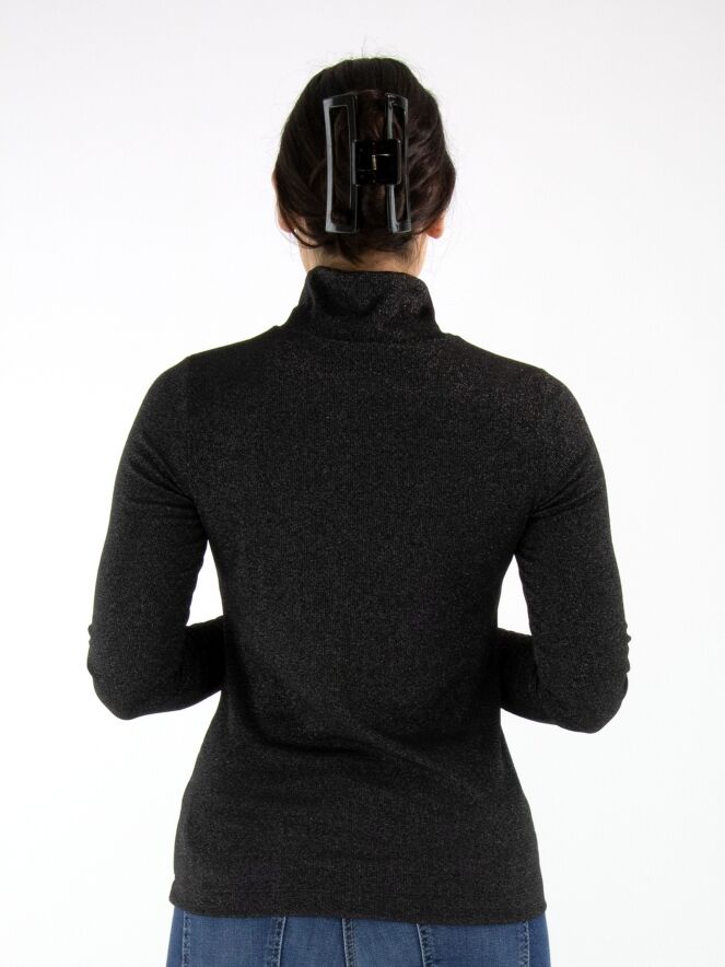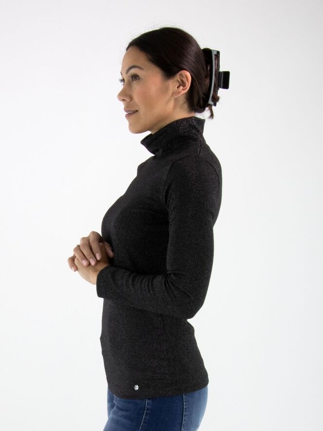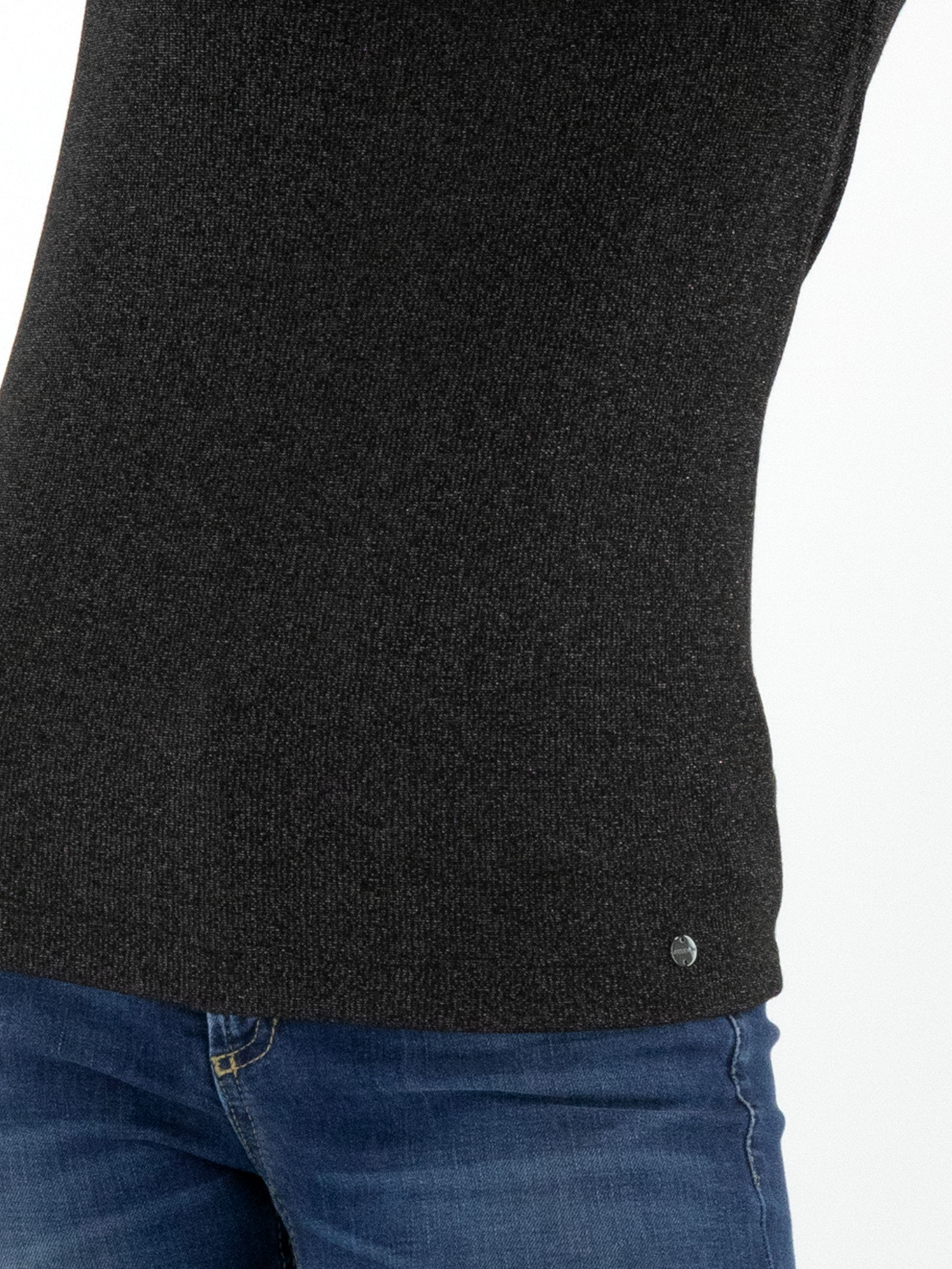 Marc Cain pullover in a fine ribbed structure in anthracite. The fabric is subtly interwoven with silver thread for a refined shimmer. The pullover features a soft draped collar and long sleeves. This pullover can be washed at 30 degrees.