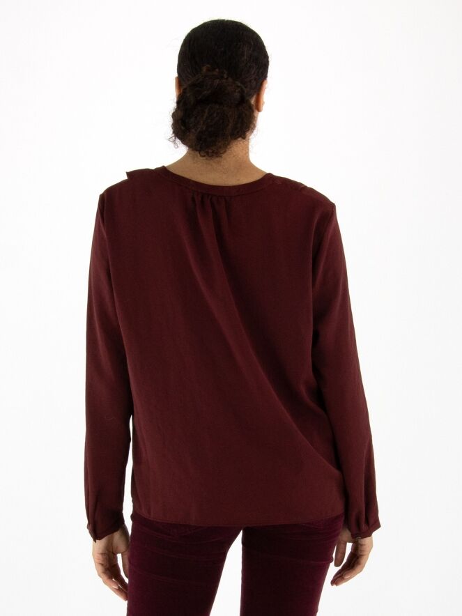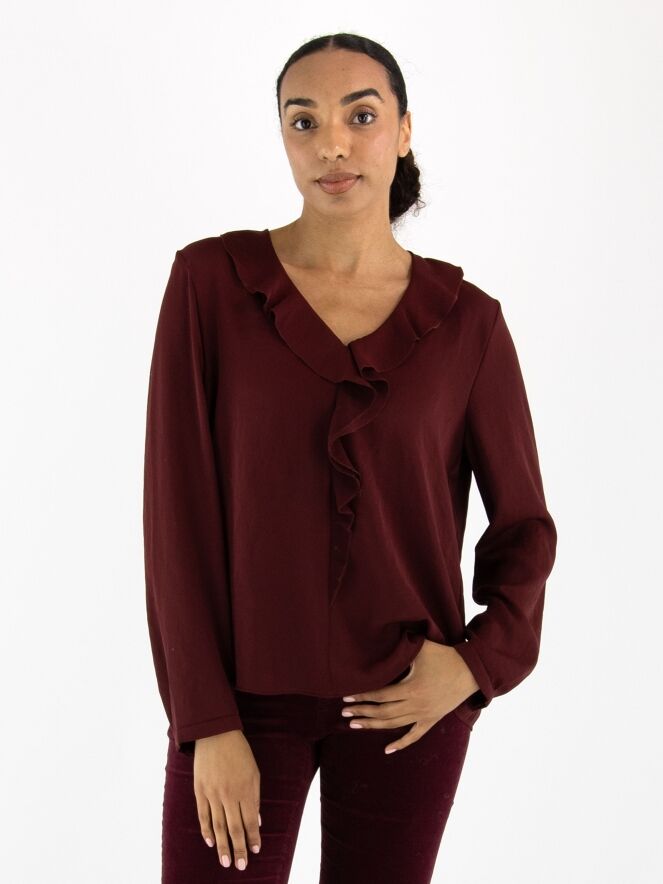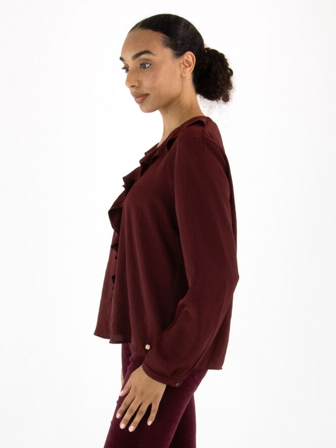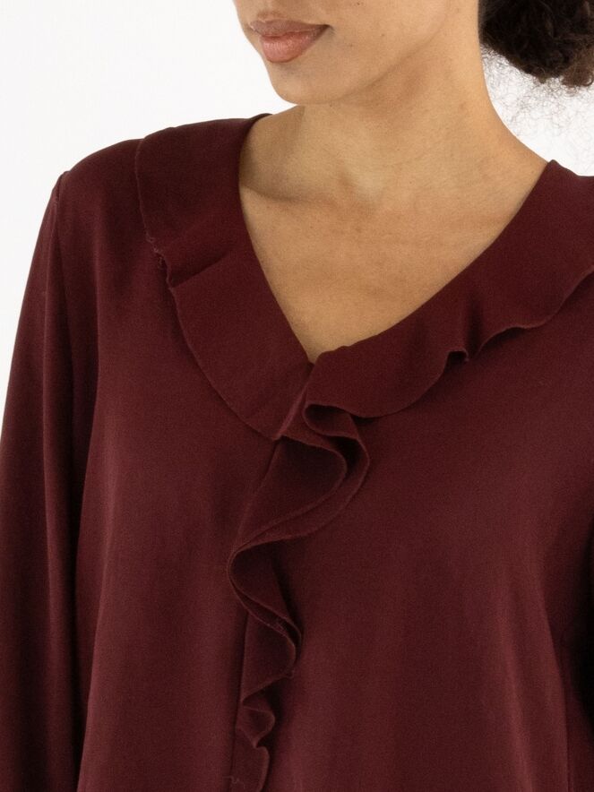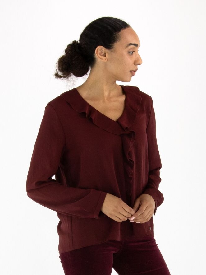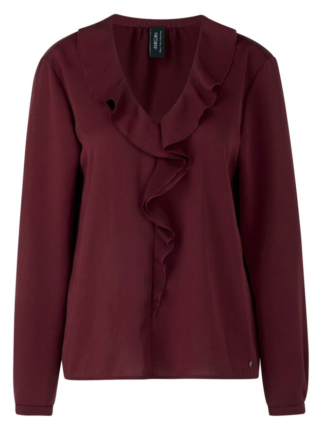 A blouse by Marc Cain in aubergine. It features a wide, wavy collar that extends from the bottom of the V-neckline as a ruffle down to the waist. The long sleeves are finished with cuffs, each with a folded trim and button closure. This blouse can be washed at 30 degrees.