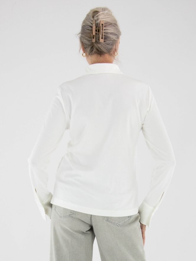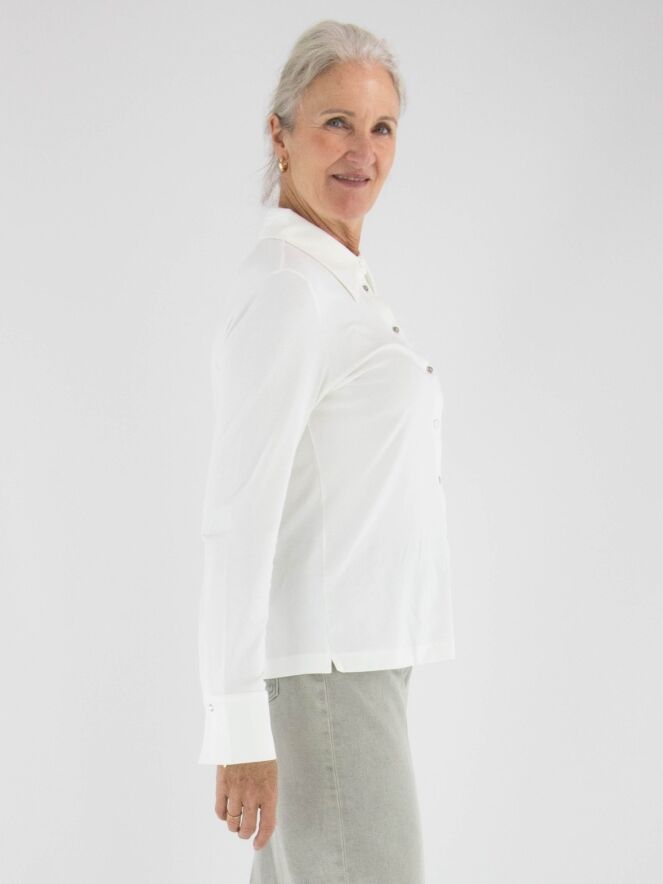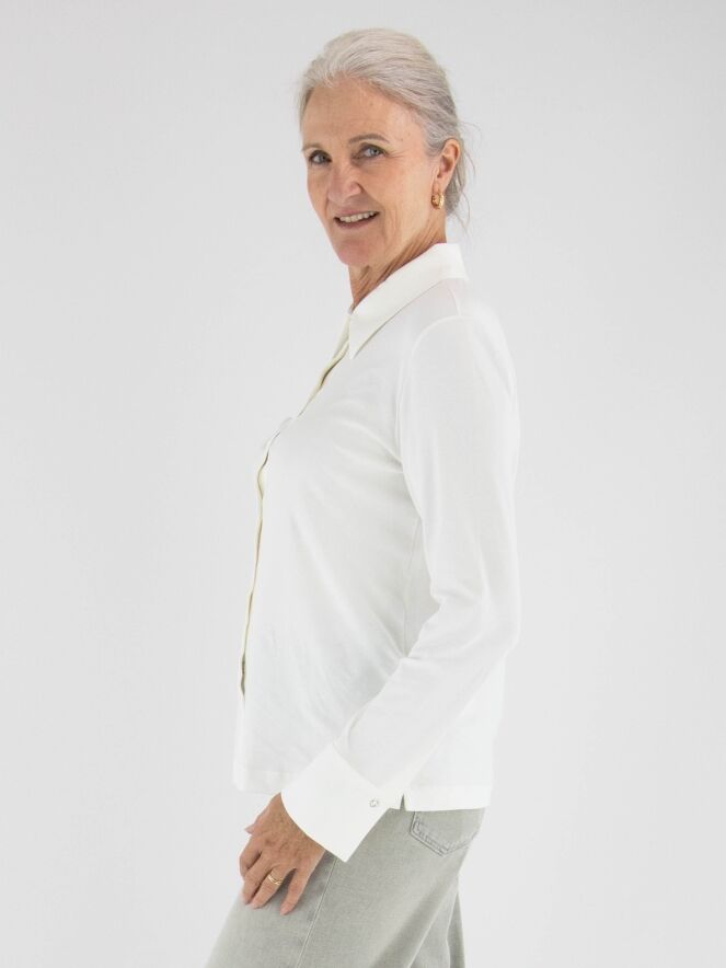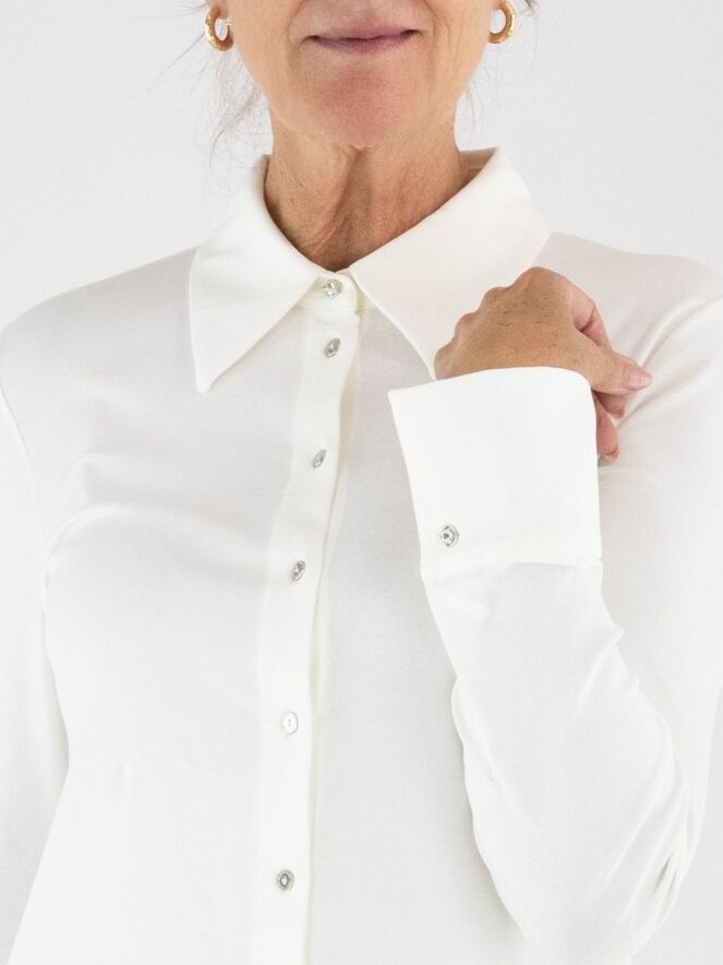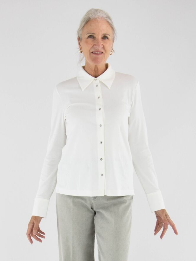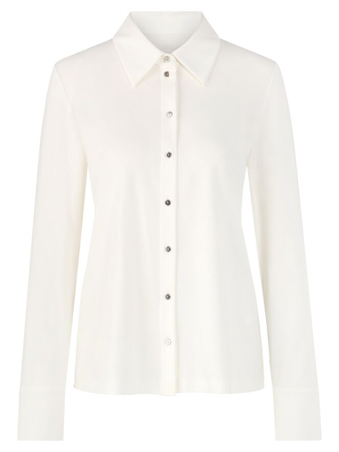 A blouse by Marc Cain in cream white. The fastening is designed with silver-coloured buttons, and the cuffs are finished with a button adorned with a rhinestone. This blouse can be washed at 30 degrees.